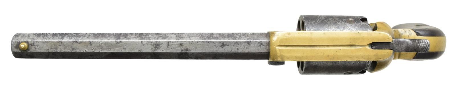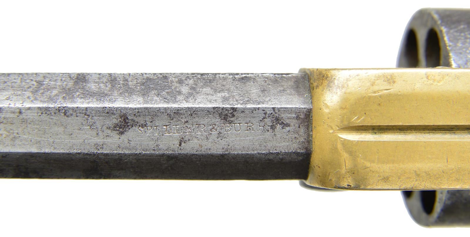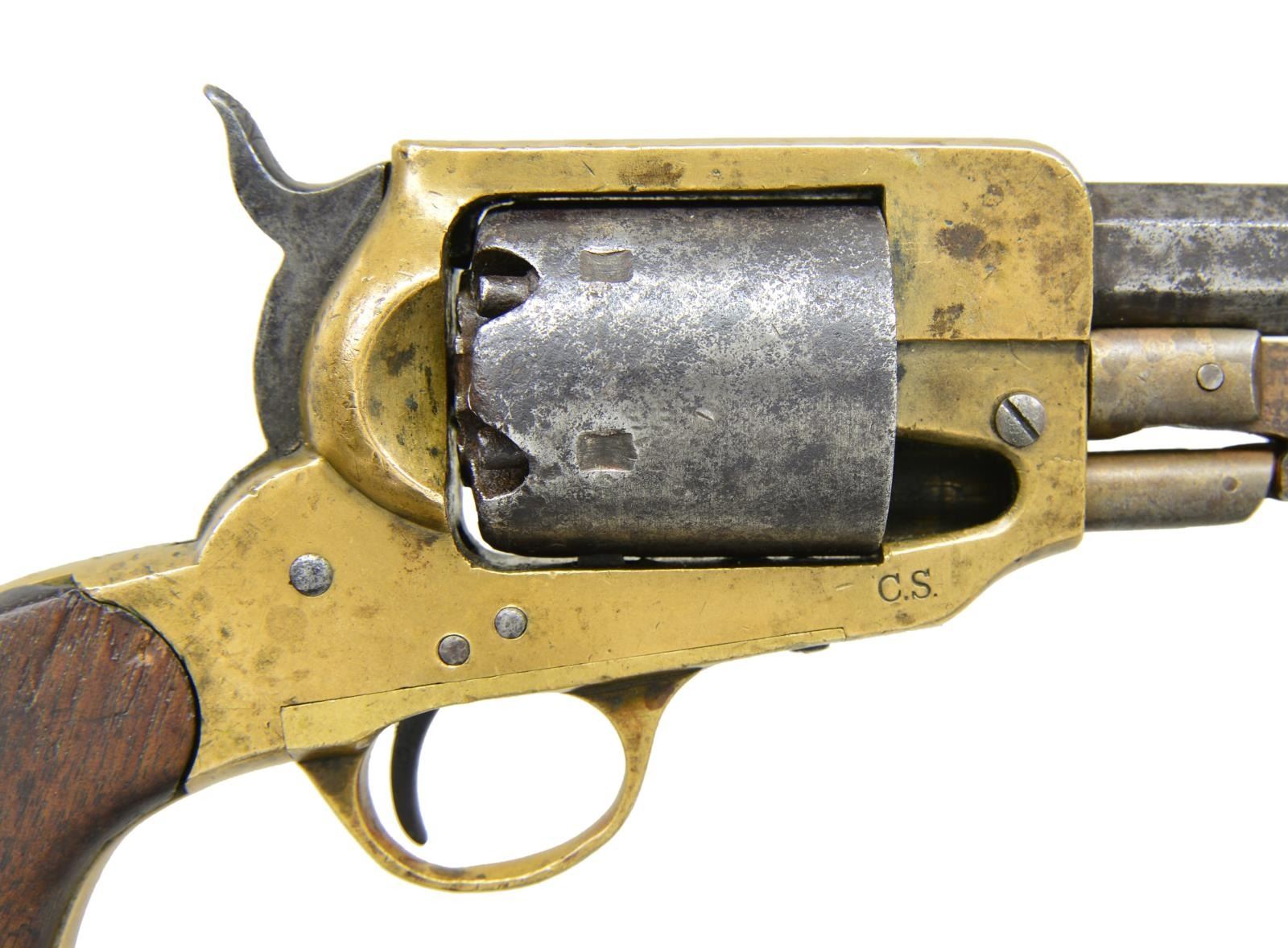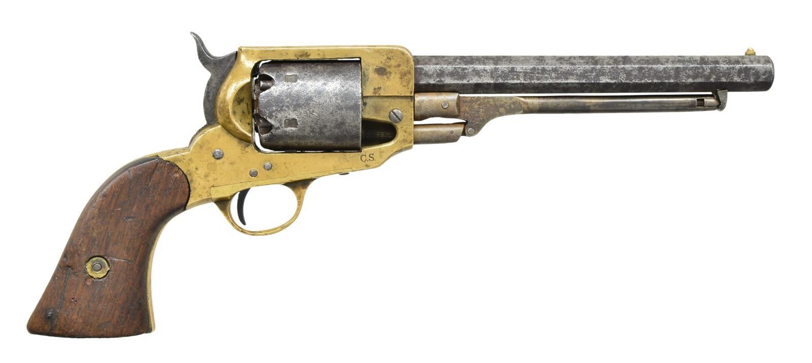 CONDITION: very good overall as restored, barrel and cylinder have mottled iron patina, clear “SPILLER & BURR” marking. Frame shows no warpage as so common on these revolvers, crisp “C.S.” inspection. Grips have hand worn patina, with chips at inside toes, well patinaed gouged out sliver on right side. Loading lever & cylinder pin assembly are replaced from a Whitney. Main spring, handspring and other internal components also restored for good mechanical function. Thumb bolt appears original with replaced screw. Well discerned rifled bore is pitted. Regardless of restoration, this is very attractive “SPILLER & BURR” & “C.S.” marked survivor with major parts original. (01-22809/JS). ANTIQUE. $20,000-25,000.