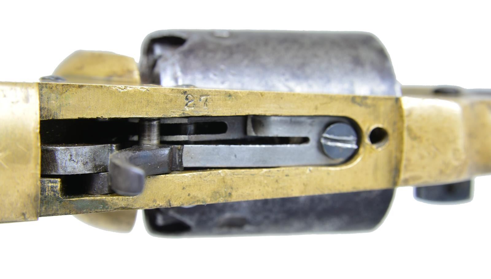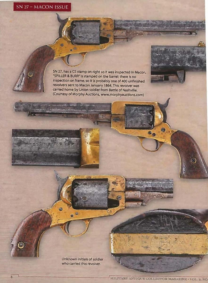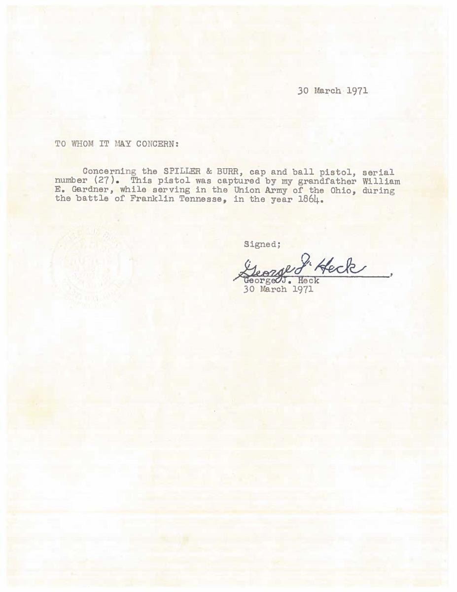 BATTLE OF FRANKLIN, TENNESSEE. Cal. .36. S# 27. Standard configuration for second model Atlanta made revolver, 7” octagonal barrel with large brass cone front sight, “SPILLER & BURR” on top barrel flat. “C.S.” government inspection is found on the right side of frame which denotes Macon, Georgia inspection. Steel cylinders were not available till late June 1864. Among the lowest serial numbers known for Spiller & Burr, “27” is found on barrel, frame, and trigger guard. Featured in “Military Antique Collector Magazine • Vol. 2, No. 2” Spiller & Burr Chronology of Manufacture. UNATTACHED ACCESSORIES: Accompanying 1971 affidavit from George Heck stating revolver captured by his grandfather William E. Gardner at Battle of Franklin, TN 1864. There are pair of crosshatched initials of the Confederate soldier who carried revolver on butt “EF”.