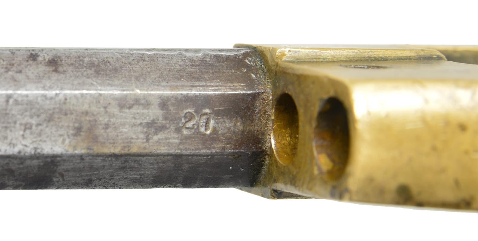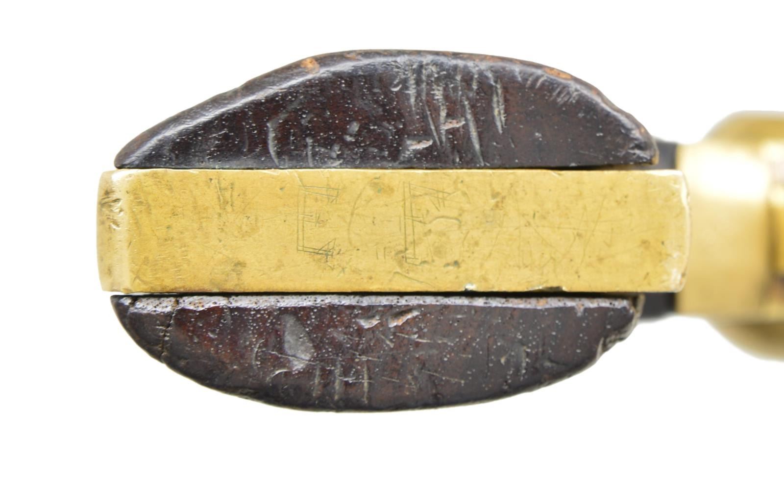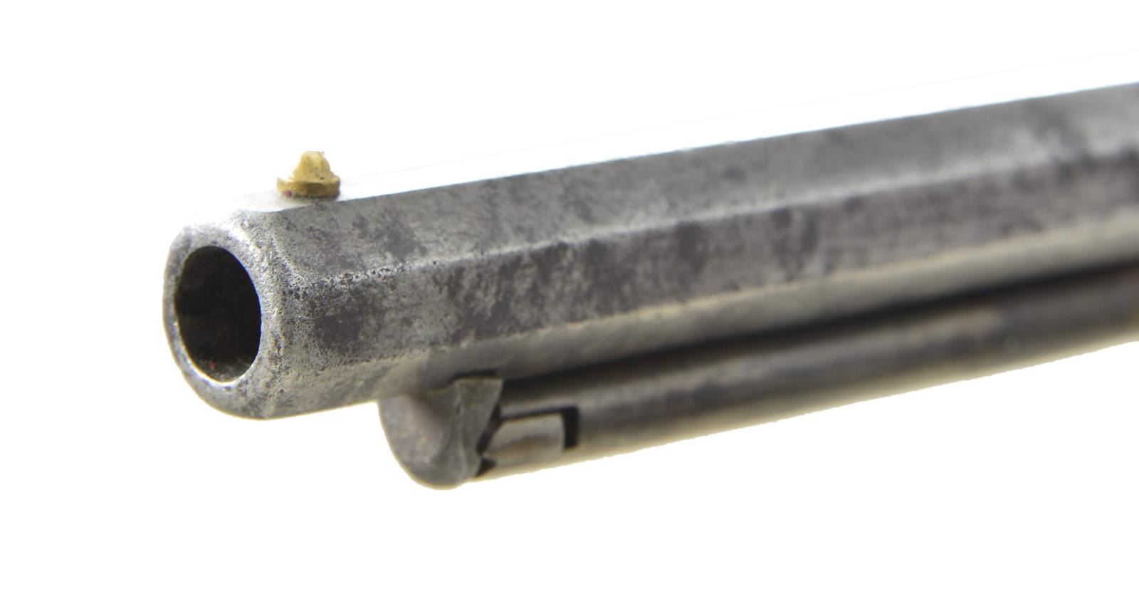 BATTLE OF FRANKLIN, TENNESSEE. Cal. .36. S# 27. Standard configuration for second model Atlanta made revolver, 7” octagonal barrel with large brass cone front sight, “SPILLER & BURR” on top barrel flat. “C.S.” government inspection is found on the right side of frame which denotes Macon, Georgia inspection. Steel cylinders were not available till late June 1864. Among the lowest serial numbers known for Spiller & Burr, “27” is found on barrel, frame, and trigger guard. Featured in “Military Antique Collector Magazine • Vol. 2, No. 2” Spiller & Burr Chronology of Manufacture. UNATTACHED ACCESSORIES: Accompanying 1971 affidavit from George Heck stating revolver captured by his grandfather William E. Gardner at Battle of Franklin, TN 1864. There are pair of crosshatched initials of the Confederate soldier who carried revolver on butt “EF”.