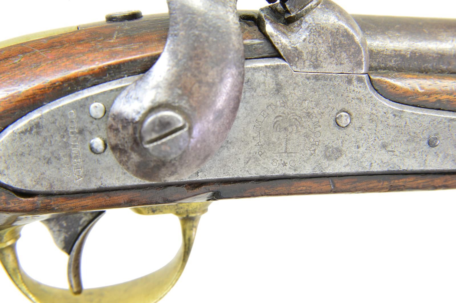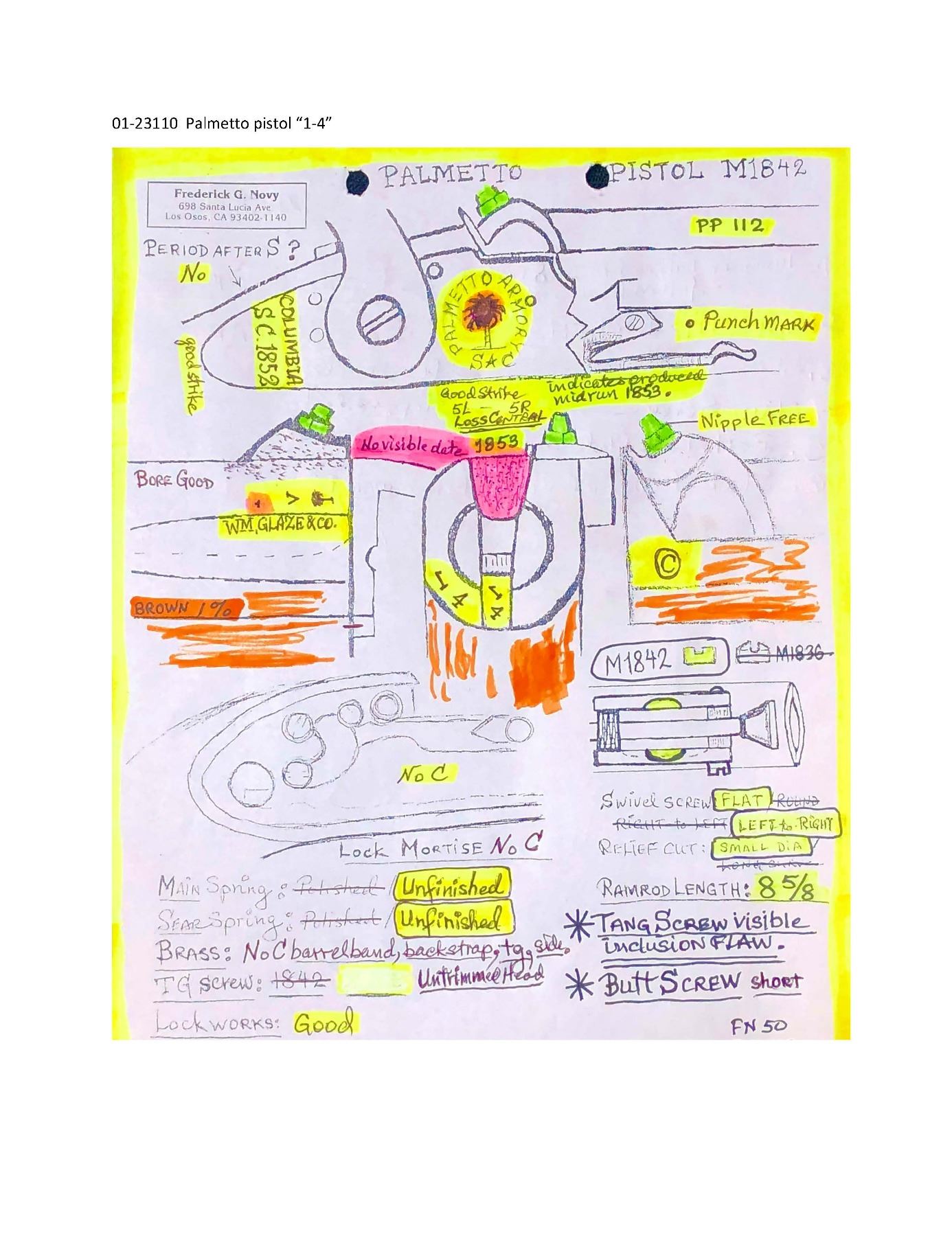 Dr. Fred Novy changed the way we look at Palmetto Armory model 1842 pistols and other Palmetto Armory arms with years of examining museum and private owned examples. No one realized that there is a unique combination of a letter and a number on the barrels internally of every Palmetto pistol. Dr. Novy as of this date has chronicled 116 different original examples, this was #50 in survey and breech markings are “1” (backwards) and “4”. UNATTACHED ACCESSORIES: Dr. Novy's detailed data sheet is included in this lot. CONDITION: very good overall, mottled iron and brass patina, solid stock with scattered cosmetic blemishes. mechanically fine with dark smooth bore. PROVENANCE: Collection Dr. Fred Novy. (01-23110/JS). ANTIQUE. $3,000-4,000.