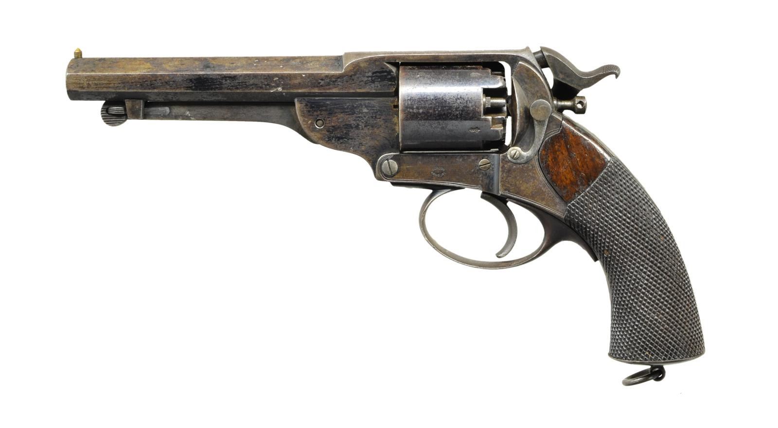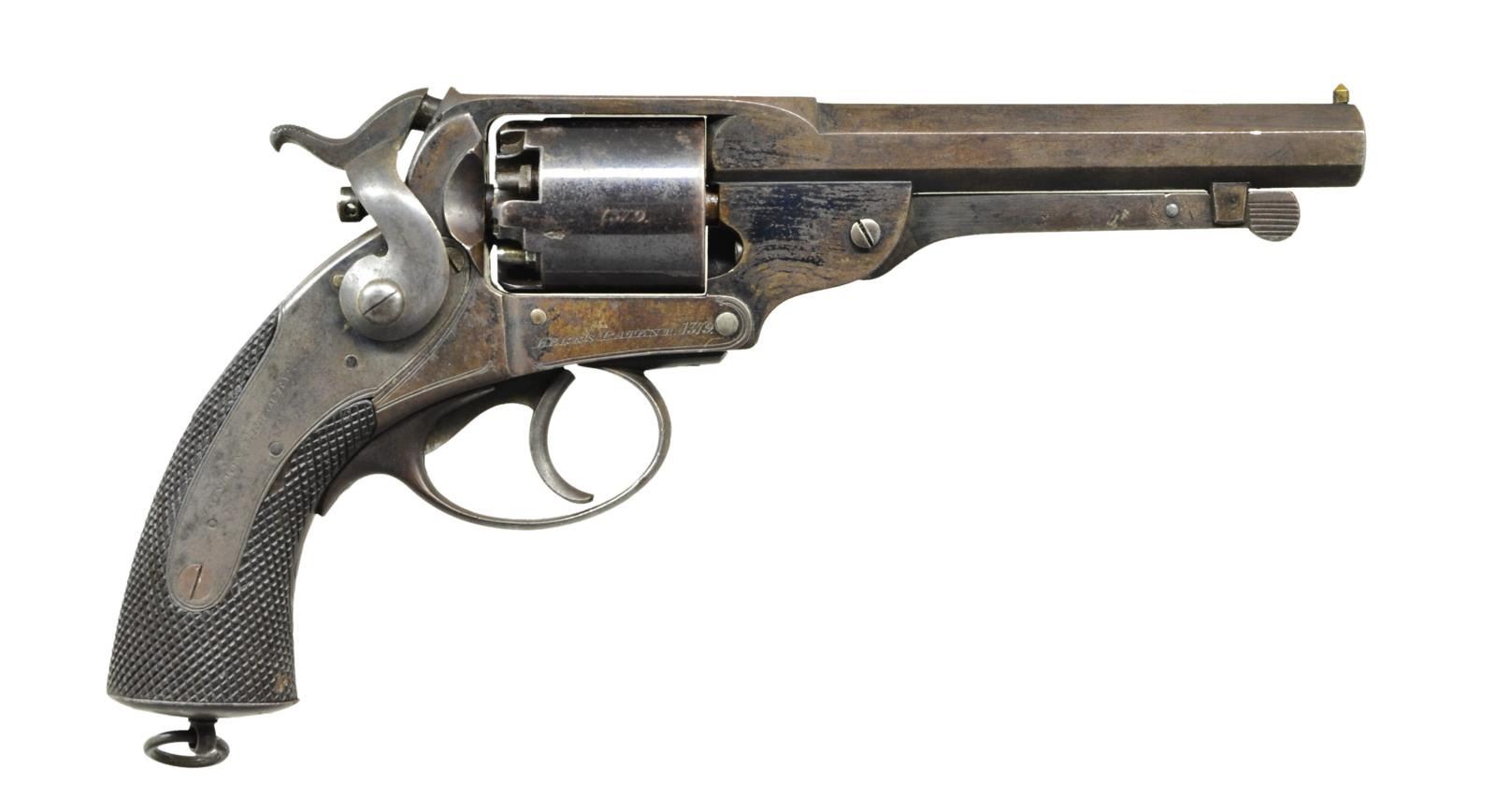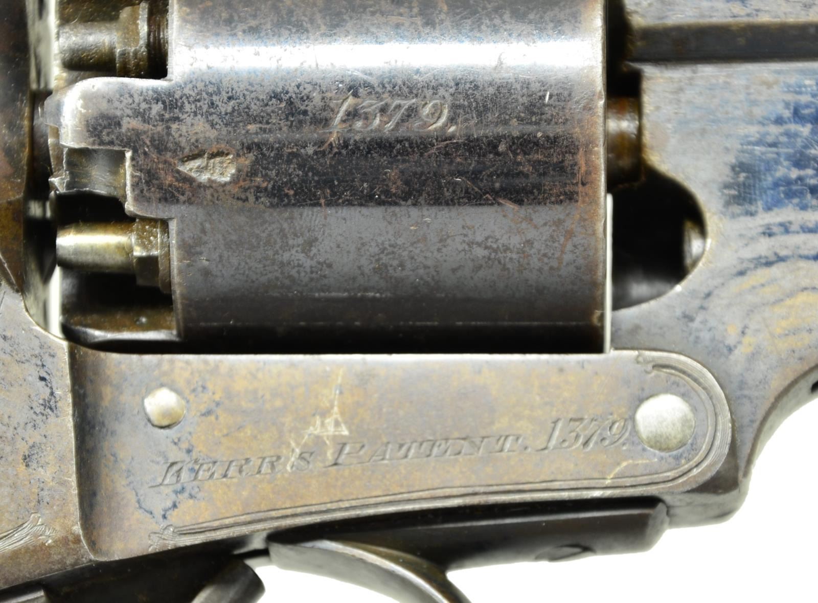 SURVIVOR FROM BATTLE OF SAYLOR'S CREEK. Cal. 54 bore. S# 1379. Bbl. 5.7". This was the most popular Confederate imported revolver. High quality Army revolver was made by the London Armoury Company & so marked on lock & frame. "KERR’S PATENT 1379" stamped on right side of frame. Internally "1101" stamped on frame, top strap, back of cylinder, & inside triggerguard. "JS/Anchor" Confederate inspection stamped on grip under triggerguard. This revolver, Webley wedge-frame S# 3375, and Griswold S# 2041 (sold on these floors 11-8-2021, lot 3002) were from an estate sale near Farmville, VA and all 3 revolvers were "as found". Consignor believes revolvers were retained souvenirs from the last major battle of Civil War, Saylor’s Creek and reason to doubt. Indeed, Farmville is nearest town to last major fight of Lee’s Army just outside Appomattox. This and other two associated revolvers "do whistle Dixie". This revolver is among the earliest serial numbers known on blockade run Kerrs, it is also in very fine condition for a Confederate revolver with fine "as found" surface. CONDITION: very good to fine overall, cylinder retains majority of its original blue finish, frame & barrel retain bright blue in protected areas with balance grungy plum/brown patina. Crisp markings. Grips are well fit, checkering good, hand worn patina, crisp "JS/anchor" marking. Cylinder pin retaining bolt spring has filing and buggered screw. Single action is mechanically functional, bright shiny rifled bore. (01-23283/JS). $4,000-6,000.