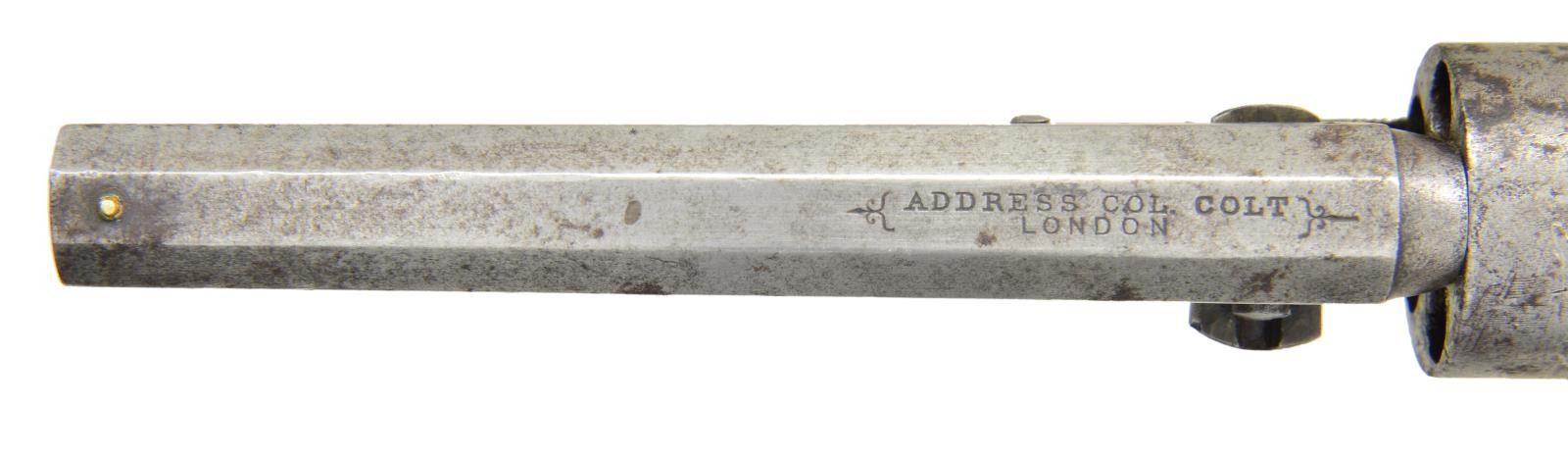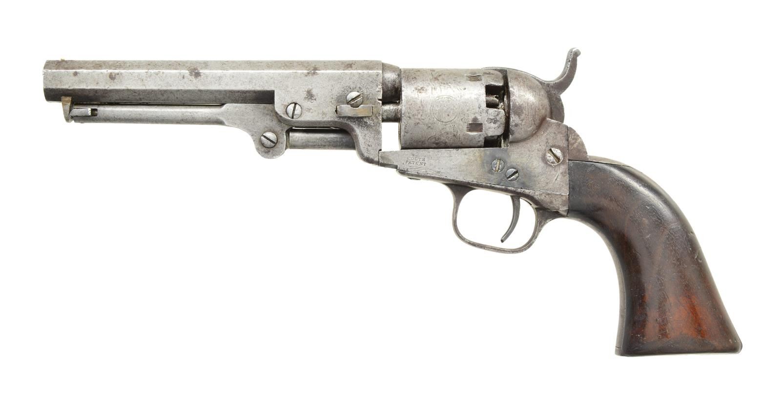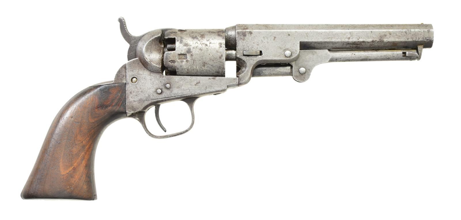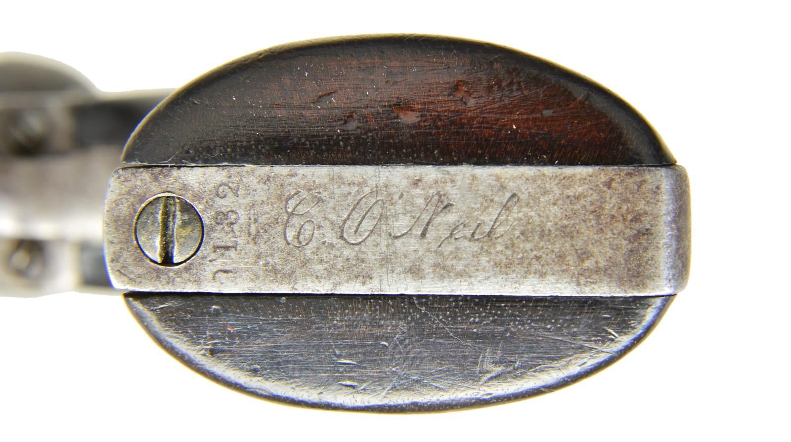 REVOLVER. Cal. 31. S# 9132. Standard configuration, 5" octagonal barrel “ADRESS COL. COLT / LONDON”. Iron trigger guard, and backstrap inscribed on bottom “C. O. Neil”. This revolver was one of the last 2000 pocket models made in London in 1855. There is only one “C. O. Neil” in Civil War database, Corporal Charles O. Neil 49th Illinois Volunteers. CONDITION: very good overall, traces of original blue finish found in protected areas on barrel, All matching serial numbers, Traces of original factory varnish, partial “stagecoach holdup” cylinder scene observed. Mechanically fine, well defined sharp rifled bore with pitting. PROVENANCE: Dr. Fred Novy collection. (01-23113/JS). ANTIQUE. $1,000-2,000.