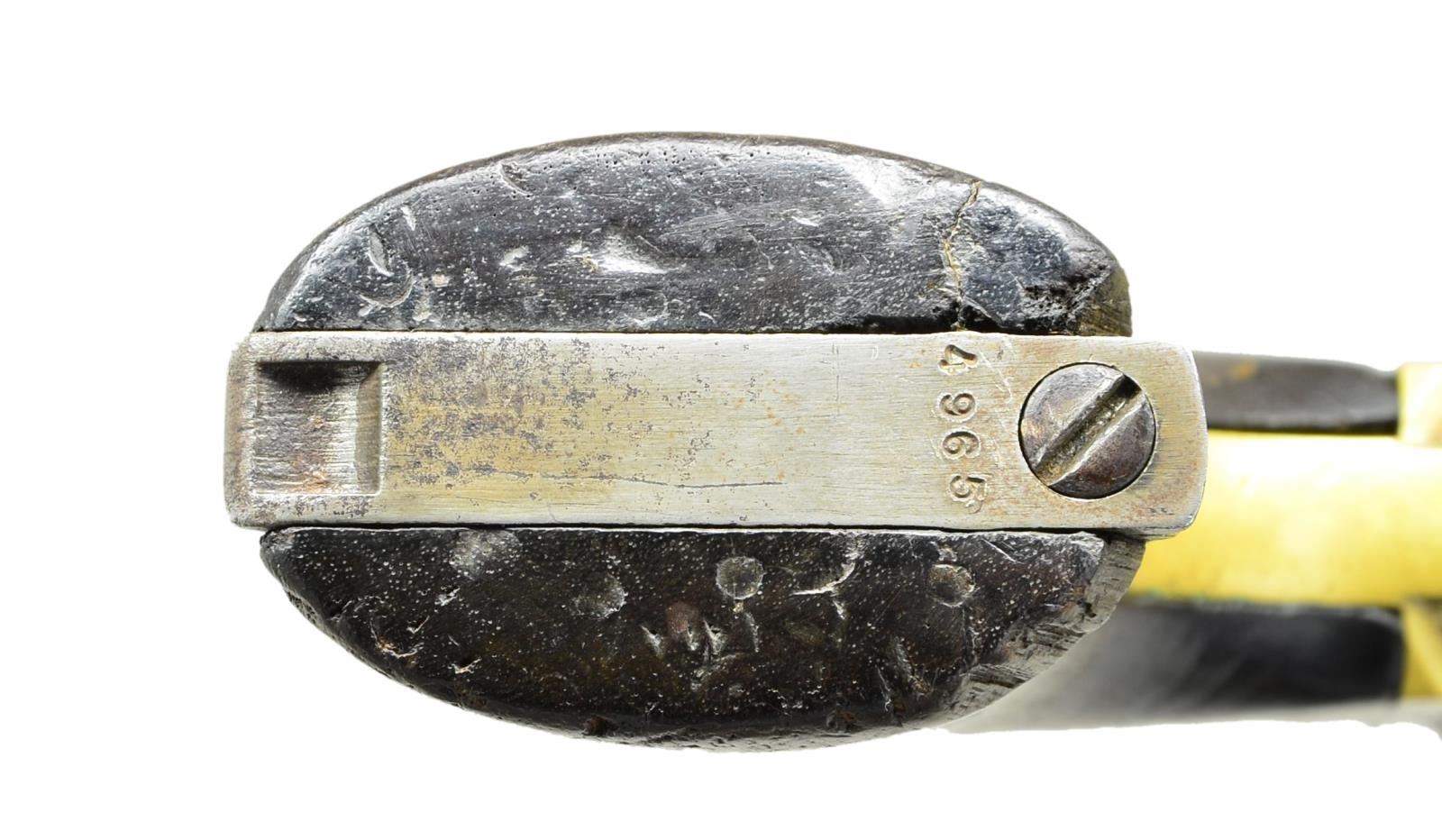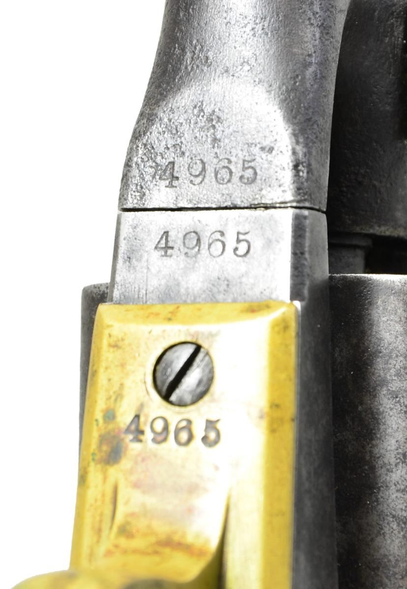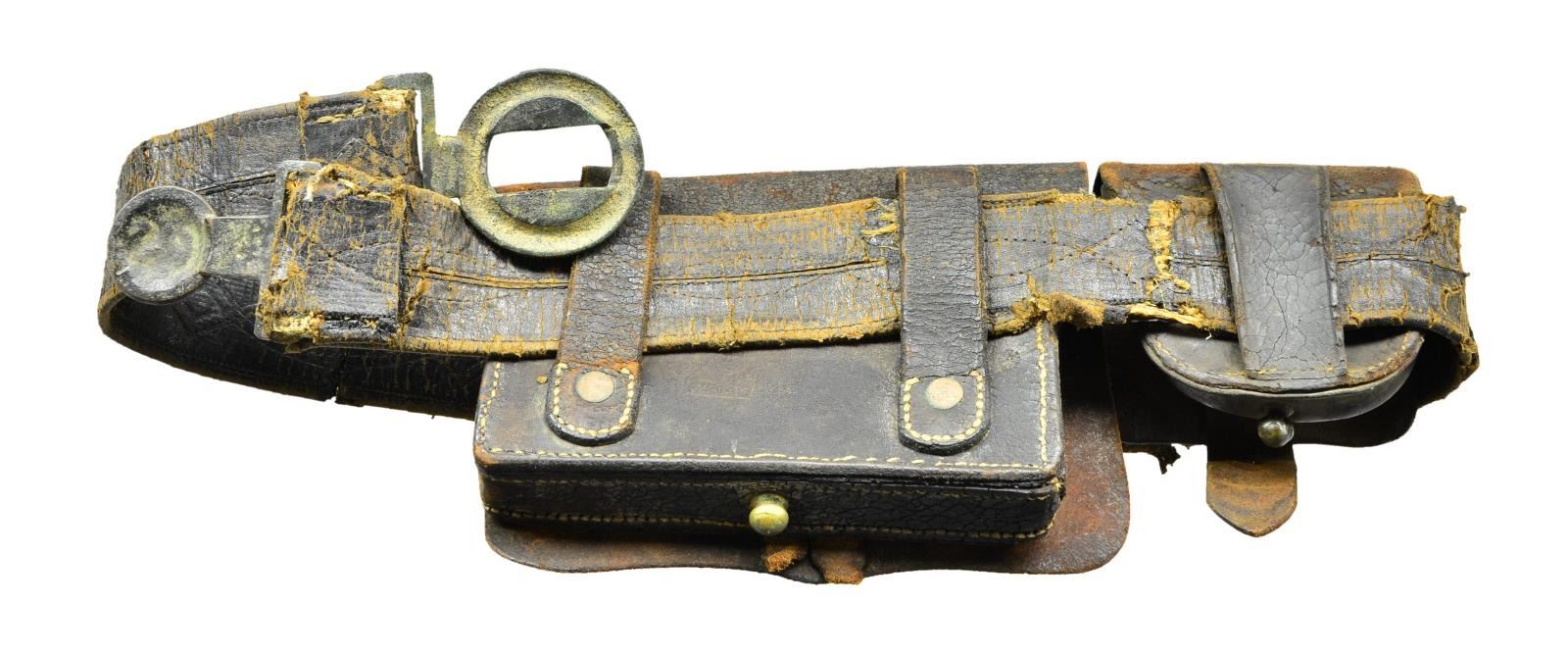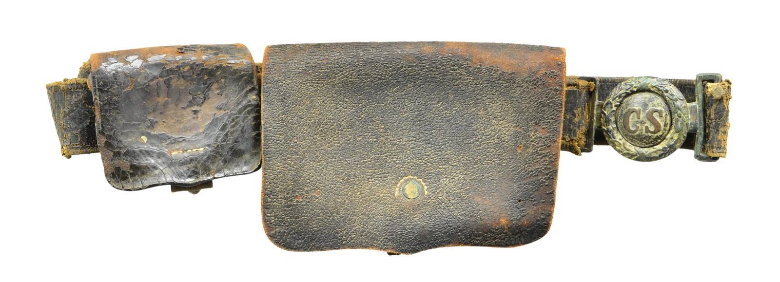CONFEDERATE BELT, HOLSTER & ACCOUTREMENTS. Cal. 44. S# 4965. Bbl. 8". Standard configuration of the Colt 1860 army revolver, 4-screw frame made for shoulder stock, fluted cylinder with patent markings on one flute and S# on back, small "COLT’S / PATENT" left side of frame. One line New York address. Many fluted army revolvers were shipped South. UNATTACHED ACCESSORIES: Civil War era belt with original 2 piece "CS" buckle, Confederate cap box with lead finial, pistol cartridge box. Holster is military style, made from repurposed leather, unusual buckled belt loop. CONDITION: revolver is good, all matching except backstrap which is renumbered, several screws replaced, grips well fit & worn, metal dark iron patina, pitting. Mechanics are fine, good rifled bore. Leather is fair, dry, flaking, resewn seams & tabs, buckle has dark dirty patina. (01-22906/JS). ANTIQUE. $3,000-5,000.