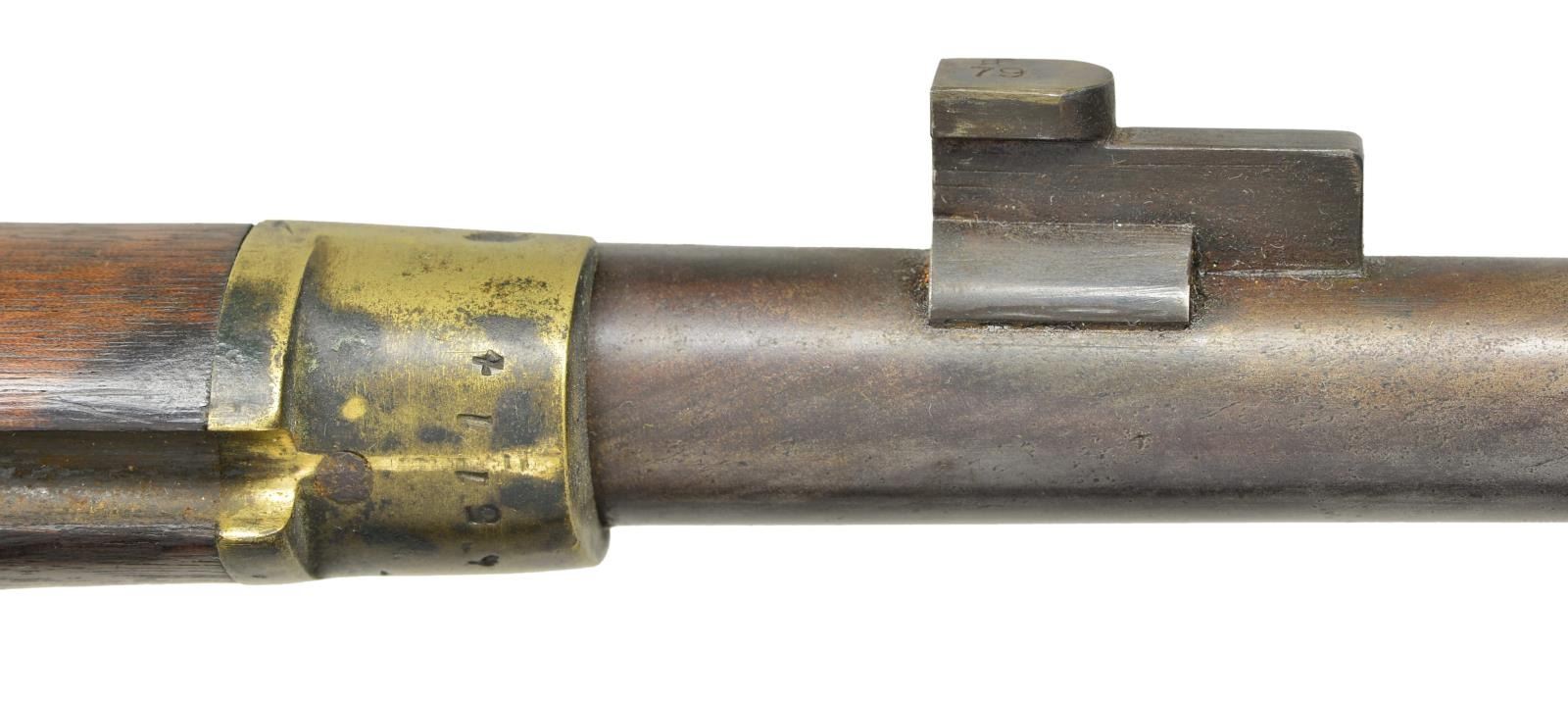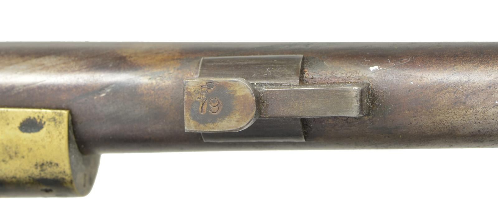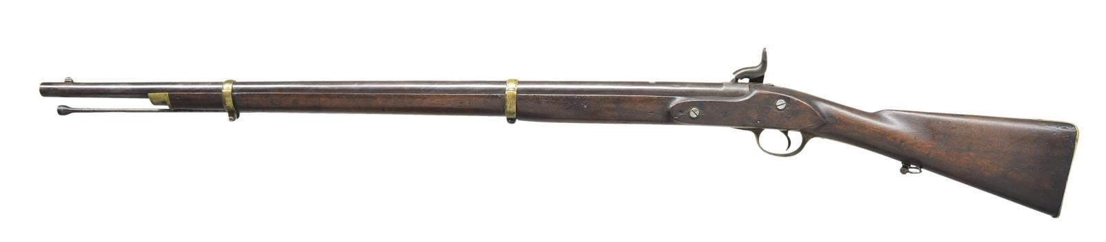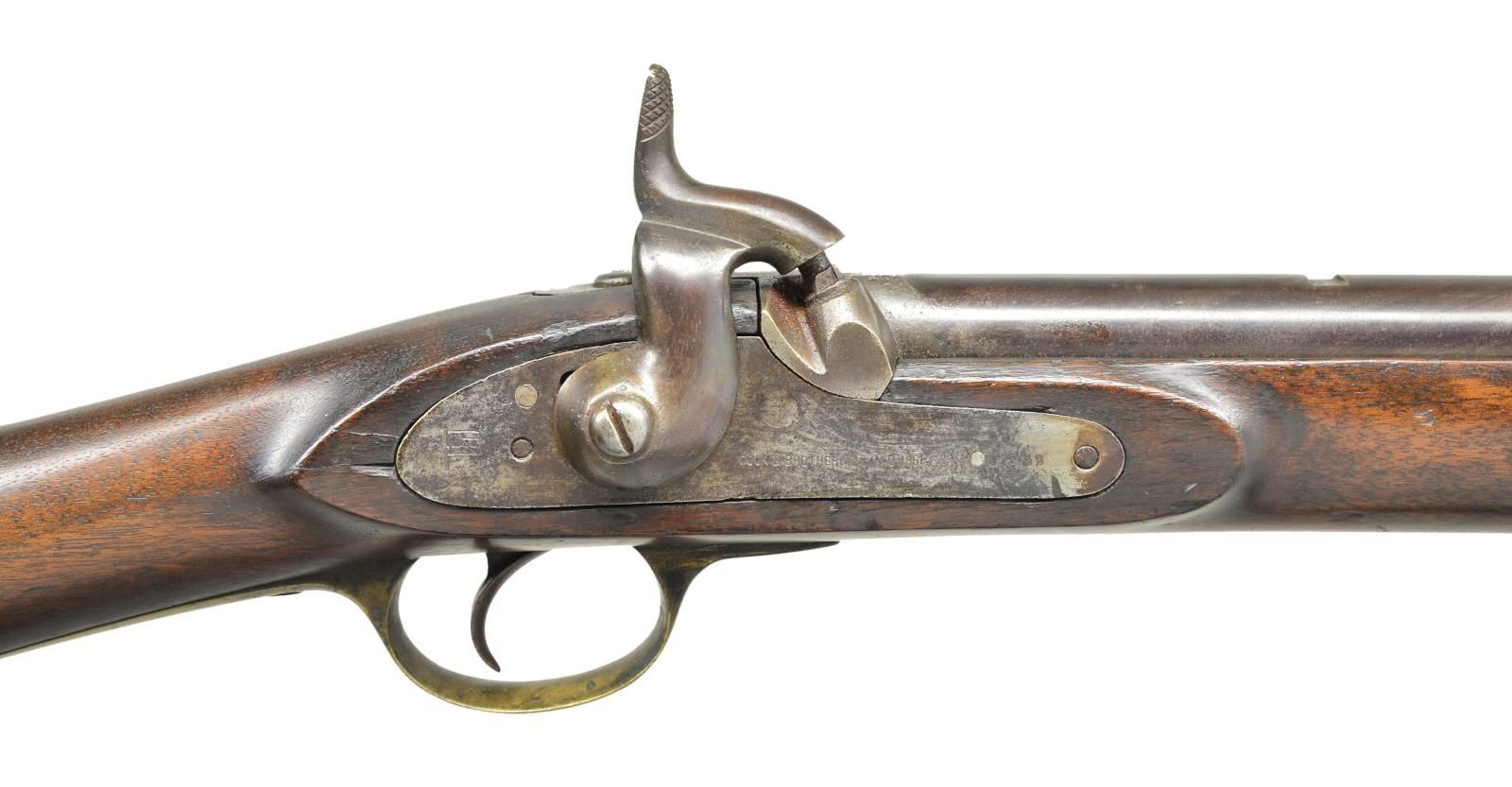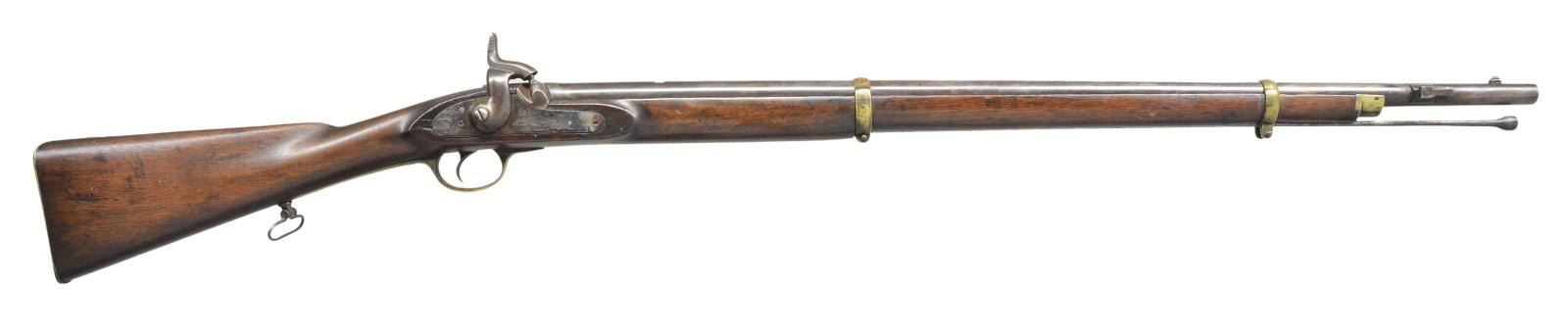 INFANTRY RIFLE. Cal. 58. S#243. A fine New Orleans Cook & Brother rifle representing one of the most highly sought after Confederate long arms. A scant 1,000 were made in all configurations and only a handful of rifles are known among collectors today. This rare Cook & Brother rifle is in standard configuration for a New Orleans produced rifle with a 33” Damascus barrel showing a clearly visible twist on its surface. It has an attached lug for a saber bayonet and the rear sight missing. No discernible marks are seen on the barrel except internal “P79” assembly marks on the barrel as well as the breech plug. Lock plate is marked "COOK & BROTHER, N.O. 1861" and a Confederate First National flag is stamped behind the hammer. All brass furniture, including the New Orleans style 2-piece trigger guard. Barrel bands appear to be original Cook & Brother bands, but are not matching. Nose cap is serial numbered 5114 and front band is serial numbered 4915. The rear band is not numbered, which is often seen on some New Orleans made guns. Cook & Brother Manufacturing was a short-lived enterprise in New Orleans as the city fell to Union forces early in 1862, and the production machinery was moved to Athens, GA where the bulk of arms production occurred. Cook & Brother rifles are visually attractive weapons, but they did not hold up well in the field as many parts & pieces of these guns are scattered relic finds on early battlefields. Complete all matching examples are almost impossible to find. This example was likely missing parts when discovered and has been painstakingly fully restored using original Cook & Brother parts. CONDITION: very good overall. Barrel is especially nice showing little pitting at the breach with smooth gray/plum patina. Lock has mottled gray patina with very good markings. Braised bayonet stud is a restoration, as is the rear sling swivel & lock screws. The front sling swivel is missing. All brass parts have a pleasing mustard patina. Rifle is mechanically functional and has a discernible rifled bore. (01-22072/BF). $20,000-25,000.