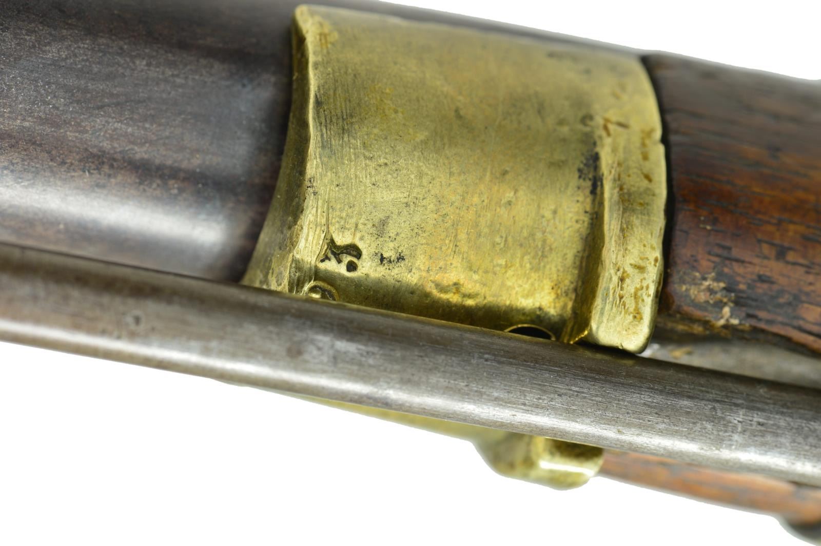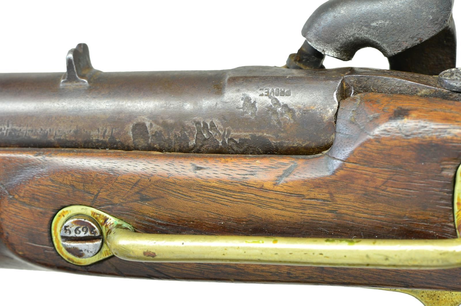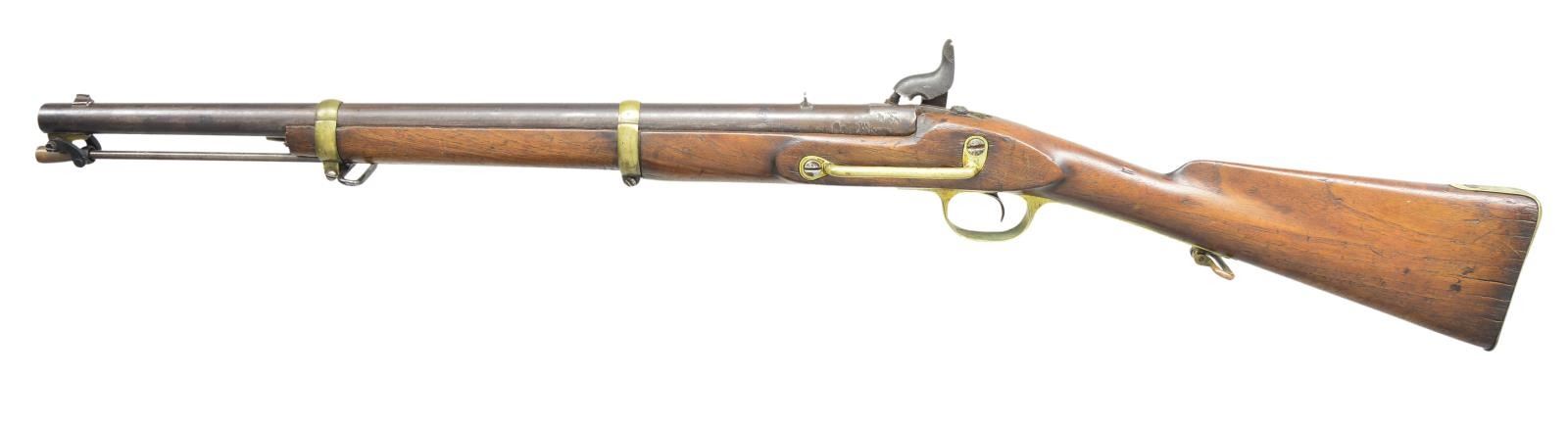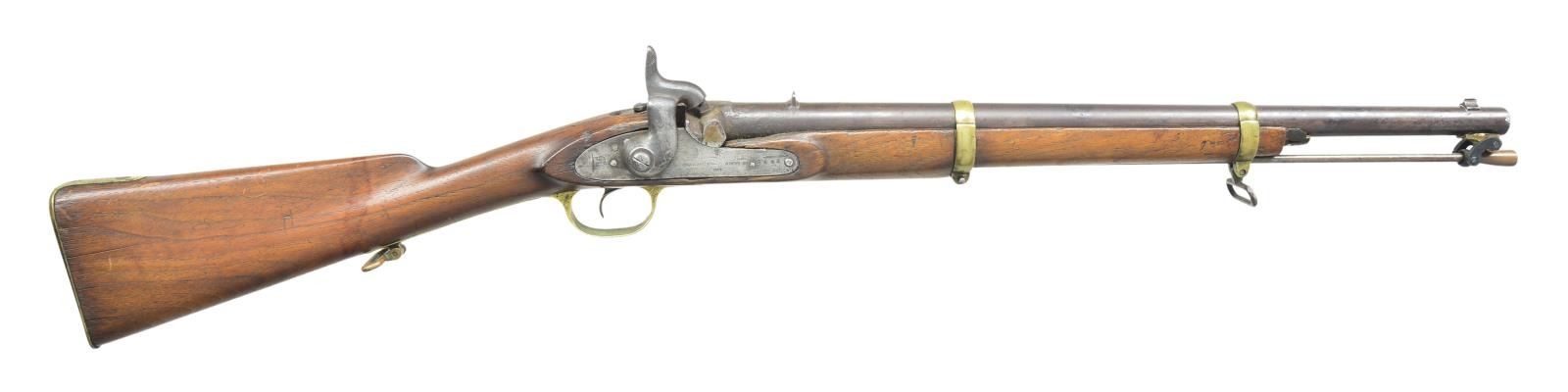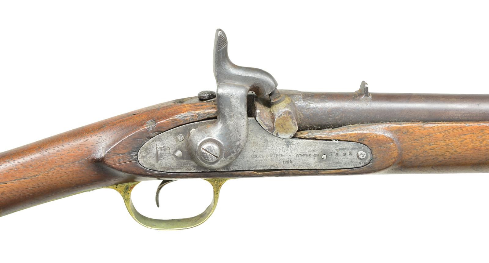 RING CARBINE. Cal. 58. S#5692. This carbine has a standard configuration for an 1864 dated example. It has a 21" barrel with fixed sights made for a captive ramrod loading assembly now missing. Lock stamped "COOK & BROTHER" / "ATHENS GA" / "1864" and with a Confederate First National flag stamped behind the hammer, which is unique Cook & Brother feature. Matching serial numbers “5693” are found on both barrel bands, lock screws, tang screw & nose cap. The serial number is not visible on the barrel due to pitting at breech. Damascus twist barrel can be clearly discerned. All brass furniture, including saddle ring bar. CONDITION: very good overall with original all matching parts, with the exception of the restored sling swivels and replacement ramrod assembly that has become detached. The stock is weathered at the butt, but sound with burnout around bolster and discernible Westcomb Hudgin “WH” script inspector’s cartouche. Brass cleaned and toned to a light mustard patina. Mechanically fine with a well-defined rifle bore showing notable oxidation. (01-22074/BF). $18,000-22,000.