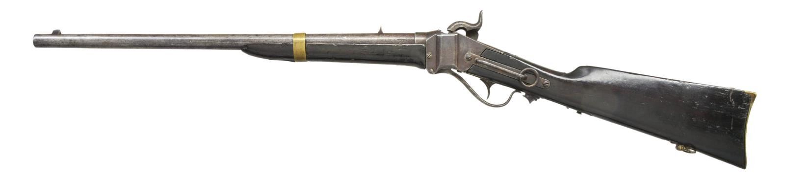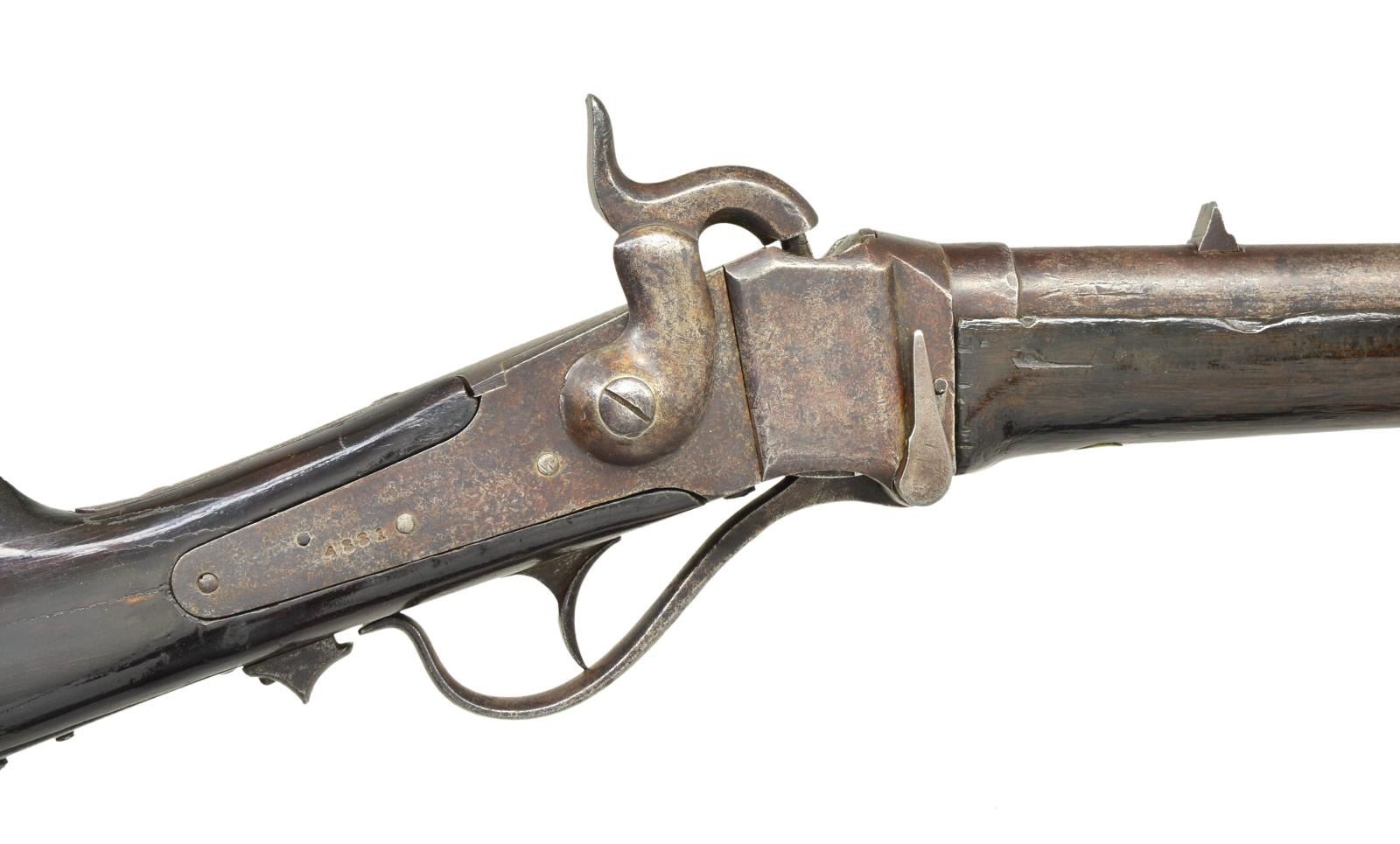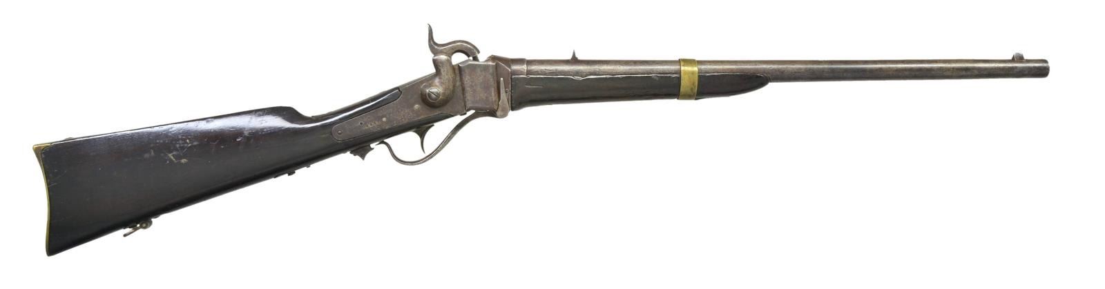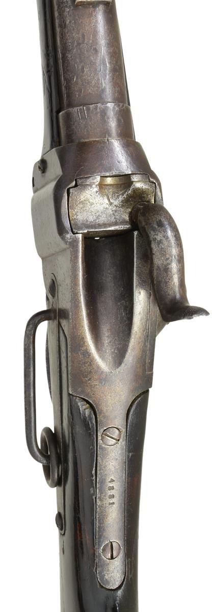 CARBINE. Cal. 52. S#4881. Confederate Sharps carbines were originally made in Richmond by SC Robinson & Company. The Confederate government bought the factory in March 1863 and continued production without Robinson’s markings. Serial number range for Richmond Armory produced guns stops about SN 5000, so this is among the last carbines made in 1864. Most all saw hard use in the field and this is honest survivor. Carbines were brass mounted including the forestock screw escutcheon. Matching SNs are found on lock and breech tang and on bottom of barrel. Top of barrel rear of fixed sight stamped “RICHMOND VA” which only 2 letters are still visible. CONDITION: good overall, appears original and complete, correct Confederate breechblock is unmarked, mottled iron and brass patinas, buttstock has crack repair and both stocks heavily varnished. Mechanically fine with well defined rifled bore. (01-22907/JS). $5,000-7,000.