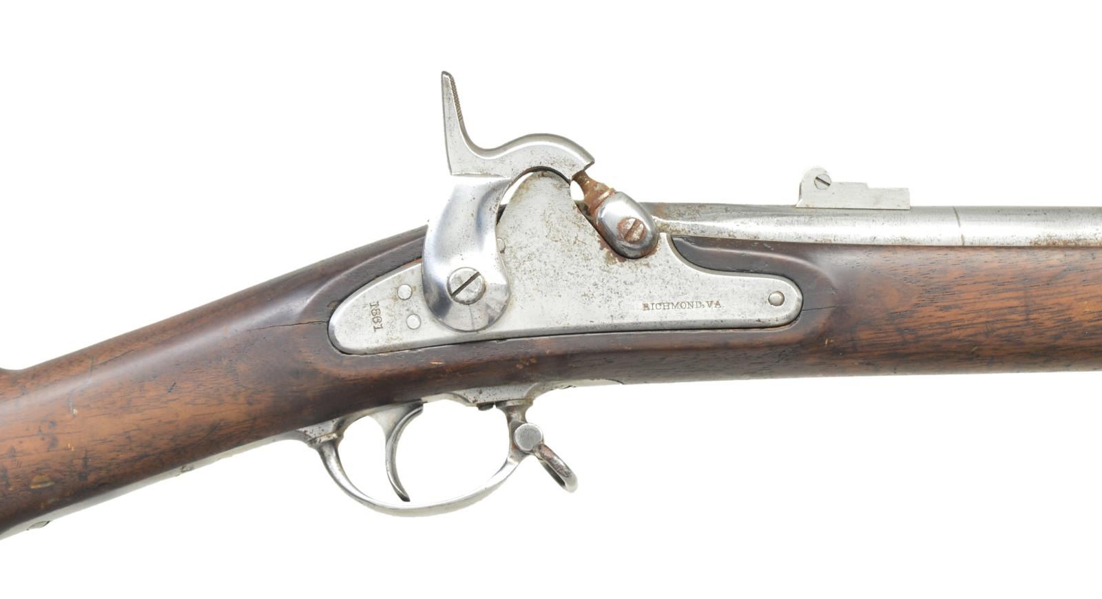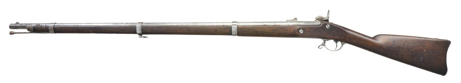 MUSKET. Cal. 60. NSN. 39-1/2" bbl. Rare early 1861 musket inspected “SA” from captured Harper’s ferry parts. Lock marked “RICHMOND, VA” without “CS” before central government took over armory. Standard configuration 55” overall, Barrel slightly short 39.5” and .60 caliber smoothbore. No markings on barrel bands and no US surcharge on buttplate, Iron toolbox, iron nosecap from last production Harpers Ferry 1855 production. CONDITION: good very good overall, appears all original and complete including sling swivels & swelled ramrod, later rear sight probably added. Lock markings are crisp, “VP” And eaglehead proofs are partially discernible. Script “SA” in rectangular cartouche is very light but discernible. Soldier’s initials “JSR” left buttstock, putty inset repair left of barrel tang. Iron furniture all polished bright, areas of rust and pitting. Mechanics are fine, clear smooth bore. PROVENANCE: From the Lifelong Collection of Glen E. Mattox. (01-22571/JS). $3,000-4,000.