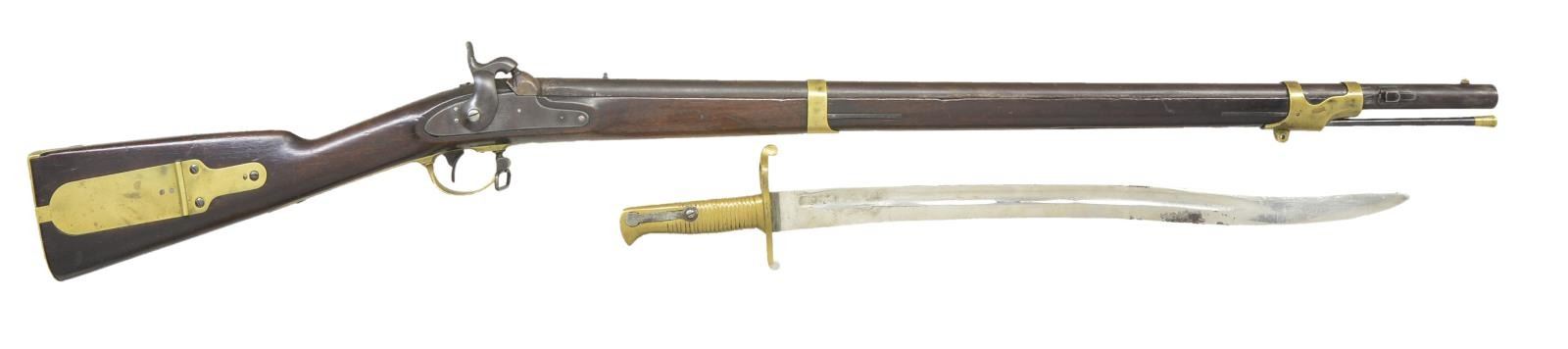BROTHER NEW ORLEANS SABER BAYONET. Cal. 54. NSN. In 1860 Watervliet arsenal in New York shipped 10,000 Model 1841 Mississippi rifles to five southern federal armories, 6000 of these were Robbins & Lawrence. Prior to 1860, 9300 Mississippi rifles had already been issued to the nine states which would form the Confederacy. Howard Madaus & John Murphy show many different alterations. This alteration possibly by Cook & Brother in New Orleans utilizes a soldered bayonet lug on right side of barrel that attaches the unserialized Cook & Brother saber bayonet. Cook & Brother made rifles that had matching serial numbers on fitted bayonets. Other than the Confederate saber bayonet alteration, this is a standard configuration Model 1841 Mississippi rifle made by Robbins & Lawrence in 1848, “US” surcharge with two inspection cartouches as would be expected coming from a Southern federal armory. CONDITION: good to very good overall, appears complete and matching with exception of missing front sling swivel. Barrel and lock have overall dark plum patina, with pitting & several gashes at breech. The accompanying Cook & Brother’s 22" yatagan blade is hard metal plated, Brass has light to medium mustard patina, locking spring functional, fits muzzle and lug with slight looseness. Action is functional with well defined 7 groove dark rifling. PROVENANCE: Dr. Fred Novy collection. (01-23112/JS). ANTIQUE. $4,000-5,000.