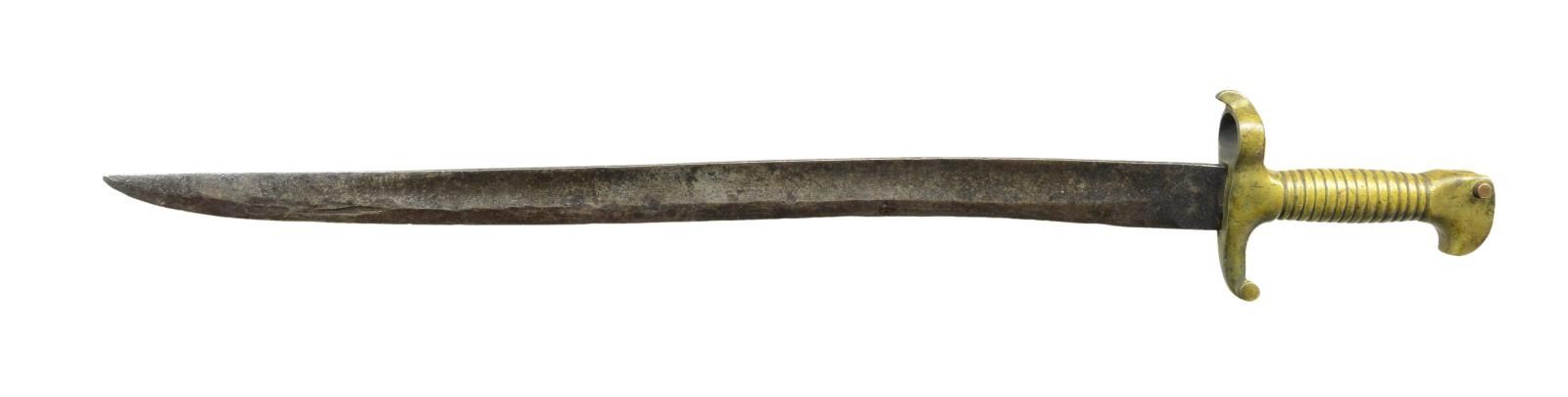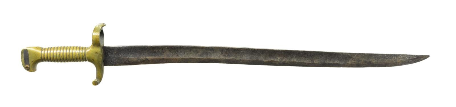 24.5” overall, 19.5” blade, classic B&G design of hollow cast ribbed handle, bird’ s head pommel. Made to attach to B&G adaptor that could fit variety of Confederate used rifles. CONDITION: good overall, gray blade, iron patina, old sharpening, restored locking bolt. (02-19085/JS). $1,500-2,000.