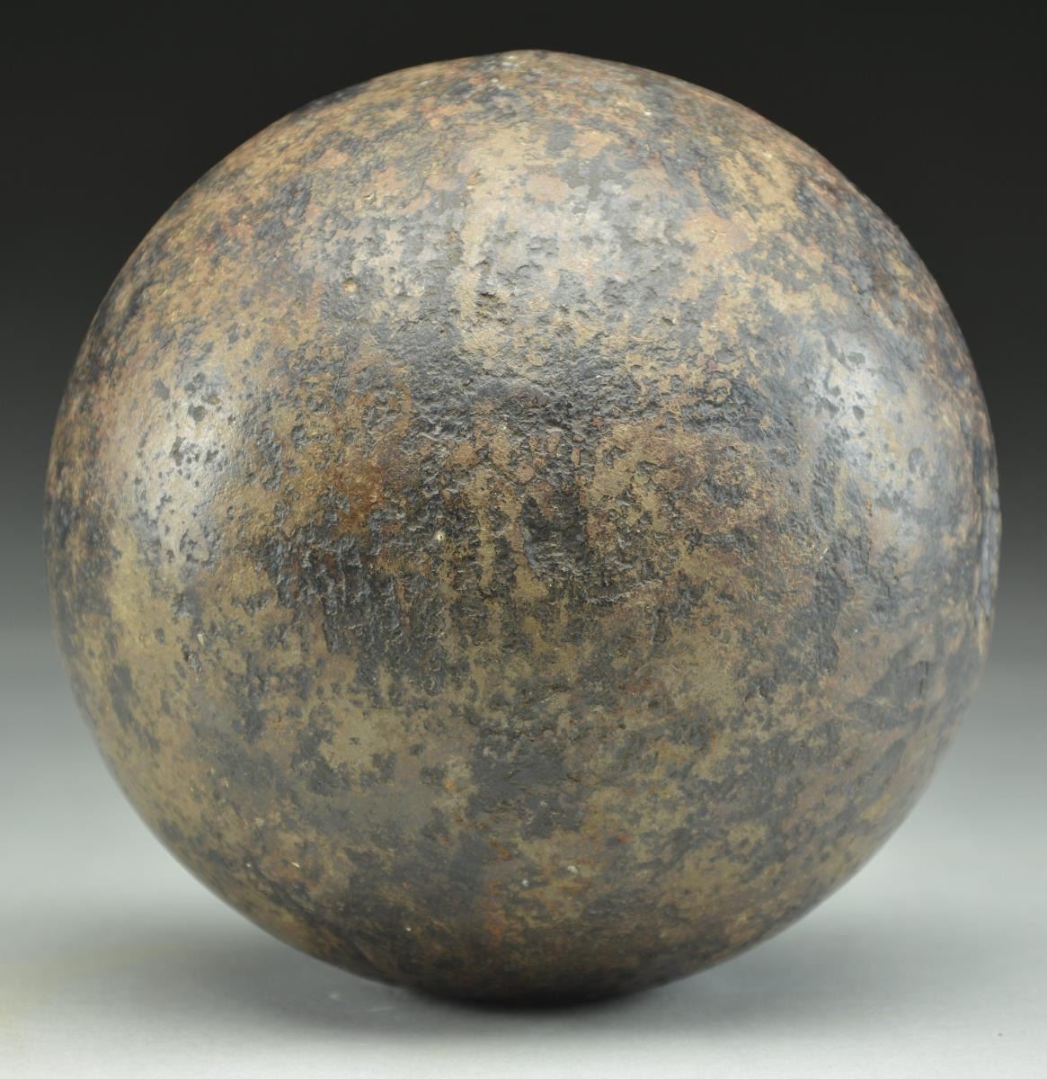 SHOT CANNONBALL. This early Revolutionary War era 24lb. cannonball has a bold broad arrow mark. The solid shot ball is approx. 5.82” in diameter. CONDITION: ball has been kindly cleaned and has a dark brown-black patina. Broad arrow is quite evident. (02-19569/BF). $600-900.