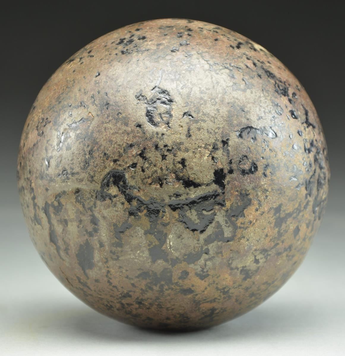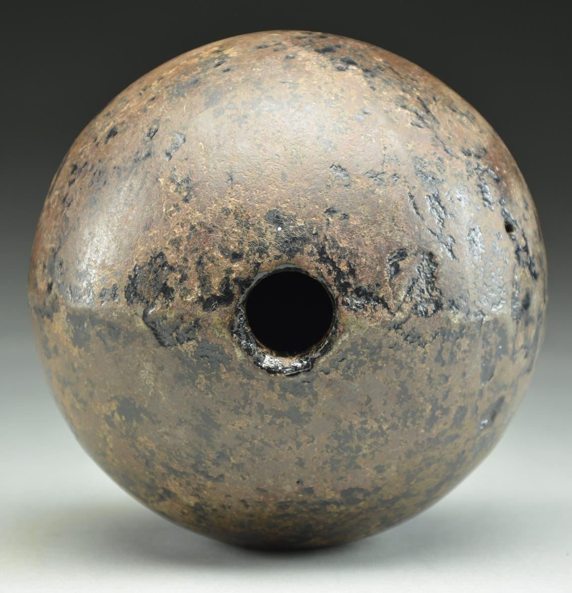 This early Revolutionary War era 24lb. cannonball is hollow to accept an explosive charge. The hollow ball is approx. 5.82” in diameter. The opening is nearly 1” in diameter. CONDITION: ball has been gently cleaned and has a dark brown-black patina. (02-19571/BF). $400-600.