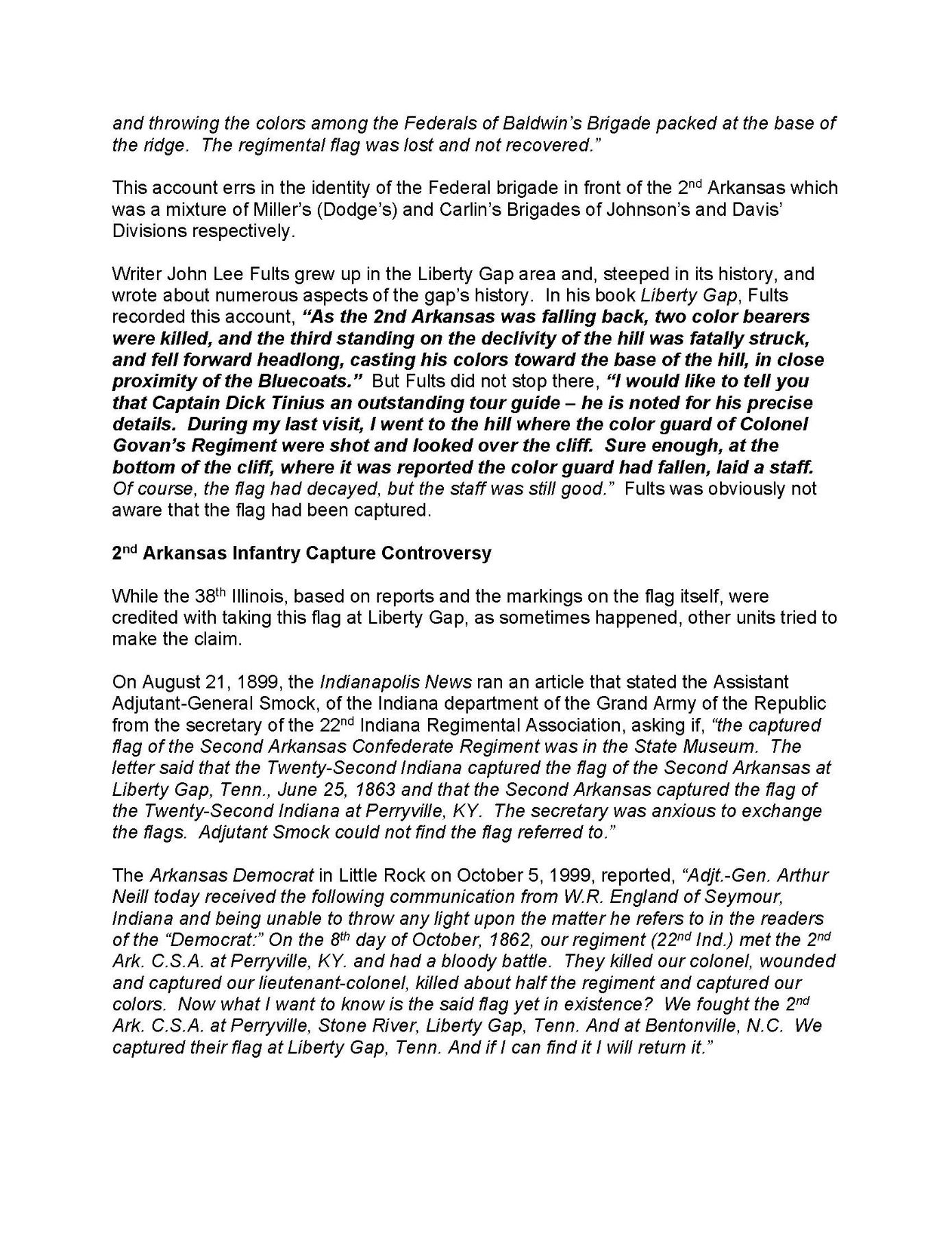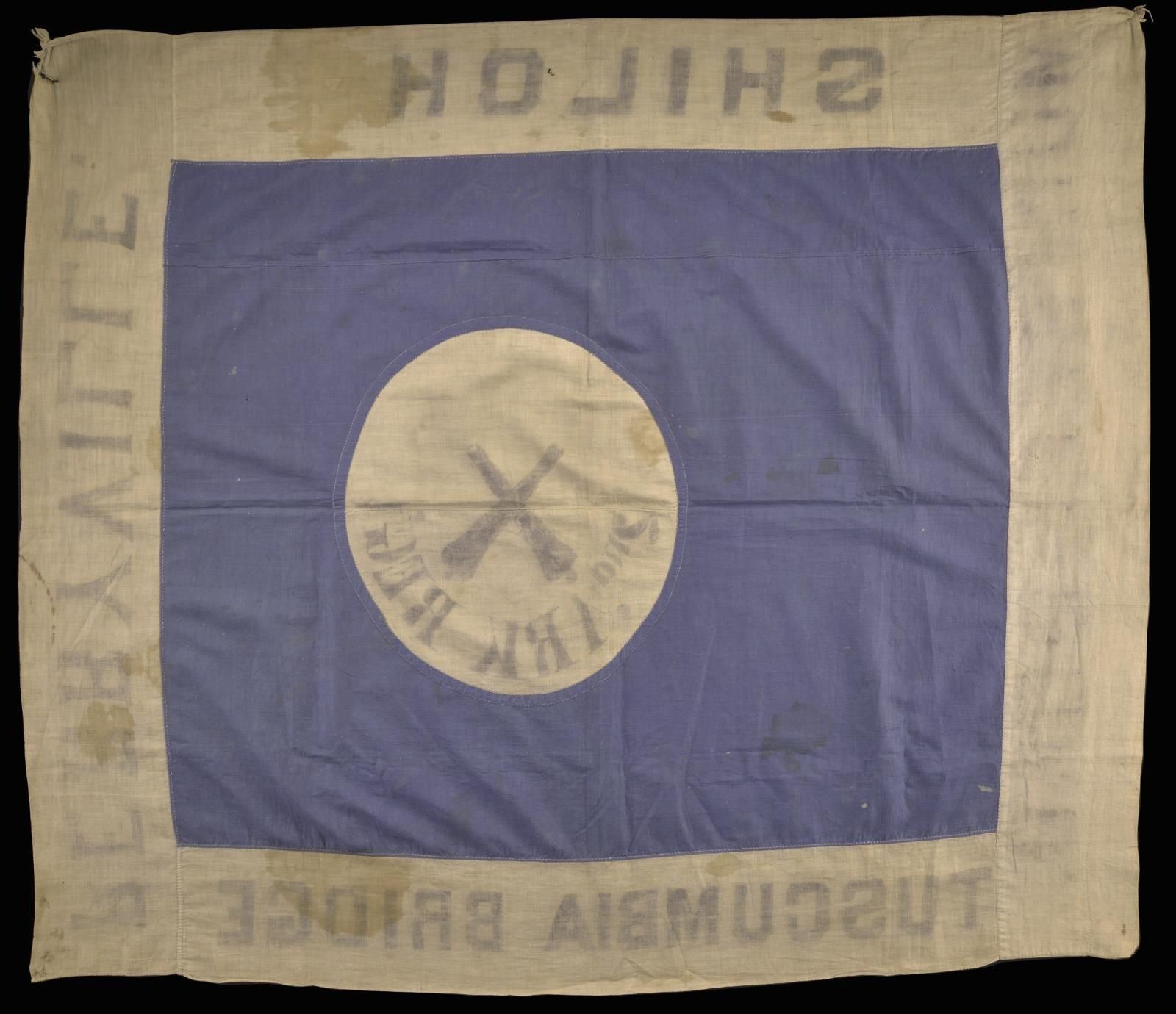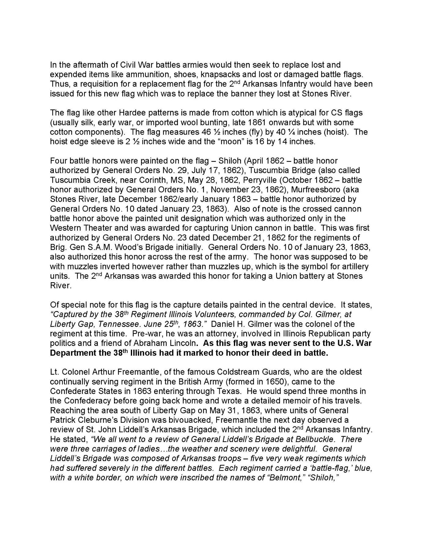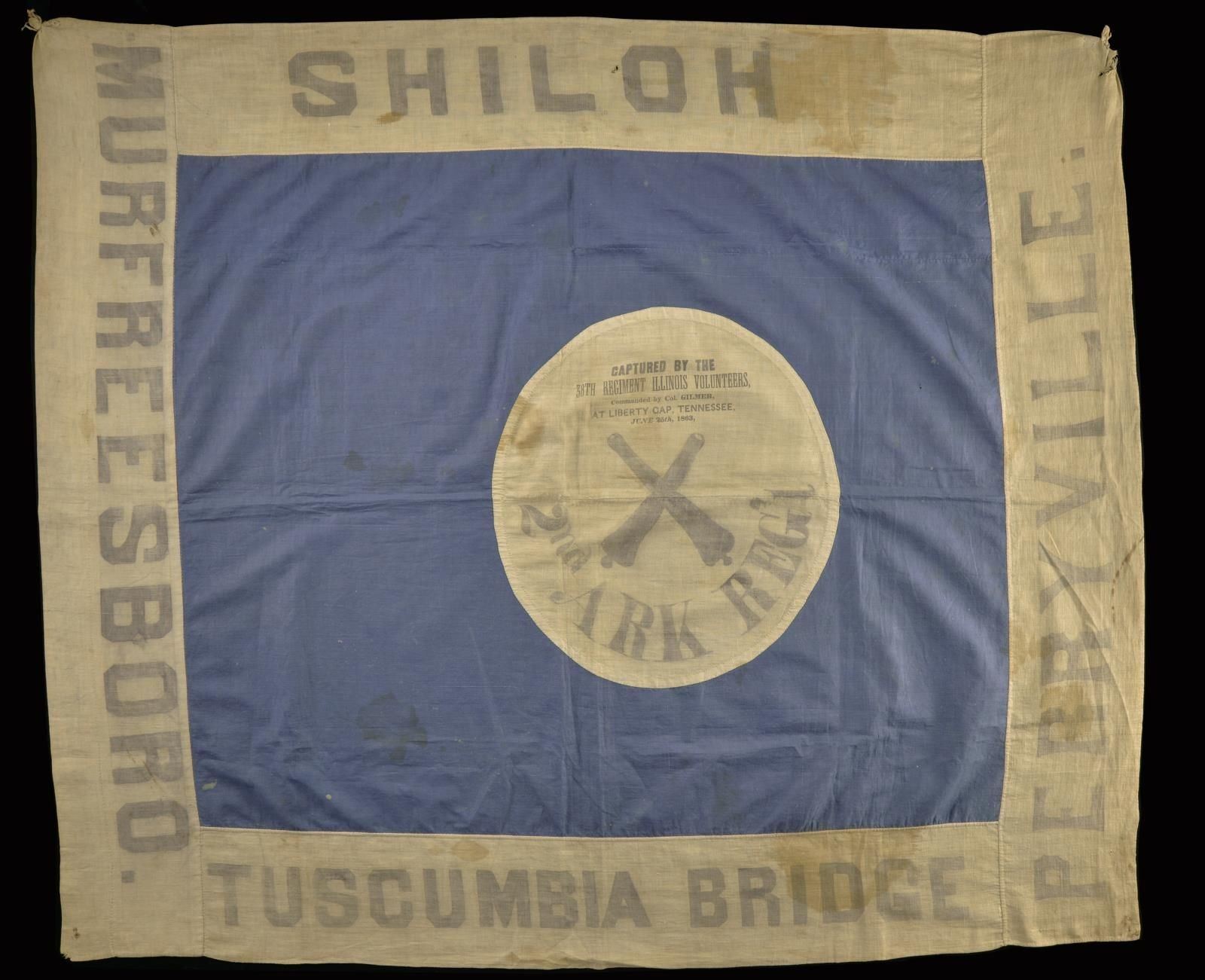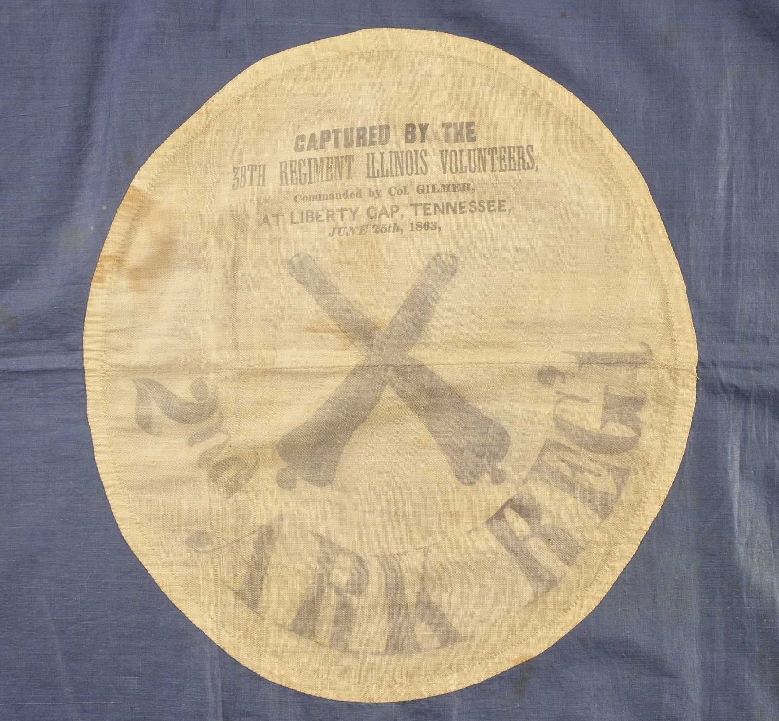 Made entirely of Southern loomed cotton. 46.5" x 40.25" overall, 2.5" sleeve, 16x14" "moon" has crossed cannon (captured cannon in battle) painted above "2nd ARK REGt", painted battle honors "SHILOH", "MURFREESBORO, "PERRYSVILLE", & "TUSCUMBIA BRIDGE" on each border. The 5 line painted capture caption: "Captured by the 38th Illinois Vols commanded by Col. Gilmer at Liberty Gap, Tennessee, June 25th 1863".