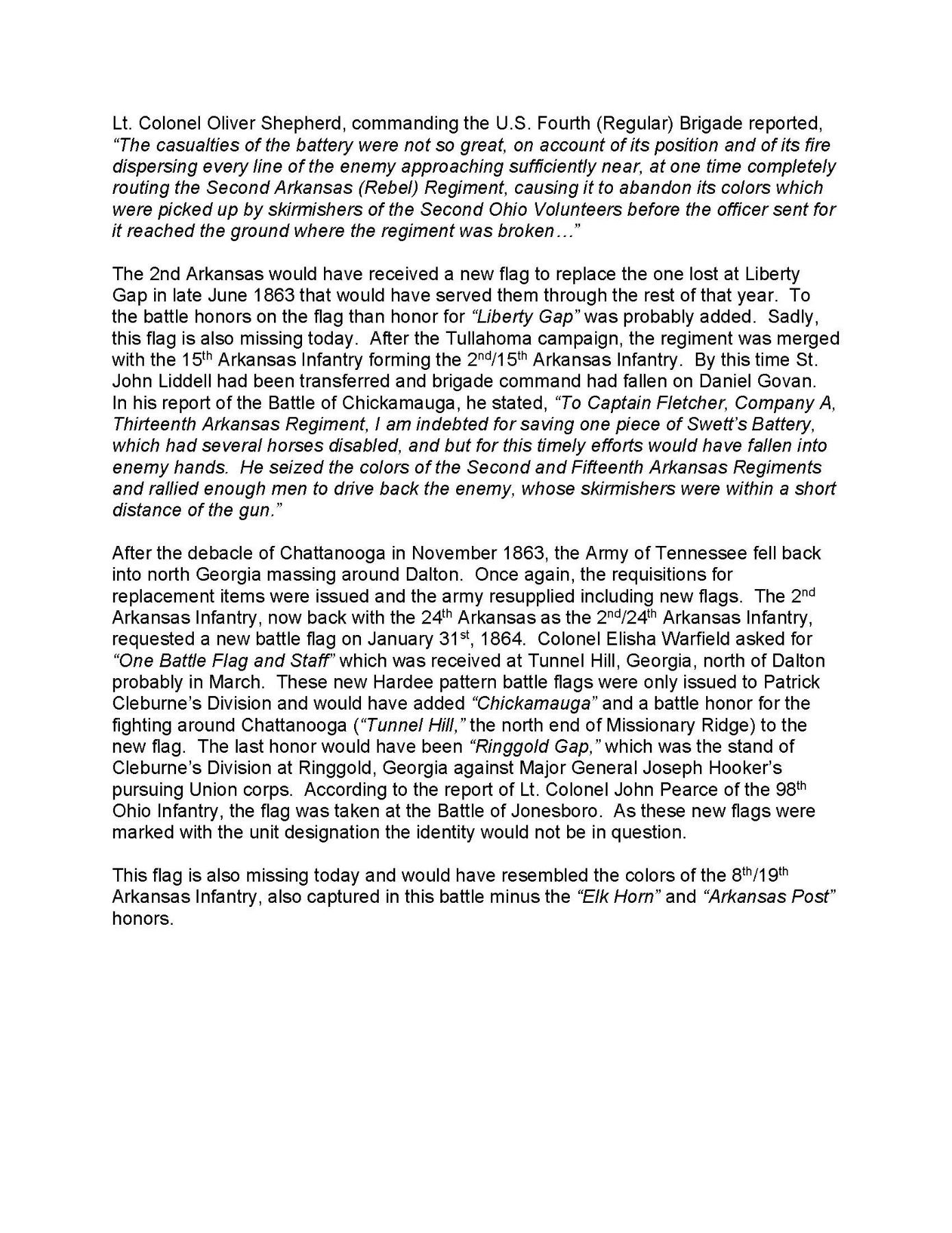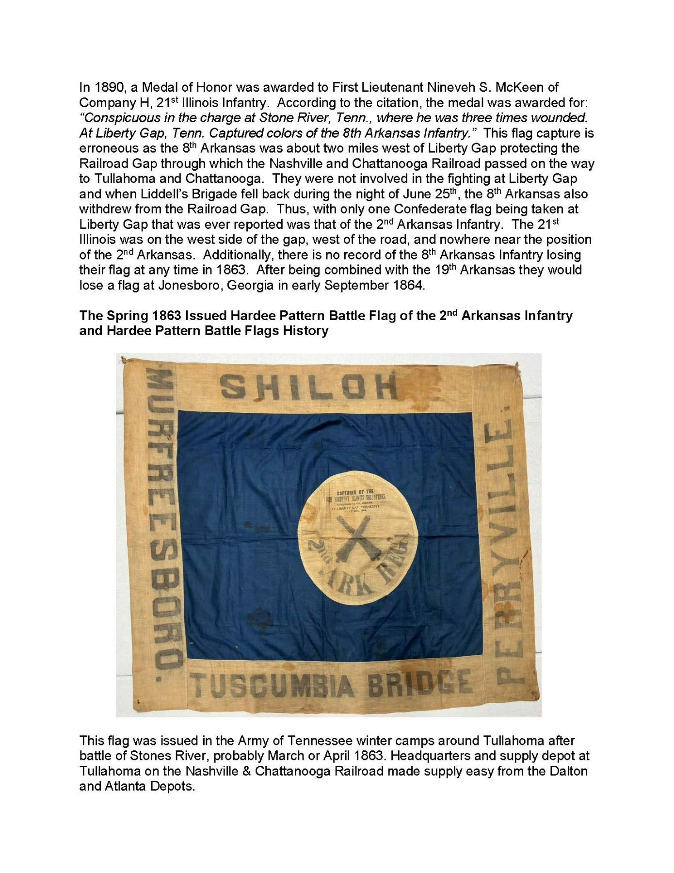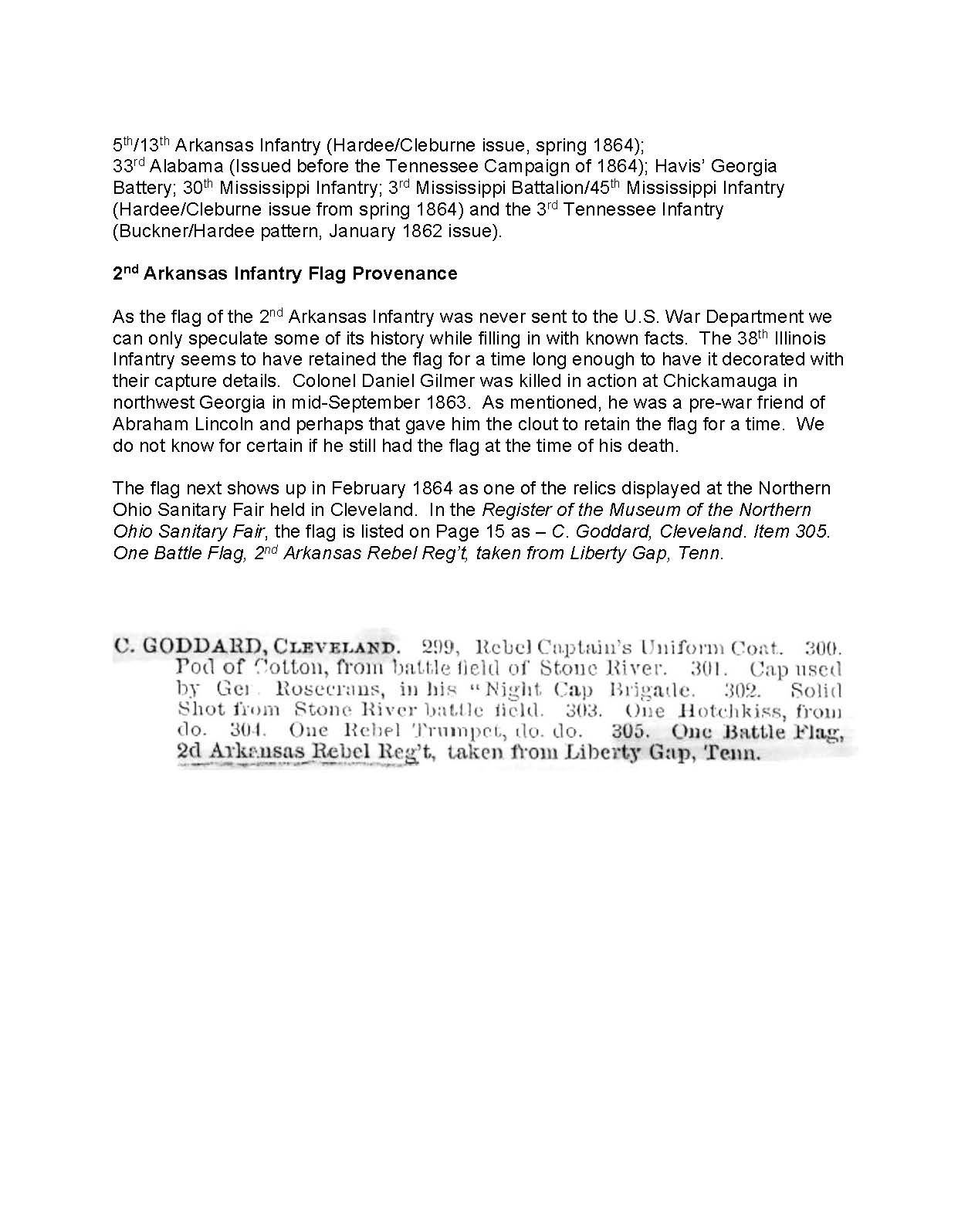 BATTLE FLAG EXTANT. This flag has been locked in safety deposit box for many years and thought lost since last known when displayed and auctioned at the Northern Ohio Sanitary Fair for Soldier’s Aide Society February 22-March 10, 1864. Flag has an amazing history. Hardee’s Corps, Army of Tennessee were issued flags in Spring 1863. Flag was captured at Battle of Liberty Gap during the Tullahoma Campaign June 25th 1863 where three color bearers were killed in only one hour. The devastation caused by newly introduced Spencer repeating rifles won the battle of Liberty Gap decimating the 2nd Arkansas who now had too few men for a regiment. Their next battle, they would fight as consolidated regiment with the 15th Arkansas.