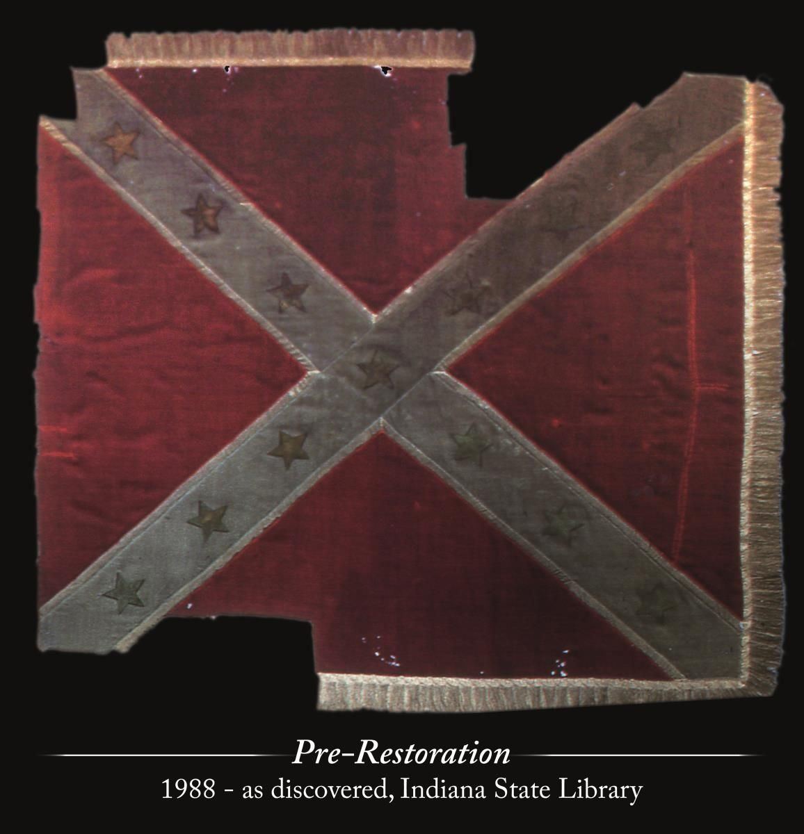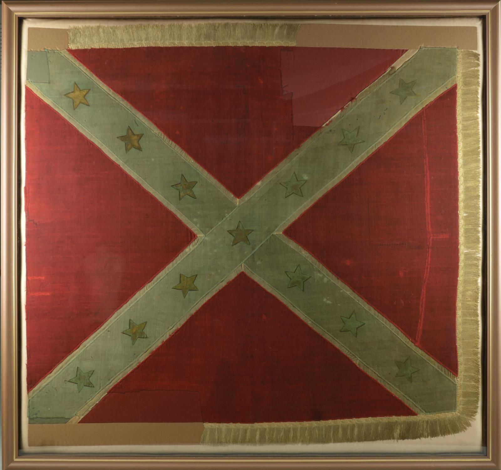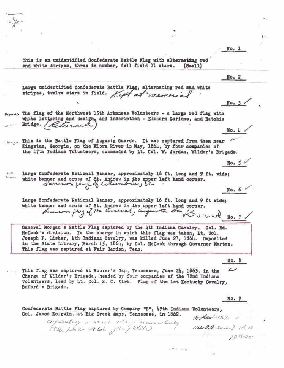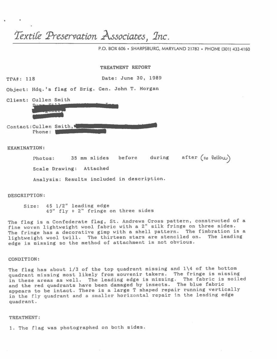 Accompanying are detailed reports of battle, and detailed report of flag conservation, and history of flag from when captured and collection history. The Battle of Fair Garden was near Sevierville, TN. UNATTACHED ACCESSORIES: Large file includes: detailed drawings and photo transparencies, Howard Madaus letters of authenticity and history 1983 and 1985, bill of sale from 1985 (R.E. Neville, Mobile), Textile conservation and restoration reports 1988 & 1989 (Fonda Thompson TPA), copies of reports of capture and inventory as part of Indiana State Library collection till collection dispersed in 1962. 1990 Newspaper article about Fonda Thompson and conservation of Alabama's Confederate flags. Misc. history of General Morgan. "Also included is scholarly 11 page report of history of flag by prominent flag authority Greg Biggs"