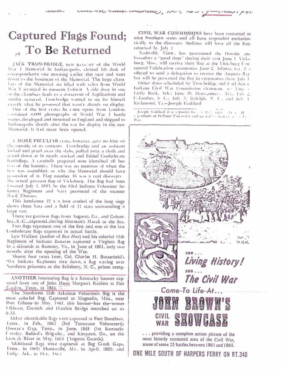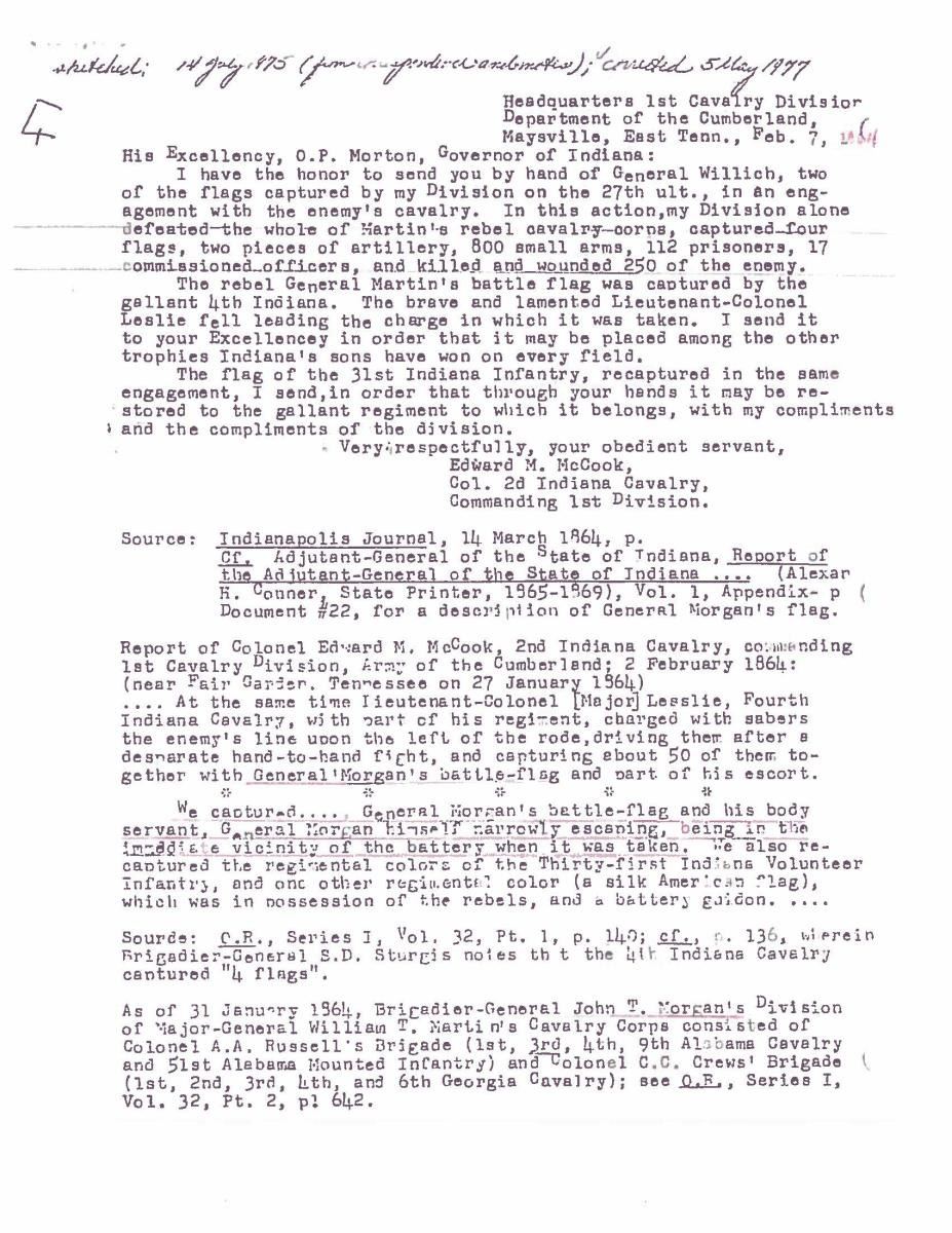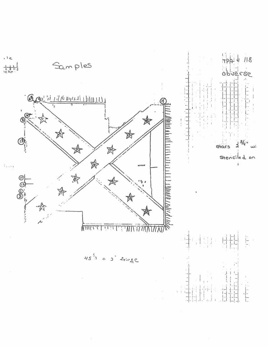 Accompanying are detailed reports of battle, and detailed report of flag conservation, and history of flag from when captured and collection history. The Battle of Fair Garden was near Sevierville, TN. UNATTACHED ACCESSORIES: Large file includes: detailed drawings and photo transparencies, Howard Madaus letters of authenticity and history 1983 and 1985, bill of sale from 1985 (R.E. Neville, Mobile), Textile conservation and restoration reports 1988 & 1989 (Fonda Thompson TPA), copies of reports of capture and inventory as part of Indiana State Library collection till collection dispersed in 1962. 1990 Newspaper article about Fonda Thompson and conservation of Alabama's Confederate flags. Misc. history of General Morgan. "Also included is scholarly 11 page report of history of flag by prominent flag authority Greg Biggs"