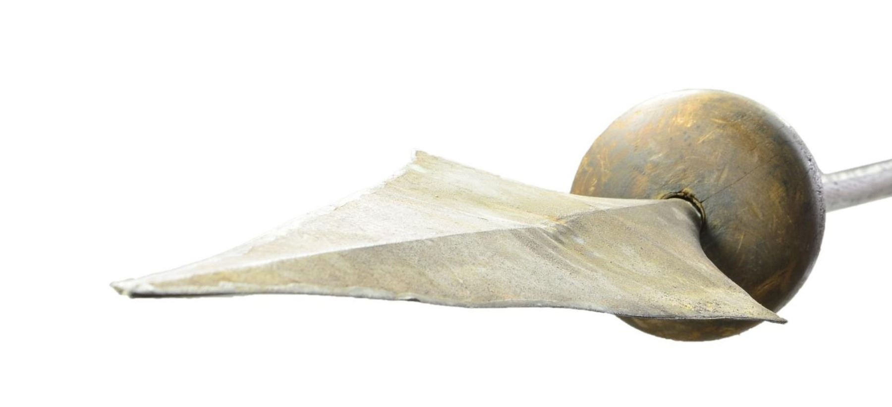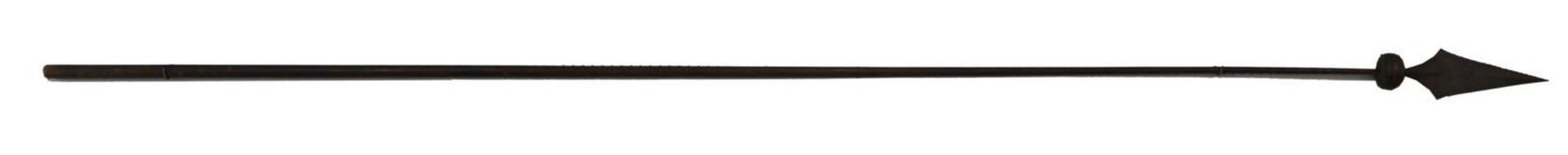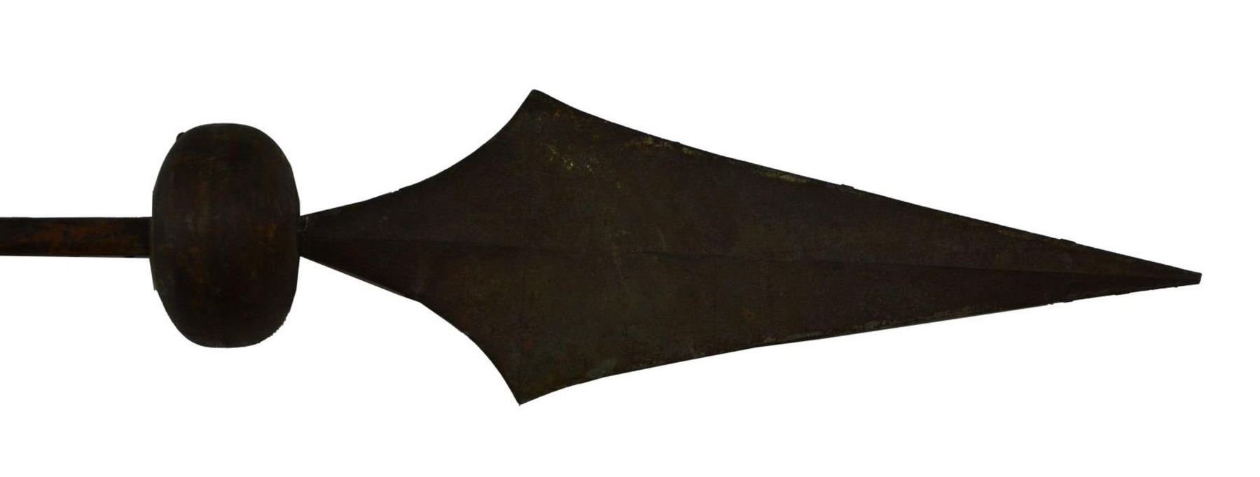 13 feet long, staff tapers from 1.5” to .75”, soldered 2-piece embossed tinned sheet iron spear point finial is 15.5” and 5.5” wide, 4” wood ferrule. This amazing survivor, maybe only one in private hands was from collection of Jim Frasca who believed it was Confederate. Steve Mullinax had it in his collection for 20 years till his passing. There are tack remnants starting near ferrule running just over 5 feet. Many early Confederate National flags had these dimensions and standard Union colors were 6 feet on hoist. The first collector who bought this from Frasca in 1998 wanted it to be US, but sold it to Steve when Mullinax was convinced it was Confederate and brought back by Ohio troops as captured with unknown Confederate flag still in Ohio. CONDITION: very good overall, several dings and dents in well patinaed head. (02-19066/JS). $6,000-8,000.