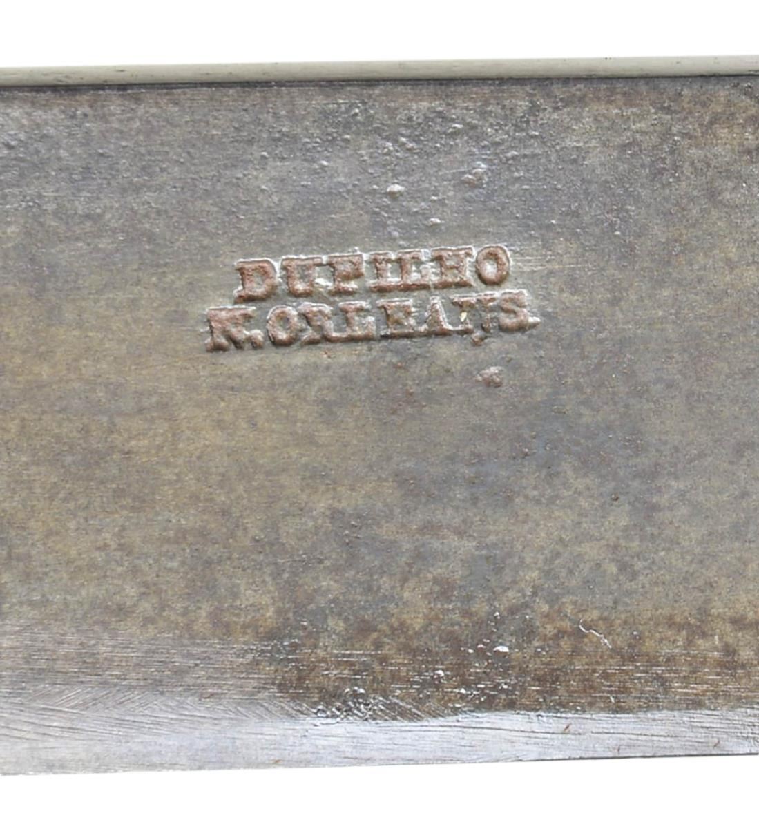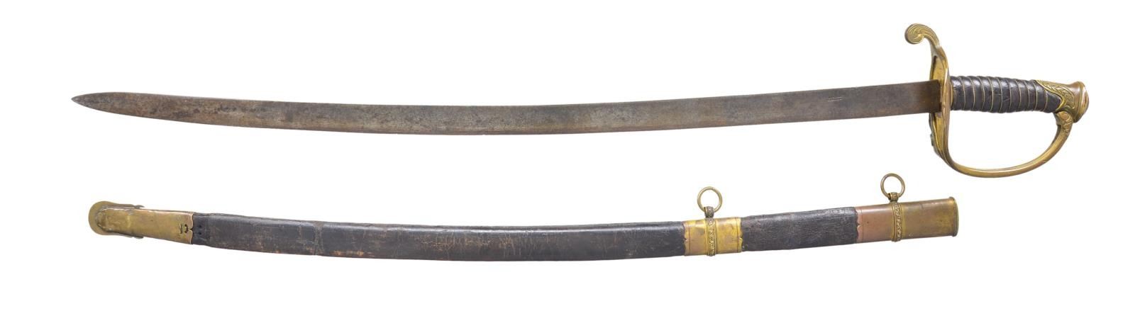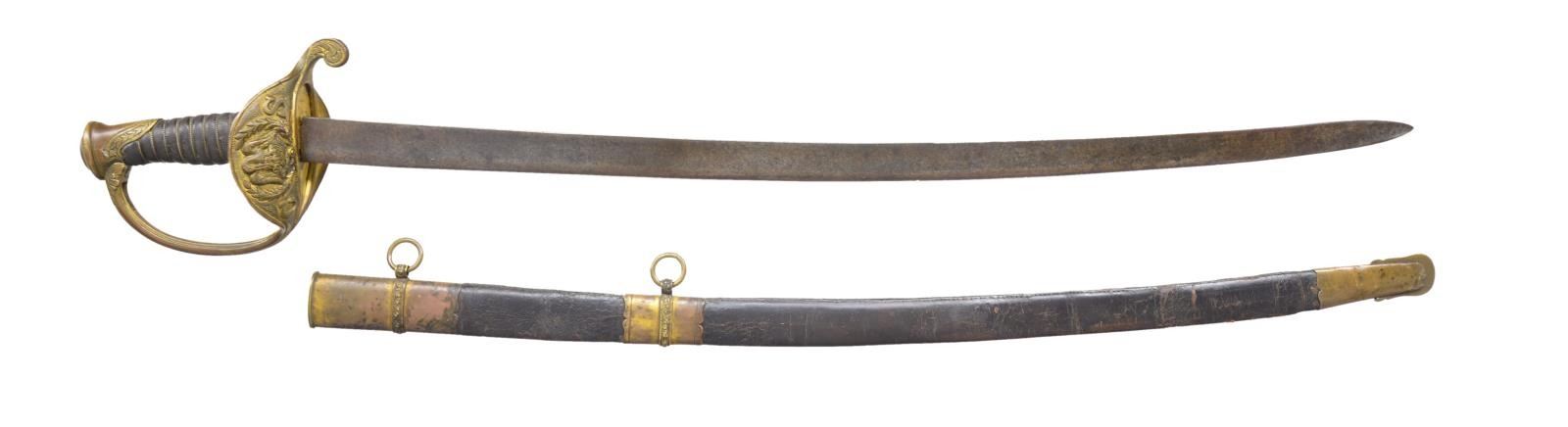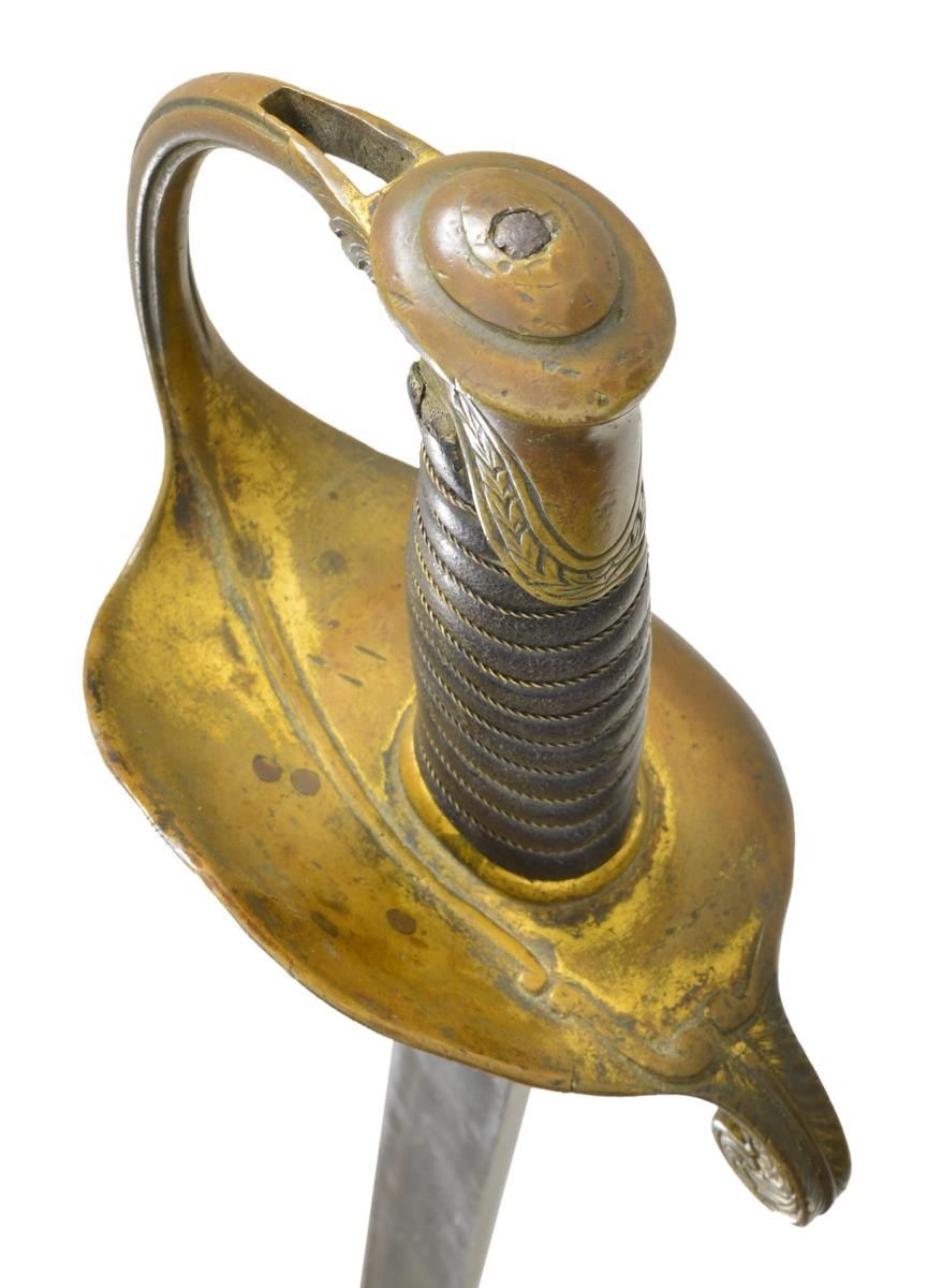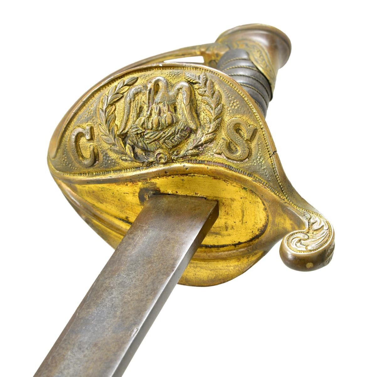 STAFF OFFICER'S SWORD WITH "PELICAN FEEDING YOUNG". 30.5" unstopped fullered blade, crisp maker’s mark: "DUFILHO / NEW ORLEANS". This is among the most beautiful of all Confederate officer swords. Large guard with relief cast Louisiana State Seal (Pelican feeding young) in laurel wreath and large "CS". This sword is a fine "attic condition" survivor with original scabbard with scalloped mounts and rococo decorated ring bands. Alexandre H. Dufilho was prewar cutler making surgical instruments and bowie knives. He continued his trade during the war, making the highest quality Confederate swords. CONDITION: very good-fine overall, blade has smooth gray/brown surface, remnants of old sharpening. Hilt, pommel, and scabbard have strong areas of gold wash with balance chocolate/brown patina. Scabbard is complete and original with a small glued repair to leather between top mounts which is barely discerned. PROVENANCE: Cullen Smith estate collection. (02-17236/JS). $30,000-40,000.
