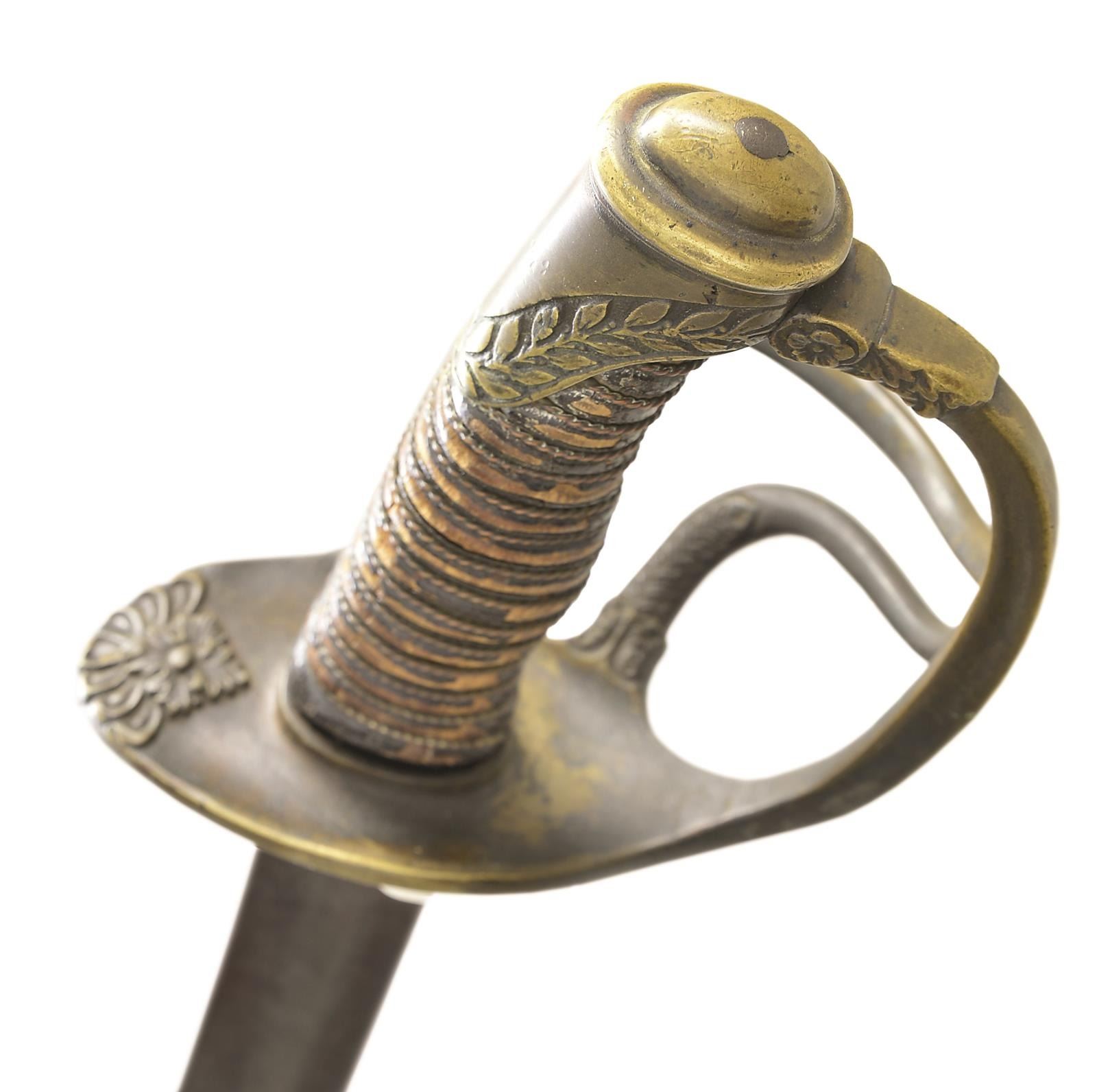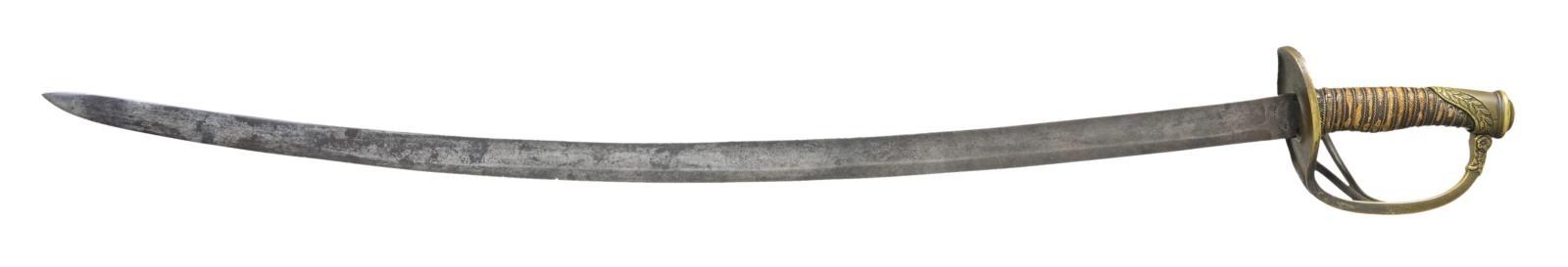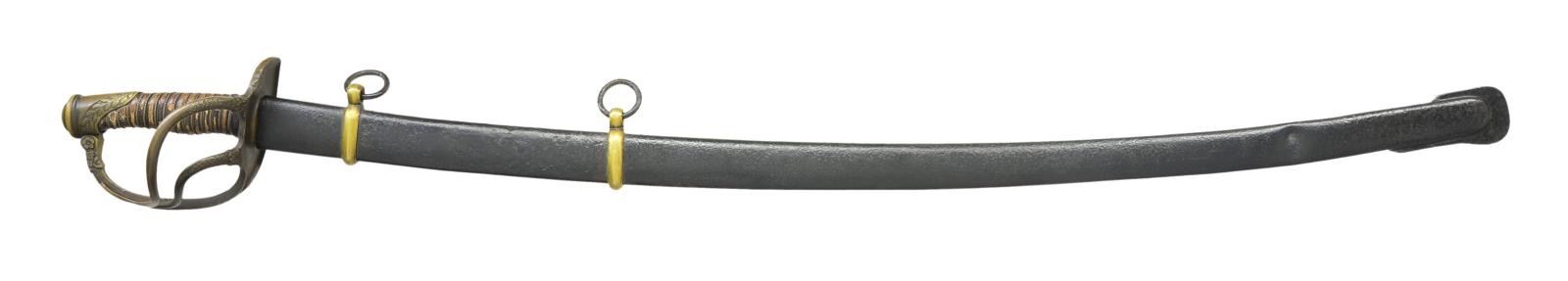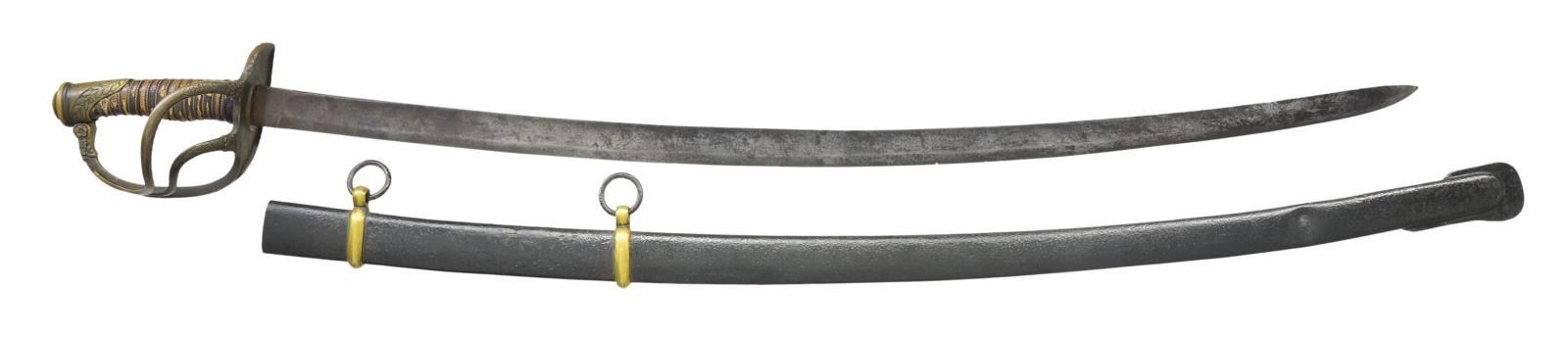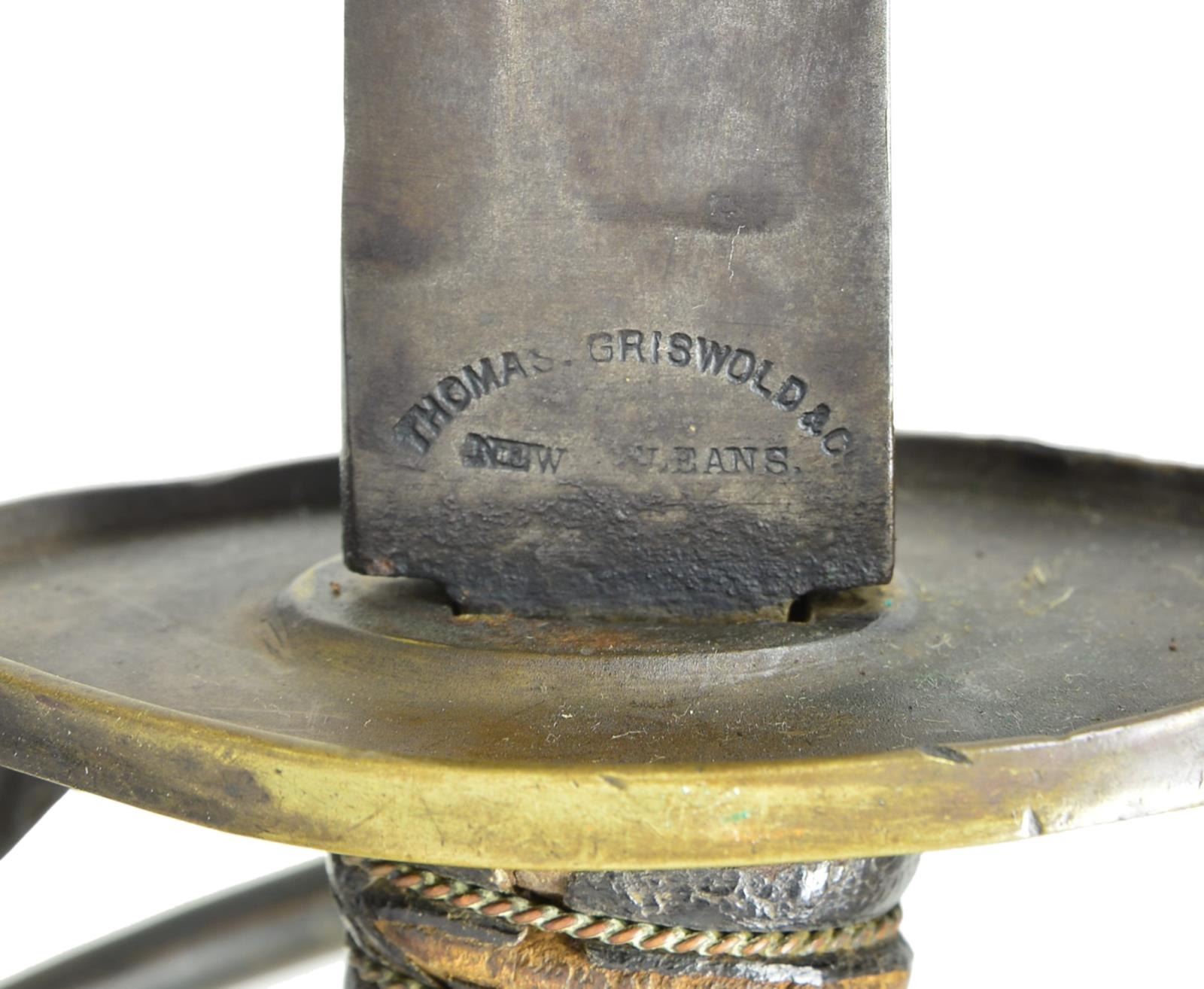 SABER. Nice “attic condition” saber with 35” blade with full firm mark on ricasso “THOMAS, GRISWOLD & Co / NEW ORLEANS”. Brass mounted iron scabbard is not Griswold manufacture but fits well. Among the best made saber in the South. Several generals carried this sword including one Union General who captured and carried one. CONDITION: very good overall, gray blade, a few letters weekly struck in makers name as usual, uncleaned olive/dark mustard patina to brass hilt. Grip retains about 30% thin leather veneer incomplete tight twisted wire wrap, missing protective washer, so slightly loose. scabbard is sound, steel body pitted and painted black, brass sword rings polished bright. (02-19159/JS). $6,000-8,000.