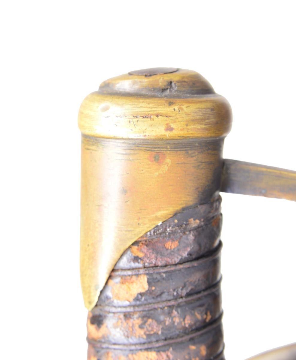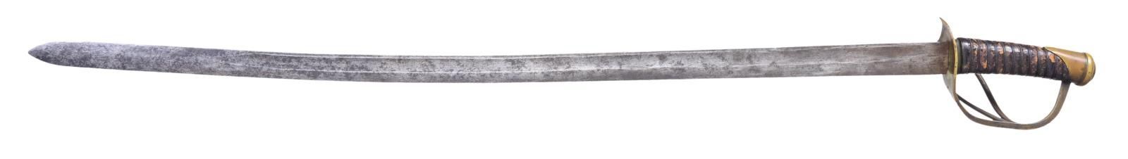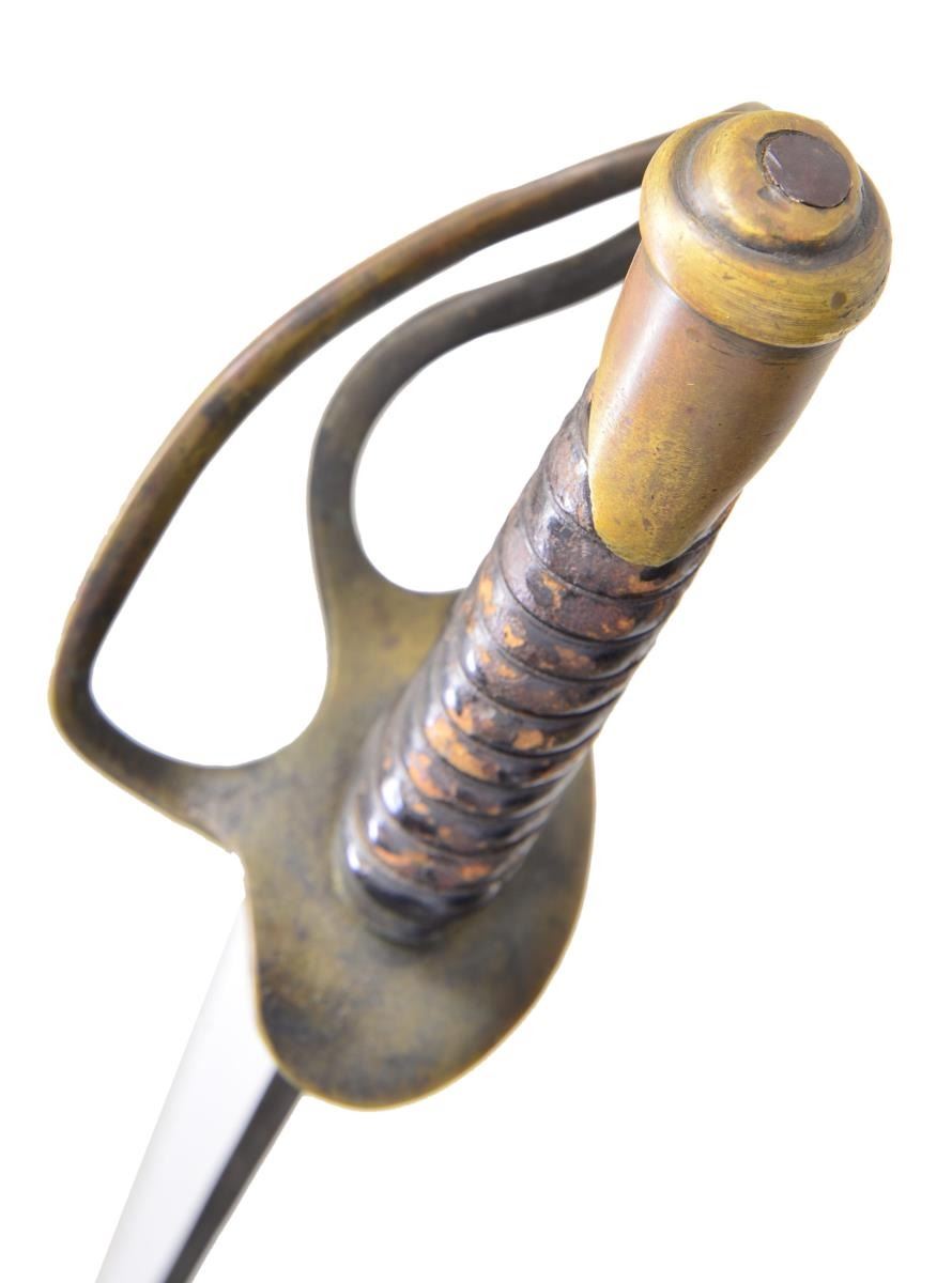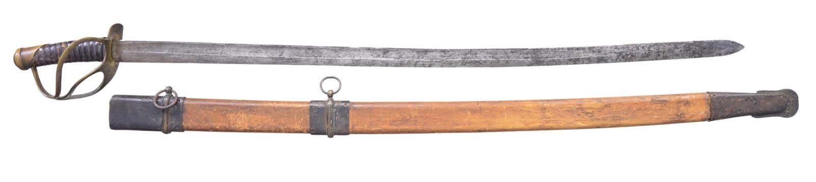 CAVALRY SABER. Fine “as found” Hammond Marshall made saber at his Atlanta Sword Factory. 33.25" very slightly curved unstopped fuller blade. Distinctive short heavy pommel and brass ferrule at base of grip, light cavalry 1860 style branched hilt. Unique Marshall scabbard is made from 2 wood slabs carved to perfectly fit each blade (swords & scabbards don’t interchange) & pinned with japanned sheet iron mounts & brass rings. The grip is about as fine as found with much of its original polish. Survival on these sabers in unmolested condition is rare. CONDITION: very good to fine overall, blade is gray overall, light scattered staining. Grip retains all its leather, scuffing, thin iron wire is tight and complete. Scabbard is sound with repaired crack above drag. Brass throat is missing as on so many survivors. (02-19156/JS). $4,500-5,500.