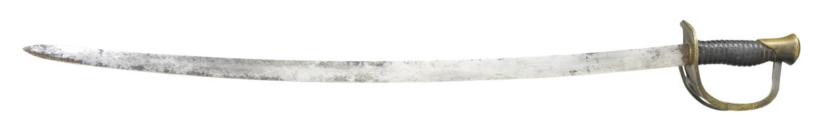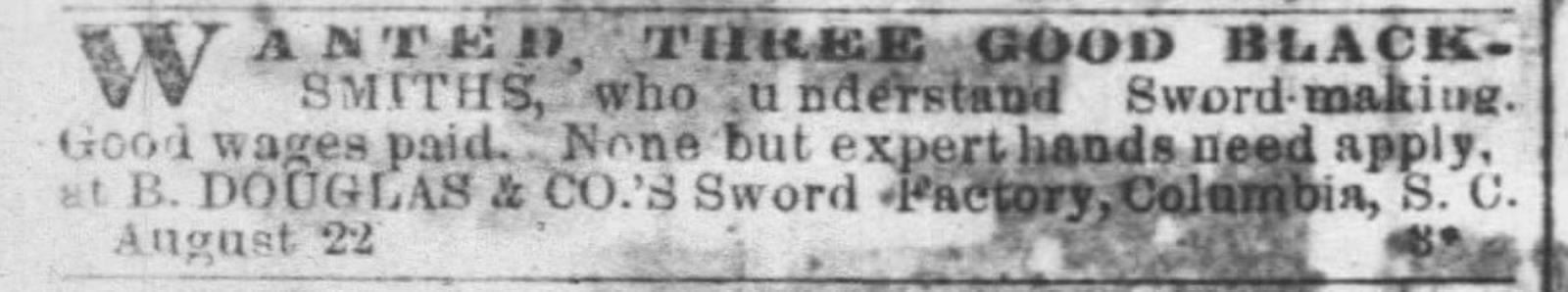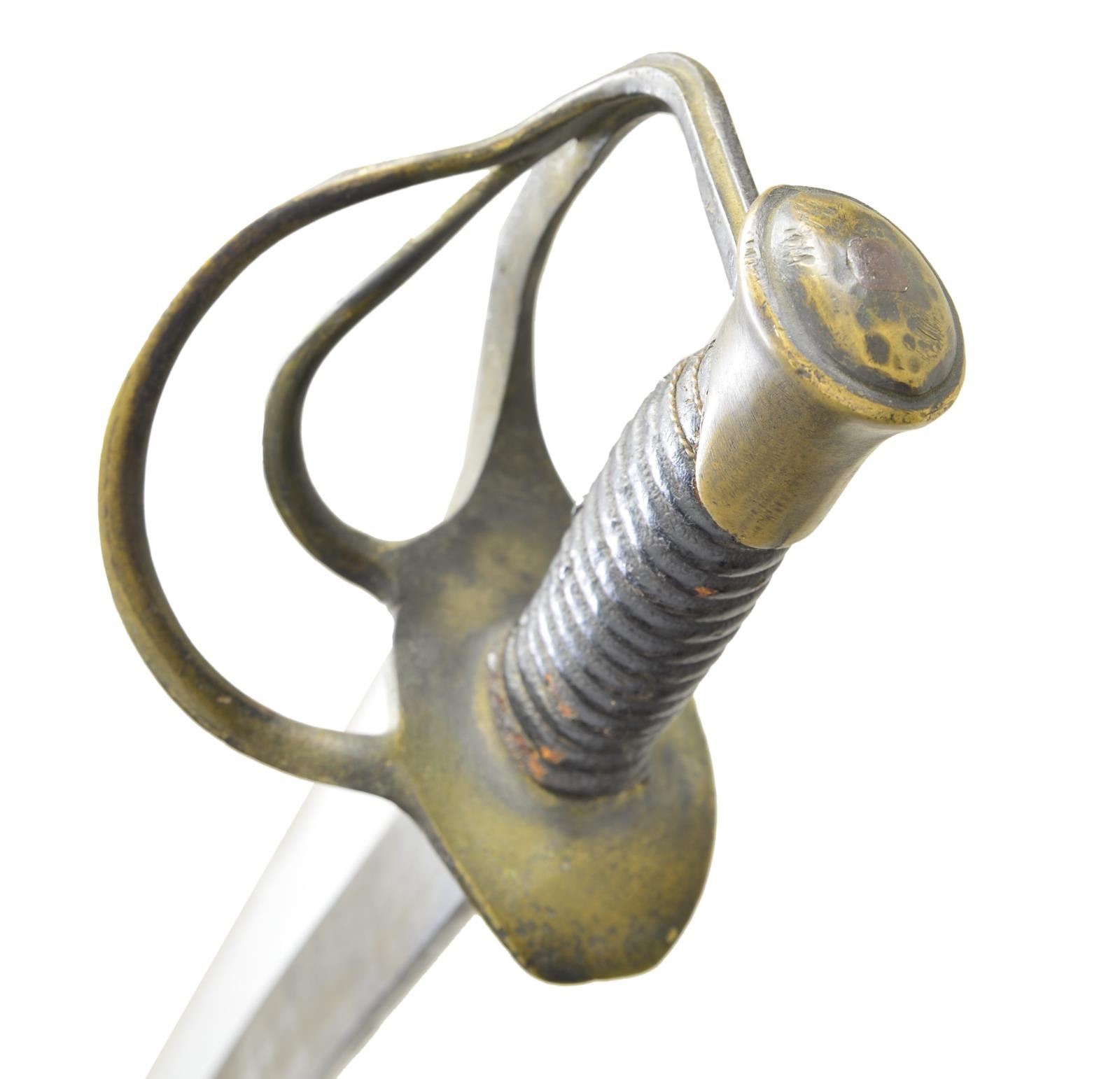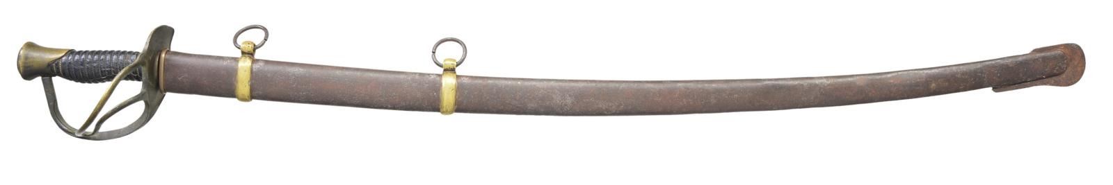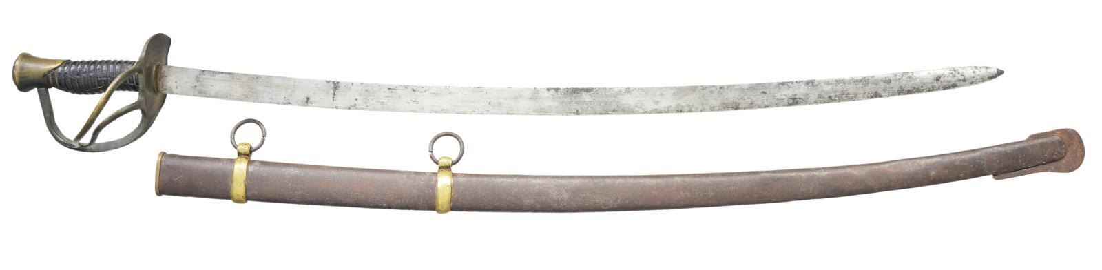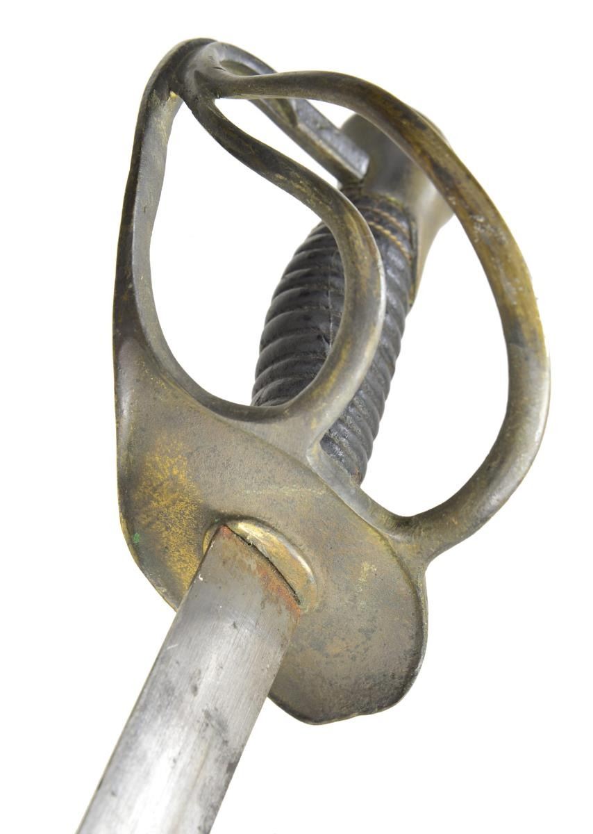 CAVALRY SABER. Classic B. Douglas, Columbia, SC made saber with about as fine a blade that is encountered on any Confederate saber. 34” heavy flat unfullered blade is mostly bright with original factory polish. B. Douglas & Co” is among the most obscure of sword makers though their ads can be found in several newspapers offering swords they make at their factory at the old foundry on Washington Street, Columbia. We can identify this saber because there are signed examples of several patterns stamped “B. DOUGLAS & CO”. CONDITION: fine, blade as noted is bright with most of its original factory finish, old sharpening, staining and light pitting. Grip retains most all original leather with few scuffs, 0nly 3 turns of original twisted brass wire remain under distinct Douglas mushroom shaped undecorated pommel. Lap seamed soldered brass mounted scabbard is not the typical Douglas associated pattern, but scabbard is Confederate manufacture and fits loosely. (02-19155/JS). $4,000-5,000.