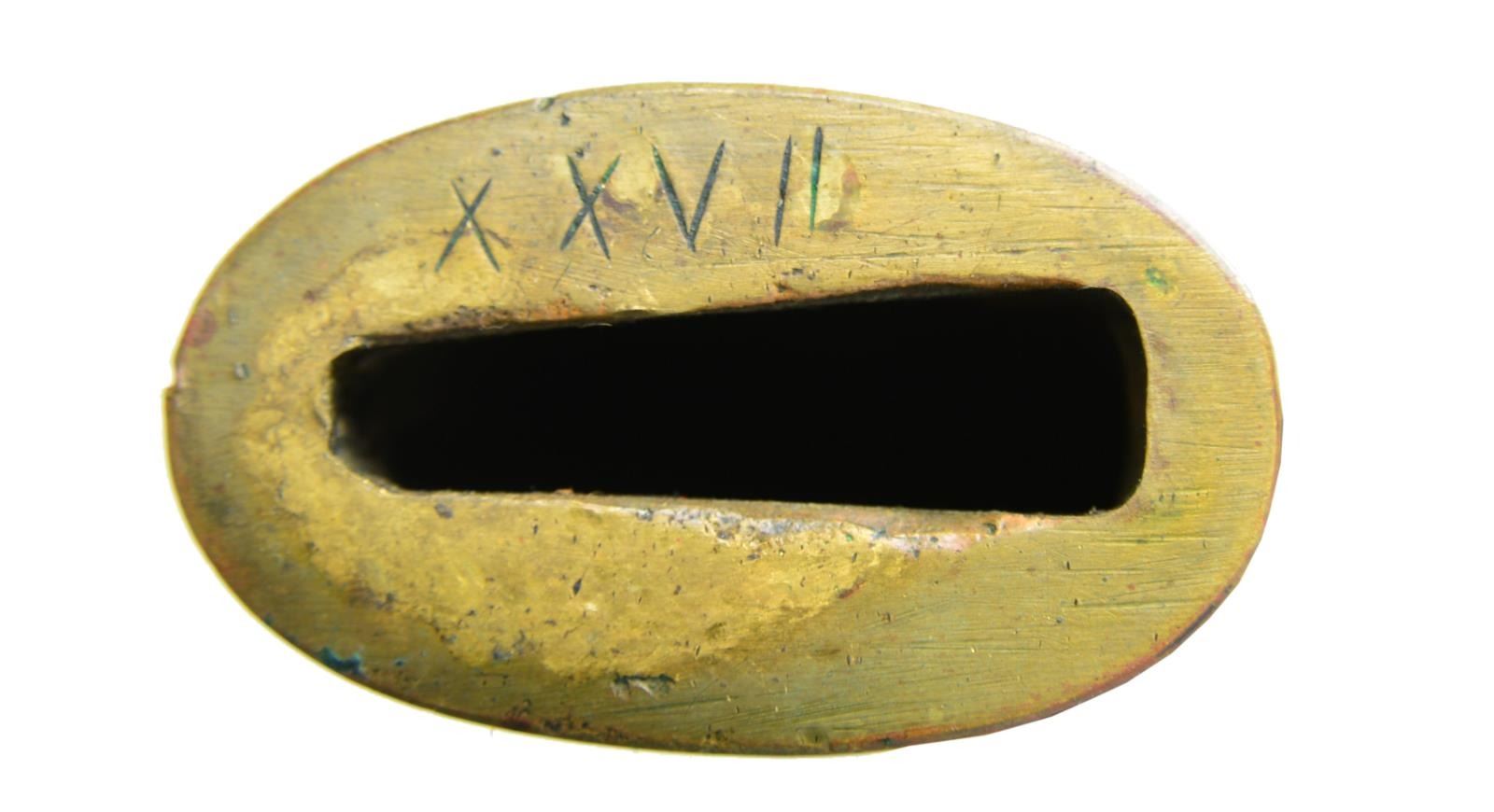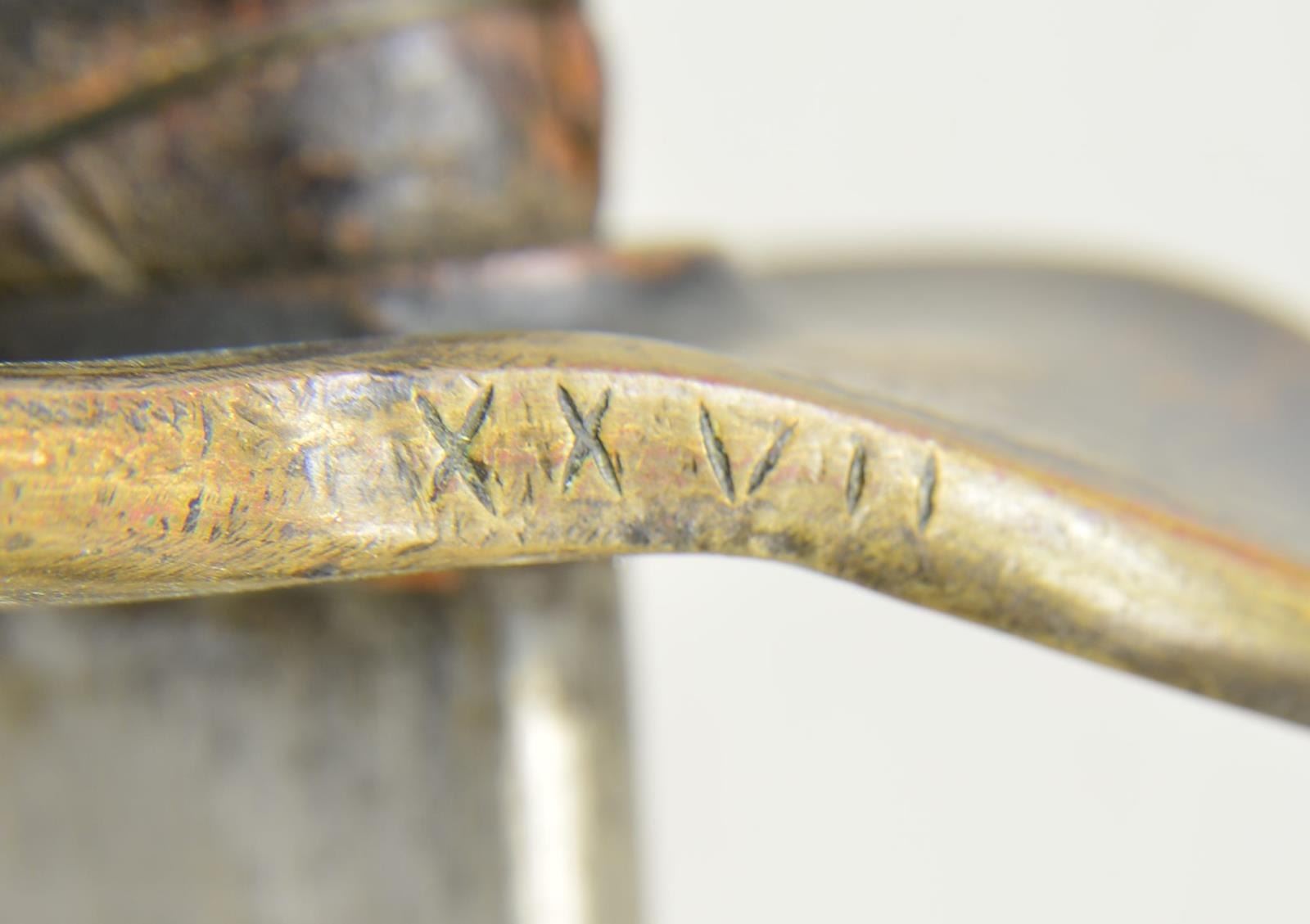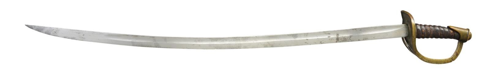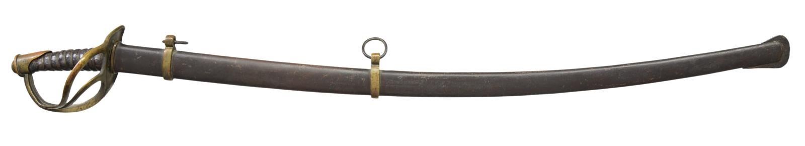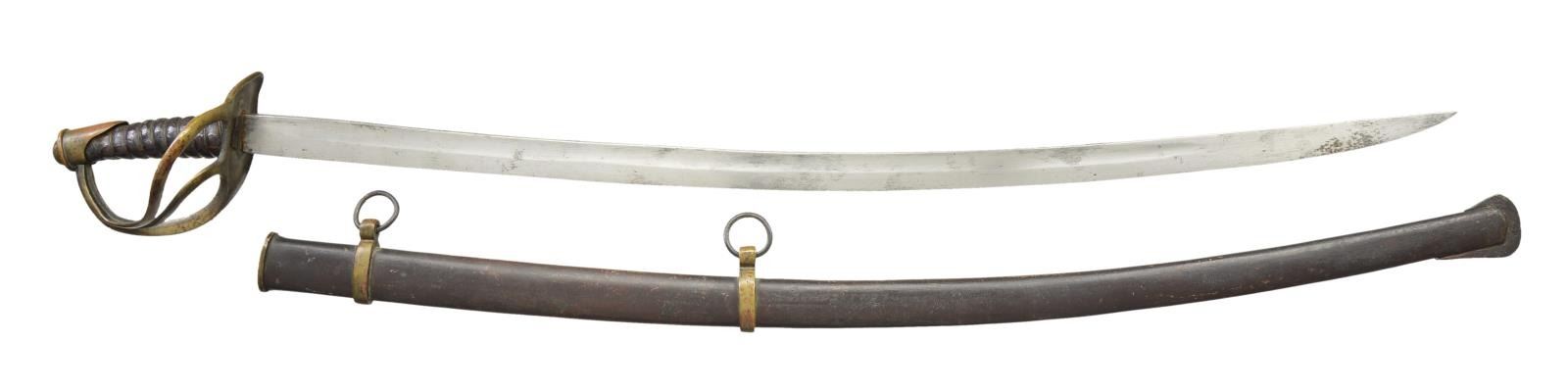 NC CAVALRY SABER. Classic saber made at Louis Froelich’s “Confederate States Armory” sword factory in Kenansville, North Carolina. Distinct Froelich features include pointed quillon, matching Roman numeral assembly marks on guard and brass throat of scabbard. Froelich scabbards are unique lap seamed, pinned brass throat, large flat brass sword rings, squared tip, iron drag, dark red lacquered. This saber exhibits heavier than normally encountered classic Froelich pointed quillon w/ 1860 style pommel instead of normally encountered straight sided pommel characteristic of this maker. You will not find a better blade on a Confederate cavalry saber. CONDITION: very good to fine overall with complete leather grip and single brass wire wrap, the 35” unstopped fuller blade is exceptional retaining most of its original factory polish with light staining and pitting. matching assembly “XXVII” on hilt and throat, matching dark brass patina throughout. Scabbard is in matching fine condition, much of its darkened lacquer surface retained. (02-19171/JS). $4,000-5,000.