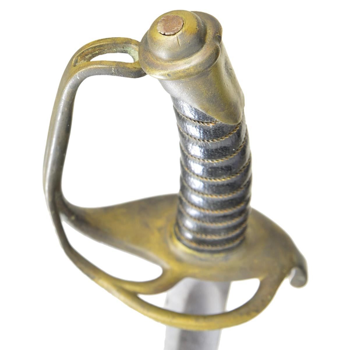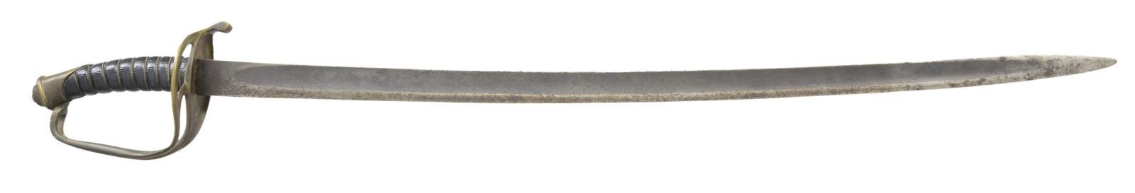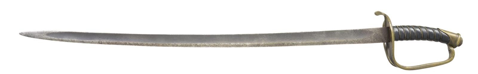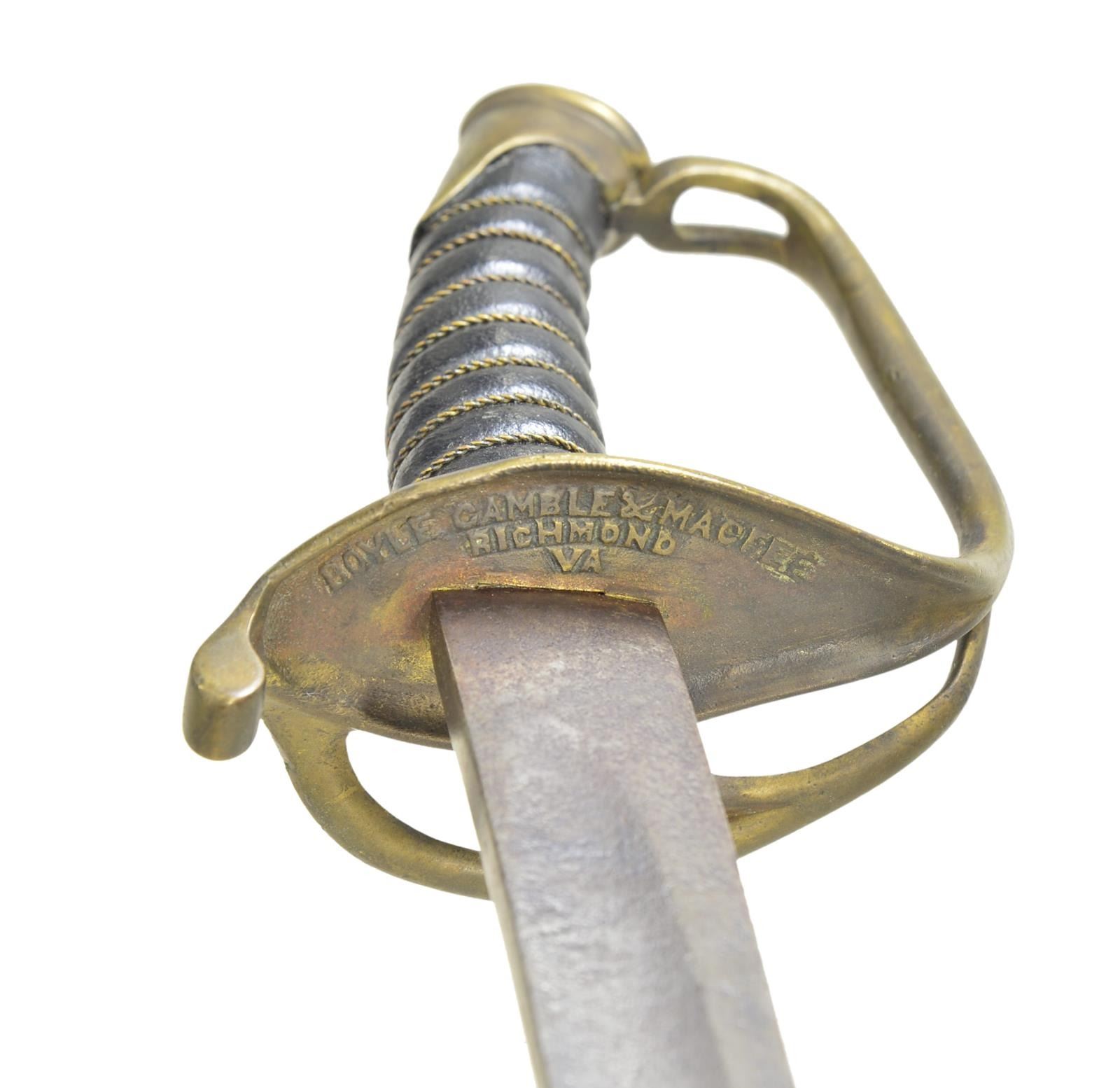 CONFEDERATE OFFICER SWORD. 35” overall, 29” unstopped fuller blade, branched concave cupped guard with raised relief “BOYLE GAMBLE & MACFEE / RICHMOND / VA. CONDITION: very good overall, blade cleaned, pitted, still sharp. Grip is professional rewrap. (02-19128/JS). $3,000-4,000.