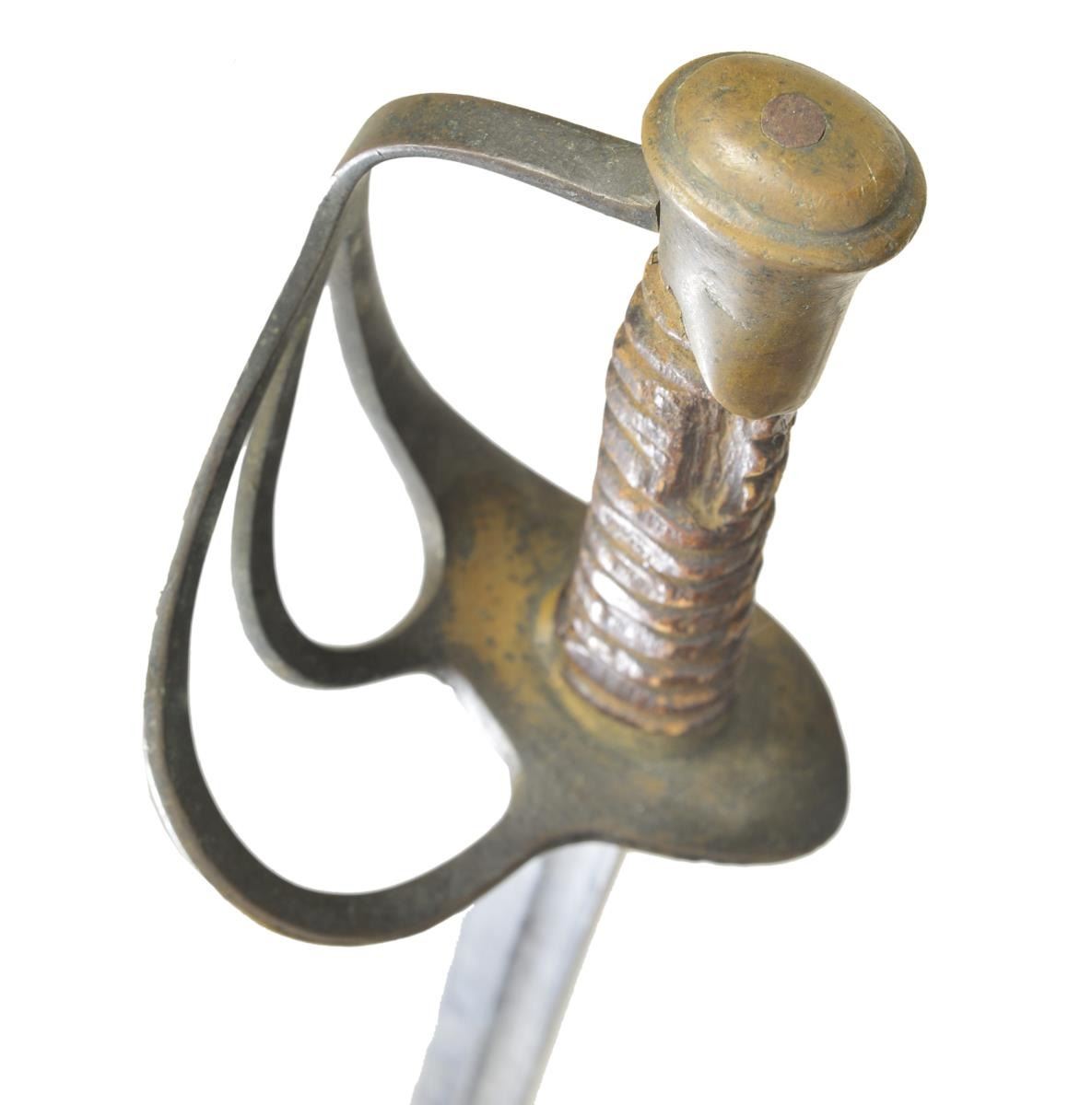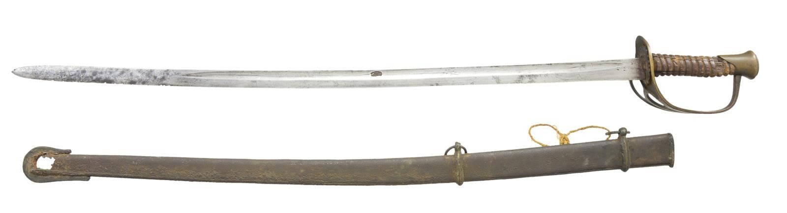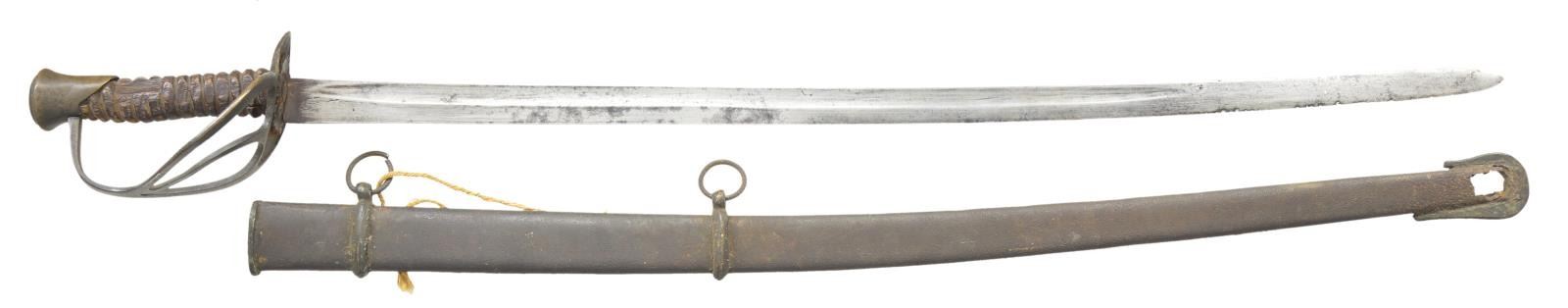 SCABBARD. 32.5” unstopped fuller blade mounted with flat guard branch saber with mushroom pommel made by Carolina makers usually. The well fit brass trimmed lap seamed scabbard has only been found on very rare Nashville Plow Works officer swords which only a few are documented. CONDITION: sword is very good overall with gray blade, dark brass patina, well patinaed carved wood grip that has no remaining wrap. The scabbard is good with uncleaned iron and brass patinas, the tip is rusted through exposing blade tip but still retains distinctive beveled brass drag. (02-19106/JS). $2,500-3,500.