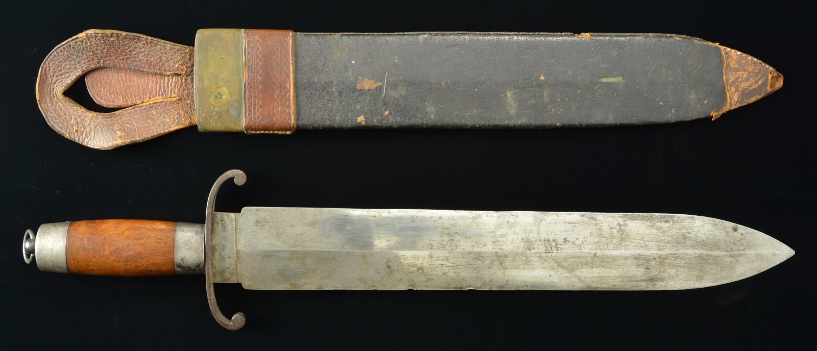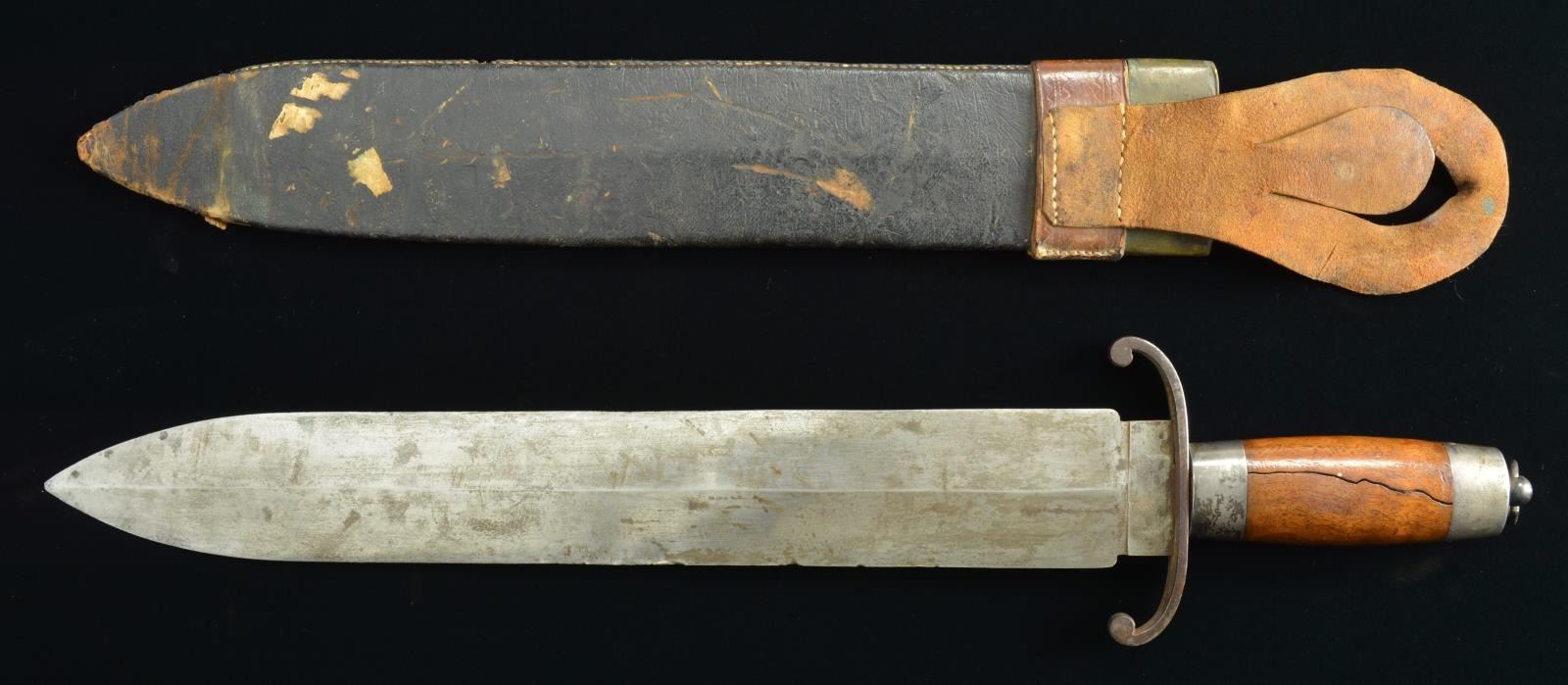 21” overall, 16” double edged spearpoint, 2.25" wide, .25” blade. The blade has profile and grind of many Confederate swords, but better quality mounted than most Confederate edged weapons and probably another maker, oval walnut grip with silver ferrule & pommel cap with lanyard ring. Leather sheath has brass throat which retains tooled brown leather attached belt loop with tongue, 2 ply leather construction sewn on one edge. CONDITION: very good to fine overall, blade retains much of its original polish and toolmarks, old sharpening, several small nicks in cutting edge, 4.5” reverse “C” crossguard has iron patina, long crack in burl of walnut grip. Sheath overall very good, missing layer of leather at tip and lower mount. PROVENANCE: Pictured on page 200 “Accoutrements IV” by Jim Johnston. (02-18171/JS). $3,000-4,500.