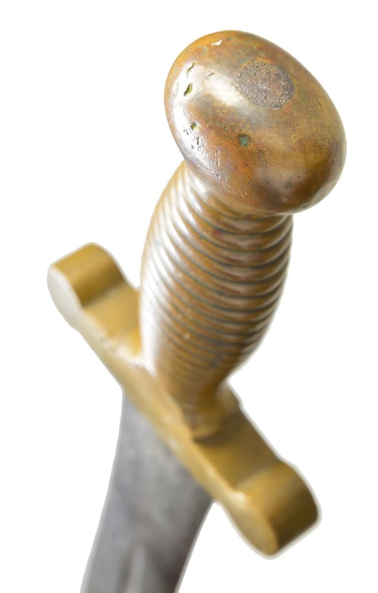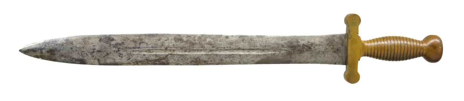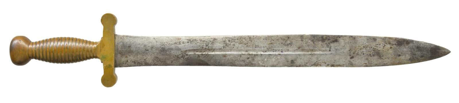 SWORD. 24” overall, 18.5” unmarked blade with distinct thin shallow 8” central fuller. Brass hilt has ribbed handle, undecorated bulbous pommel & cross guard. There is at least one marked example which could have been a sample for government inspection. This is about as nice as this pattern can be found. CONDITION: “as found”, uncleaned, gray blade showing finishing marks, smooth light chocolate brown patina to brass. (02-19076/JS). $2,500-3,000.