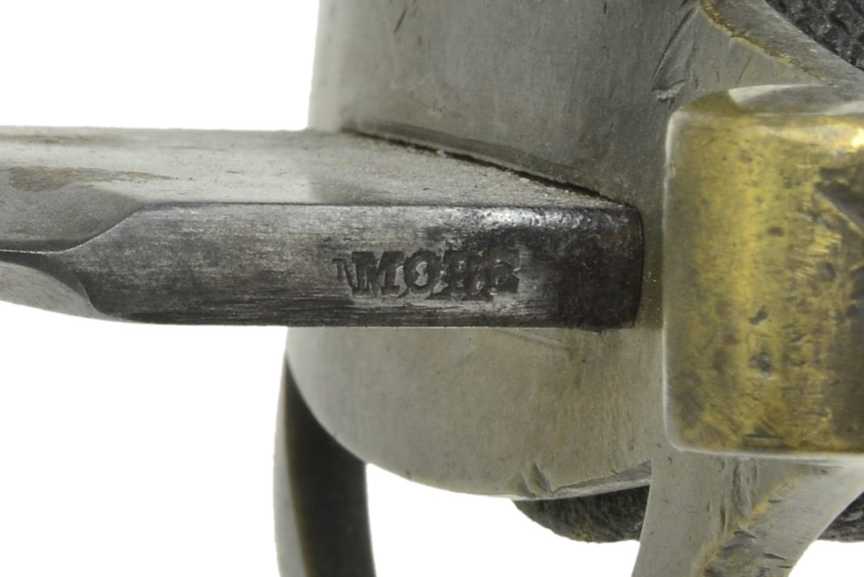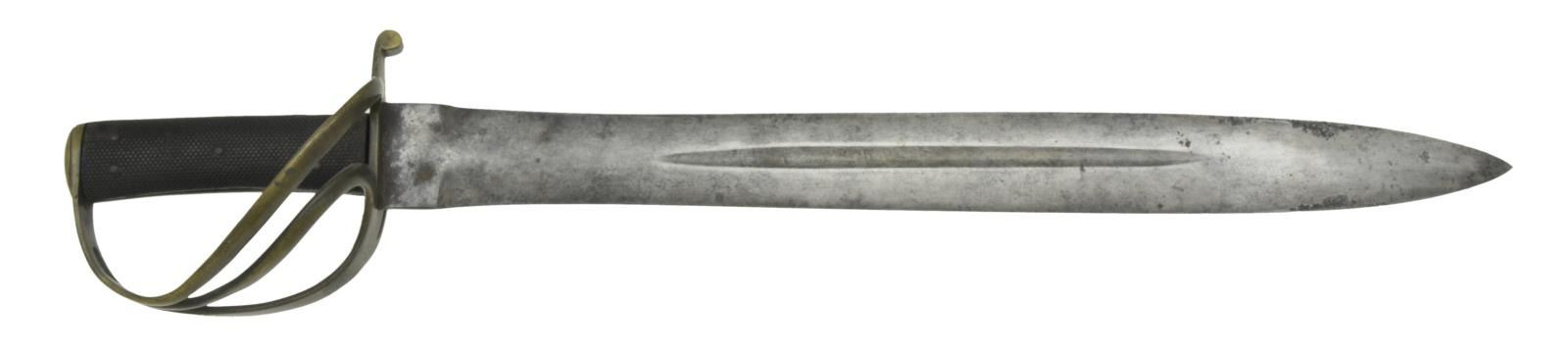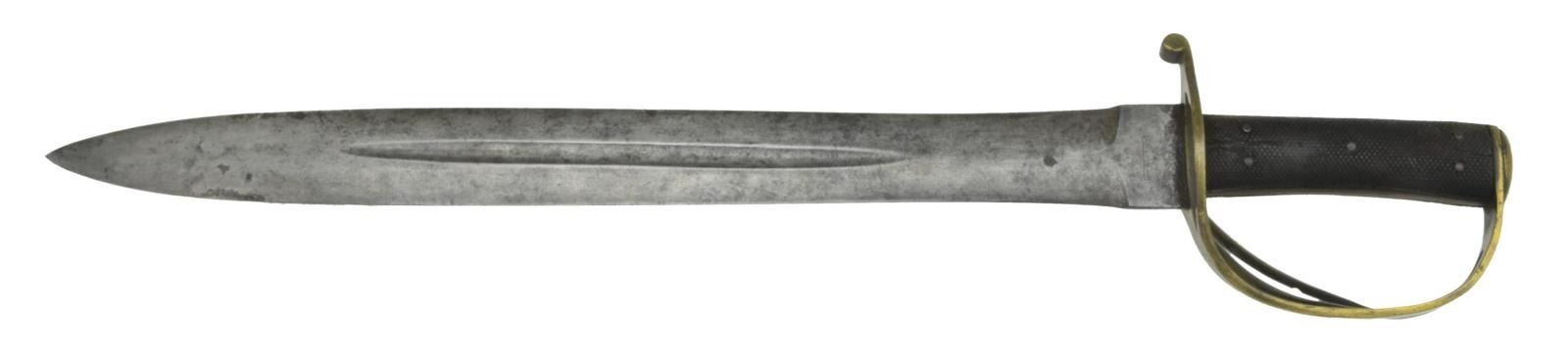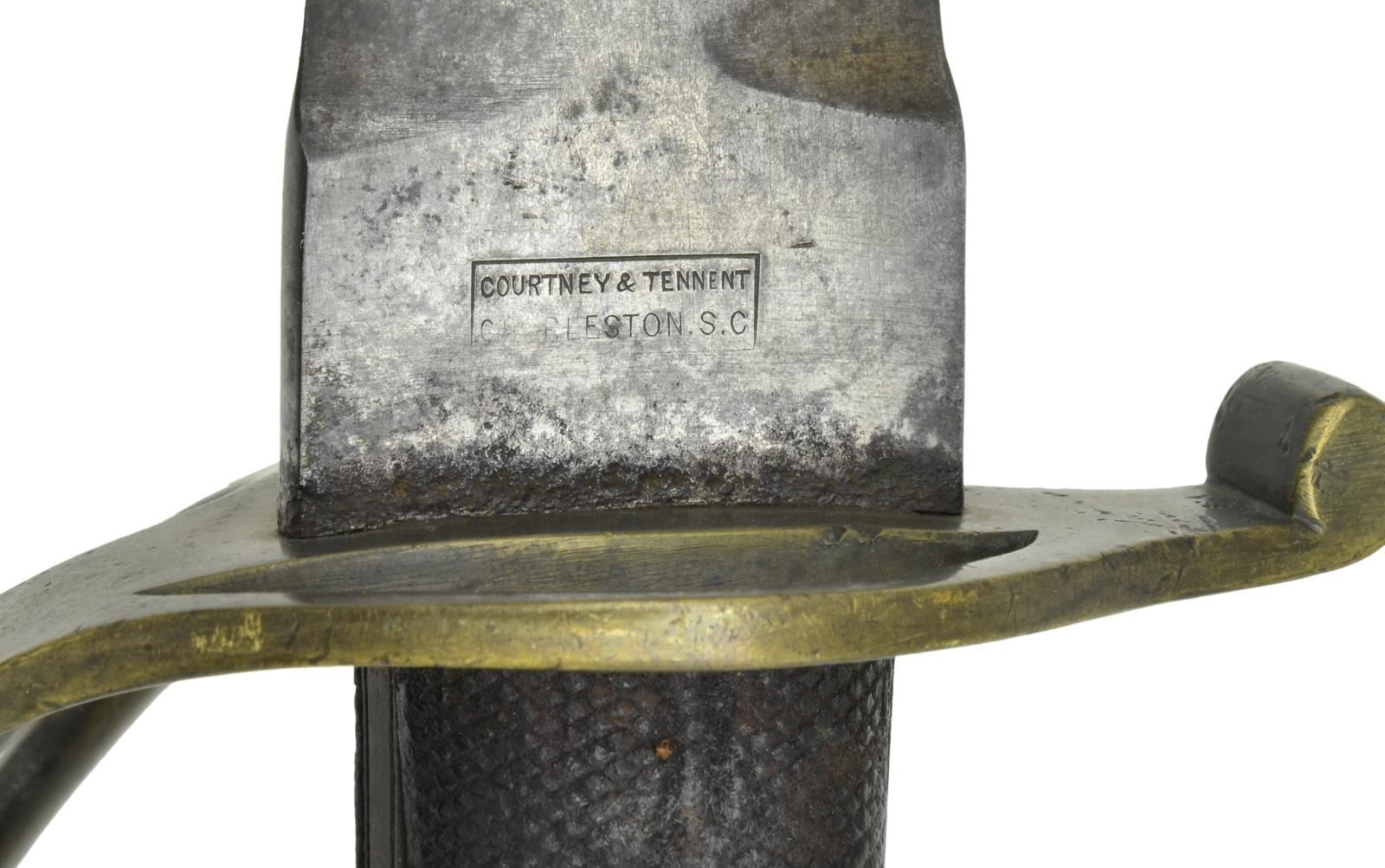SC NAVAL CUTLASS. “COURTNEY & TENNENT / CHARLESTON S.C.” stamped cartouche maker’s mark on ricasso of 19.75” double edged single fuller blade. top edge of ricasso stamped “MOLE” who was the British manufacturer. This pattern is unique to the Confederacy with no British counterpart, brass 3-branch slotted hilt with checkered compressed leather slab grips. CONDITION: very good overall, gray blade with scattered staining and light pitting, maker’s mark is superior even though “Charleston” only half struck, most of “Tennent” is readable. Toned brass patina. (02-19077/JS). $2,500-3,000.
