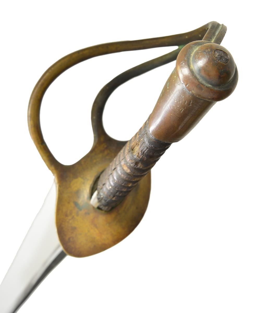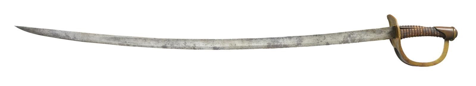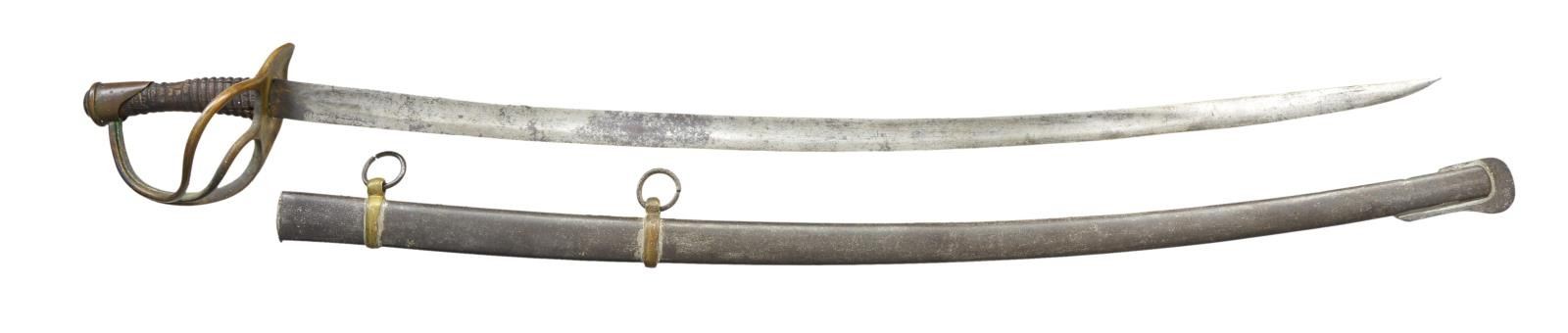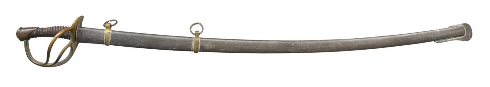 SABER & SCABBARD. Classic “Dog River” Confederate cavalry saber now known maker, Louis Haiman, Columbus, Georgia. 35.5” unstopped fuller blade, heavy branched hilt in style of US model 1840 heavy cavalry. Spiral cut wood grip missing leather & wire. This is honest an example with original Haiman scabbard, rich patina throughout. CONDITION: good overall, guard slightly loose due to loss of protective leather washer, blade uncleaned, gray/white, staining & rust. Grip has hand worn patina worn spiral cuts, scatted small white paint spatter on hilt and scabbard. Well fit scabbard is sound missing soldered throat collar as most are. (02-19139/JS). $2,500-3,000.