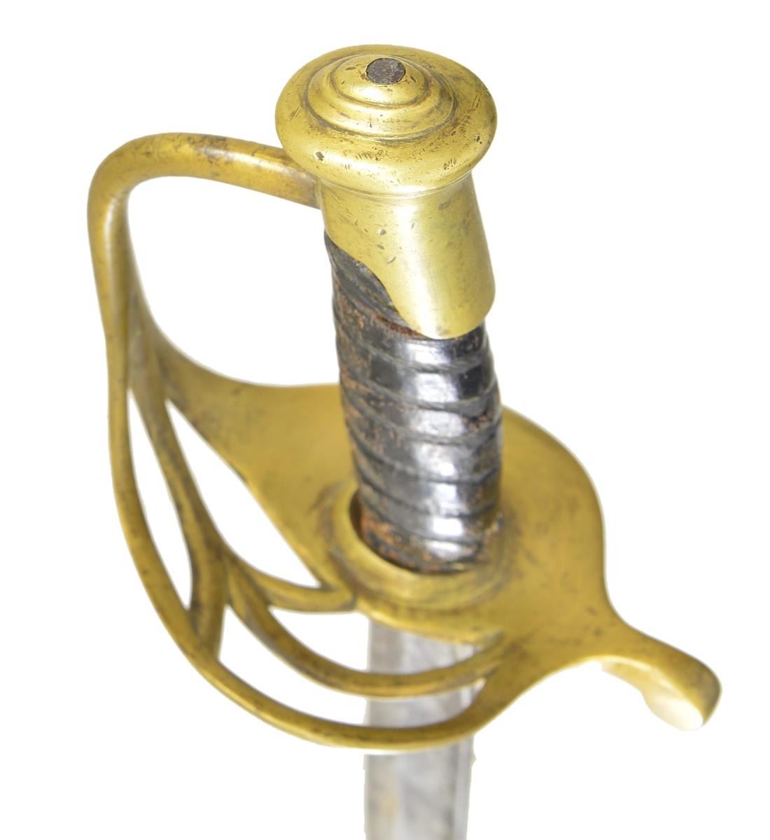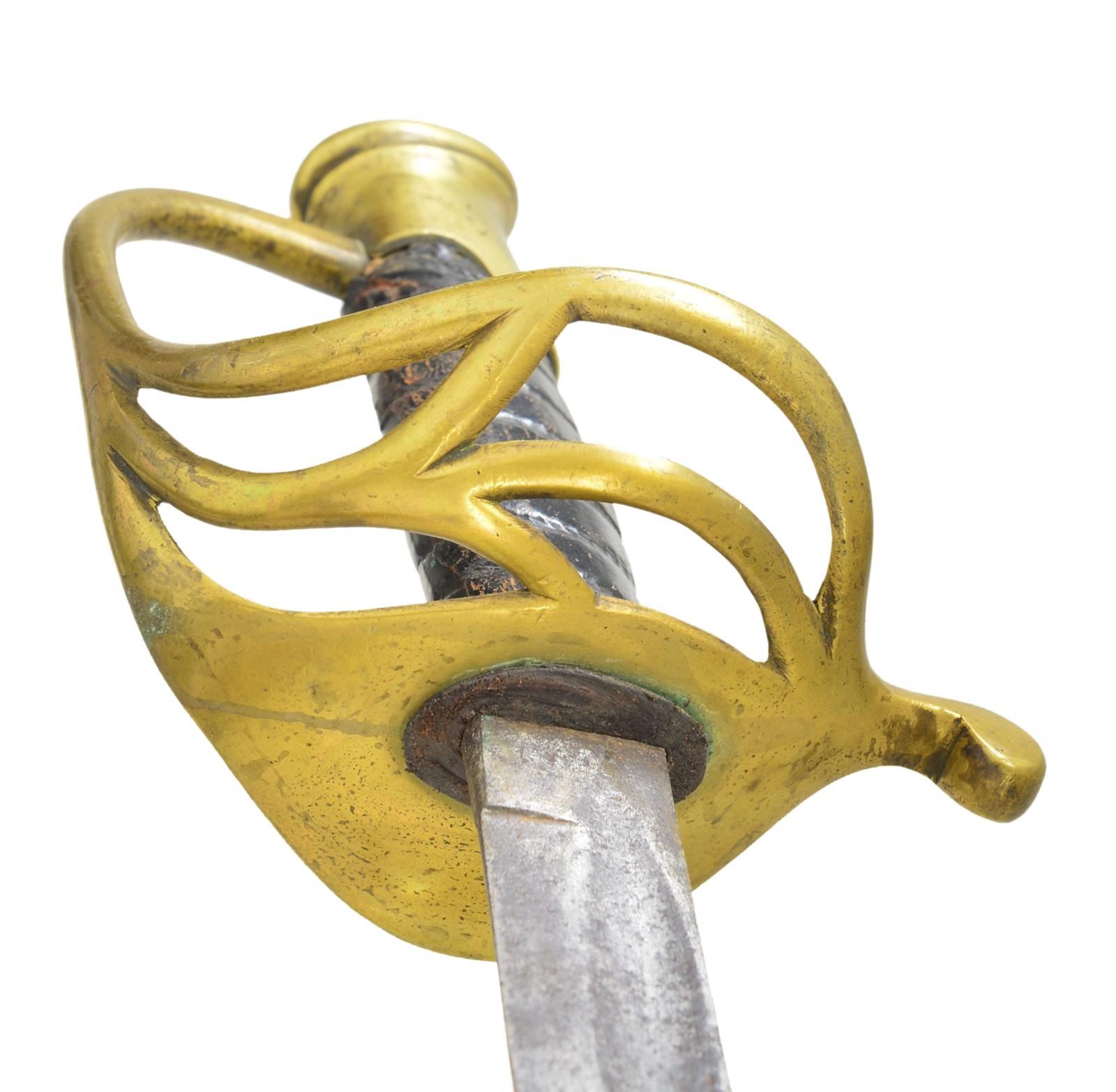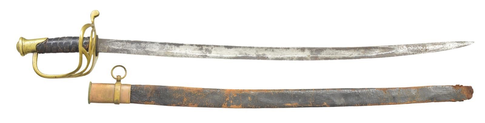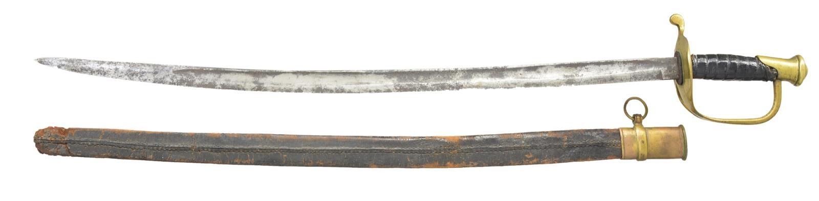CONFEDERATE MULTI BRANCH OFFICER’S SWORD. 29” unstopped fuller blade with pen-knife type ricasso characteristic to College Hill, Nashville TN made swords. This same hilt is seen on Houston Texas made swords and I have always wondered what happened to operation after Nashville fell as these hilts are almost identical in design to JC Wilson of Houston, TX. Unique smooth muti-branch guard, plain quillon, plain undecorated pommel cap. This exact word is pictured on page 137 of “American Swords & Makers’ Marks” 1999 by C. D. Furr. CONDITION: sword is very good overall, blade cleaned with pitting, original leather grip missing wire wrap. The accompanying scabbard is dry & flaking, fits well, with one reproduction brass mount. (02-19332/JS). $2,000-3,000.