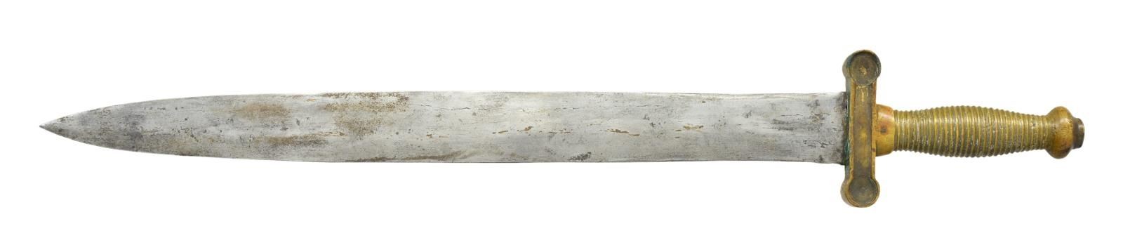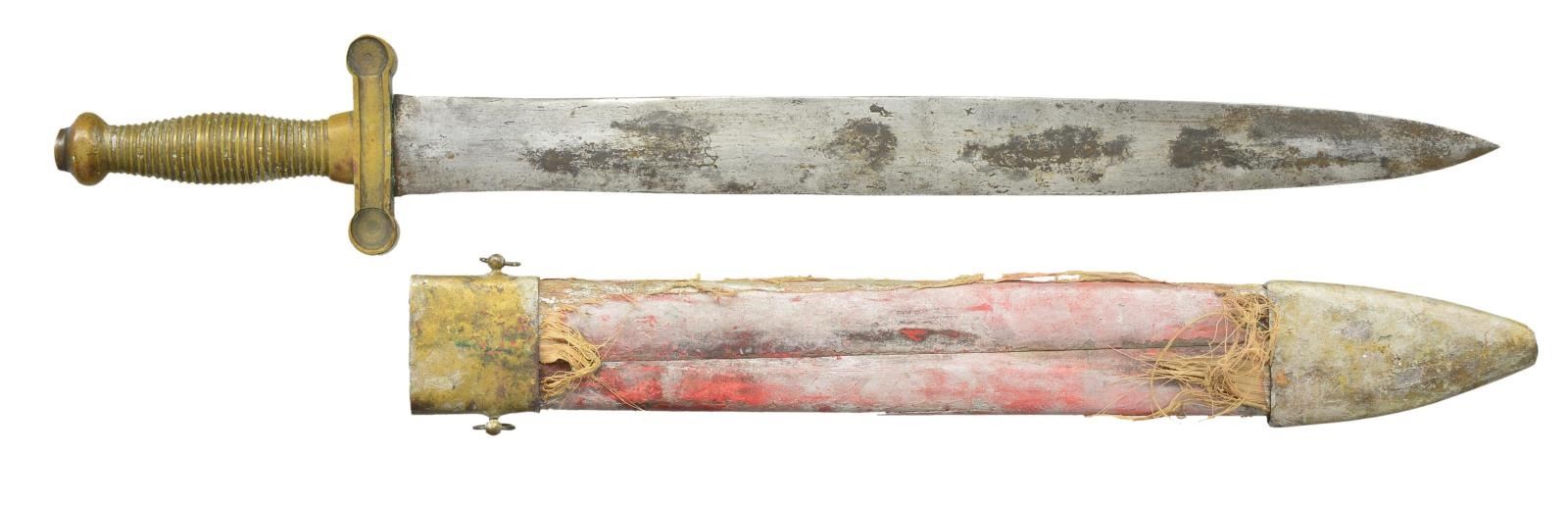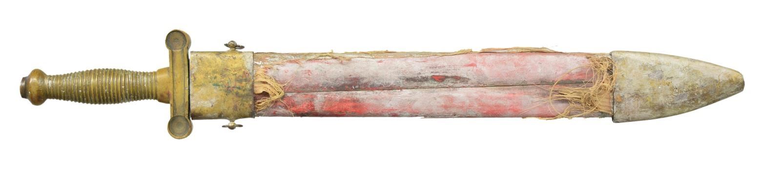 WOOD SCABBARD. 24” overall, 18.5” double edged blade, attributed to Macon Georgia often with ribbed grip. I am not sure where these were made but no doubt in deep South. The pinned wood slab wood scabbard is very similar in construction to the cavalry scabbards made late war by Hammond Marshall in Atlanta including the sheet iron mounts. This sword had been painted silver, almost all worn off the grip, but scabbard still covered along with added cloth cover and 2 soldered rings to throat. A good restorer could help this probable postwar theatrically used sword scabbard. The sword itself is about as good as you will find. This sword had a story to tell. CONDITION: sword is very good overall, blade retains some original armory finished surface, staining, light pitting, dulled edges, scabbard sound, drag unsoldered and loose, one slab cracked through. (02-19099/JS). $1,500-2,000.