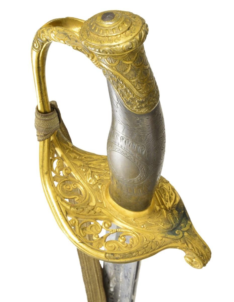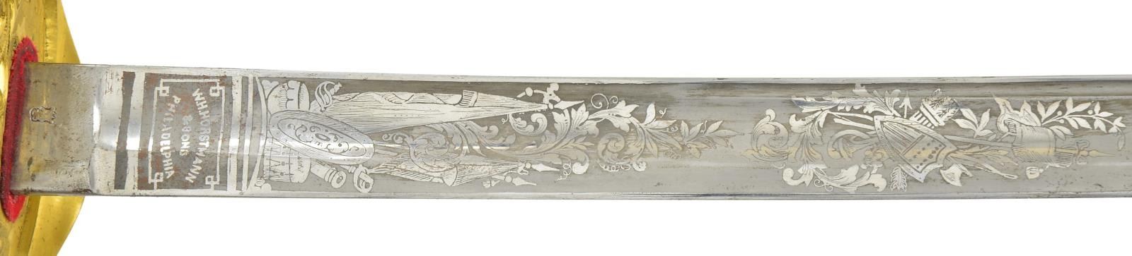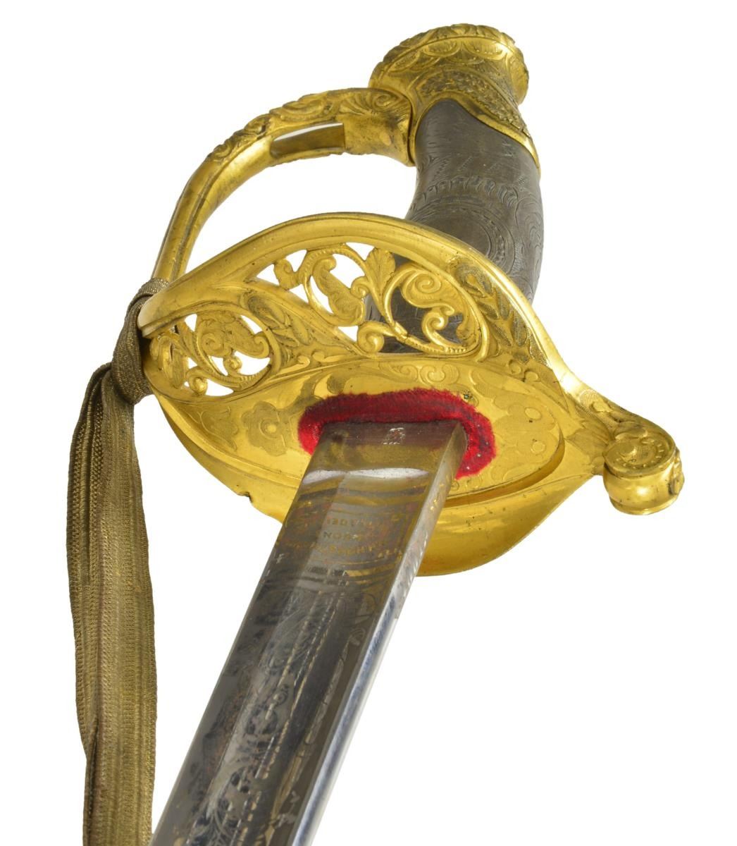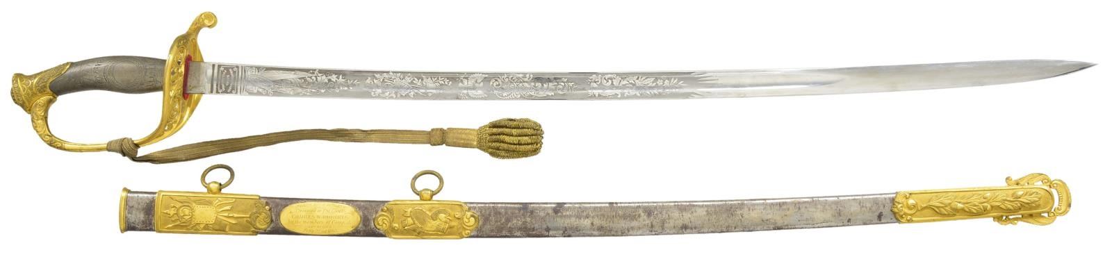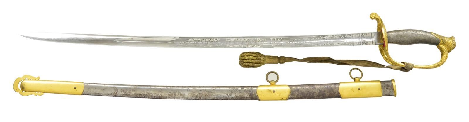 CHARLES W. ROBERTS (1838-1895) entered service as lieutenant in newly formed 124th PA Volunteers August 1862 soon into the fray fighting gallantly at Battle of Antietam in September, promoted captain February 17, 1863 and this elegant sword presented February 23 by men of his company. Charles and 124th would take part in Battle of Chancellorsville and would muster out at end of term of service May 17, 1863. With Lee’s invasion of Pennsylvania, Charles would join Pennsylvania 43rd emergency regiment July 1, 1863, after Gettysburg threat done, the 43rd was disbanded August 13, 1863. Charles would return home to his farm. He had lost his older brother Colonel George W. Roberts killed at Battle of Stone’s River, December 1862. UNATTACHED ACCESSORIES: : fine wartime vignetted CDV by Guterkunst, Philadelphia. Charles W Roberts calling card with eagle staff button attached inscribed: “button taken from C. W. Roberts coat, the one he was buried in”. CONDITION: very fine overall, “as found”, never cleaned, blade retains virtually all it original polish &luster. Hilt, pommel, & scabbard mounts retain almost all their original gold wash, steel scabbard body uncleaned has dark iron patina, balance bright polished surface as made. Sword knot is complete and fine. CDV & card with 14mm general staff button is fine. (02-17012/JS). $8,000-10,000.