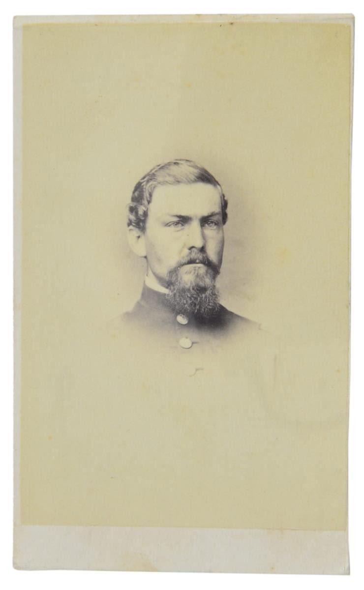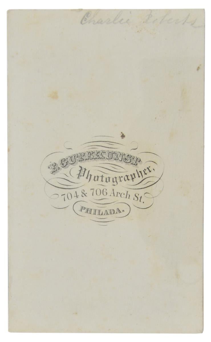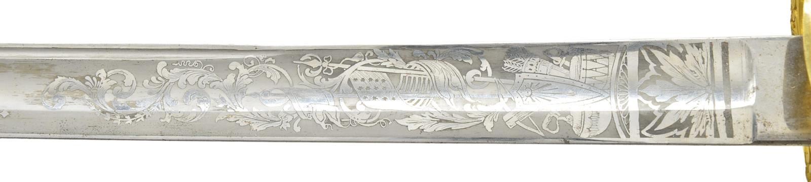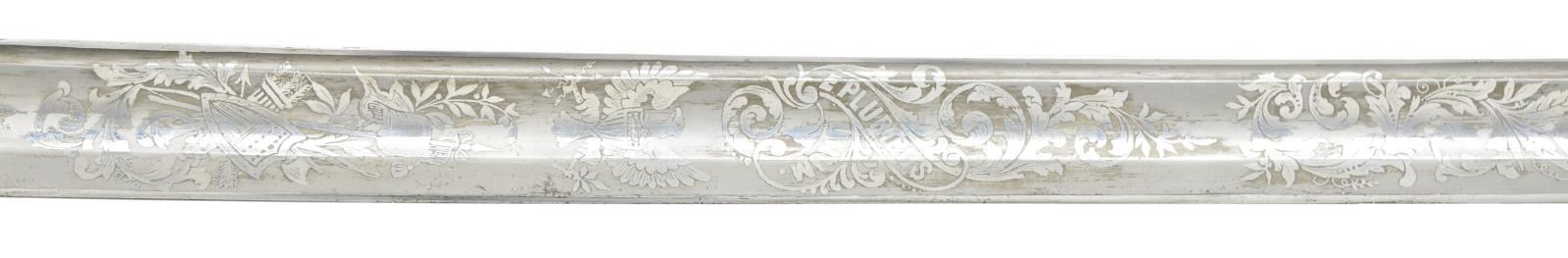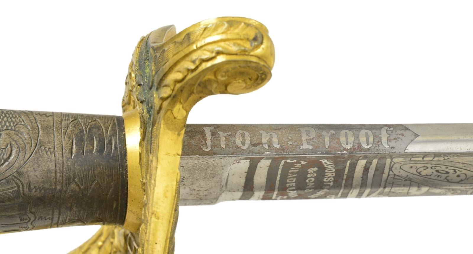 CHARLES W. ROBERTS (1838-1895) entered service as lieutenant in newly formed 124th PA Volunteers August 1862 soon into the fray fighting gallantly at Battle of Antietam in September, promoted captain February 17, 1863 and this elegant sword presented February 23 by men of his company. Charles and 124th would take part in Battle of Chancellorsville and would muster out at end of term of service May 17, 1863. With Lee’s invasion of Pennsylvania, Charles would join Pennsylvania 43rd emergency regiment July 1, 1863, after Gettysburg threat done, the 43rd was disbanded August 13, 1863. Charles would return home to his farm. He had lost his older brother Colonel George W. Roberts killed at Battle of Stone’s River, December 1862. UNATTACHED ACCESSORIES: : fine wartime vignetted CDV by Guterkunst, Philadelphia. Charles W Roberts calling card with eagle staff button attached inscribed: “button taken from C. W. Roberts coat, the one he was buried in”. CONDITION: very fine overall, “as found”, never cleaned, blade retains virtually all it original polish &luster. Hilt, pommel, & scabbard mounts retain almost all their original gold wash, steel scabbard body uncleaned has dark iron patina, balance bright polished surface as made. Sword knot is complete and fine. CDV & card with 14mm general staff button is fine. (02-17012/JS). $8,000-10,000.