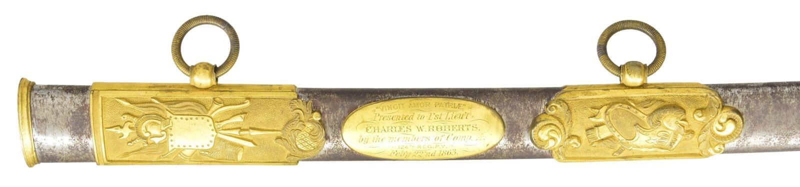 PRESENTATION SWORD OF LT. CHARLES ROBERTS, 124TH PENNSYLVANIA. Very high grade Horstmann foot officer’s sword, 32” bright lustrous blade with 16” patriotic etched panels, sheet silver engraved grip, fancy engraved hilt with raised relief panoply of arms on top of guard, pommel is fully engraved on all sides, bottom of guard has extra engraving around red cloth protective washer. Polished steel scabbard has raised relief mounts with panoply of arms, and oak leaves & acorns. You will not see a higher grade Civil War foot officer’s sword and no doubt the finest Philadelphia made Horstmann.