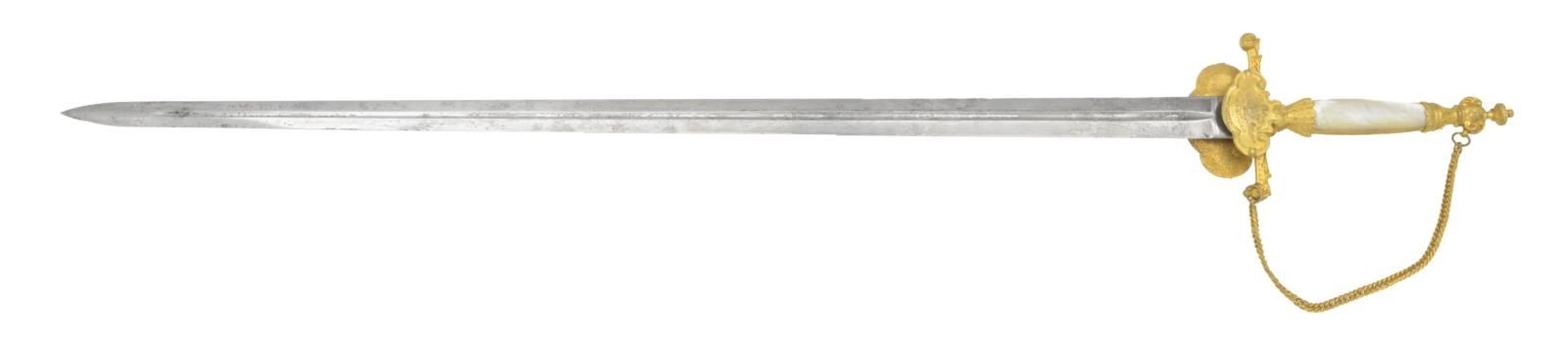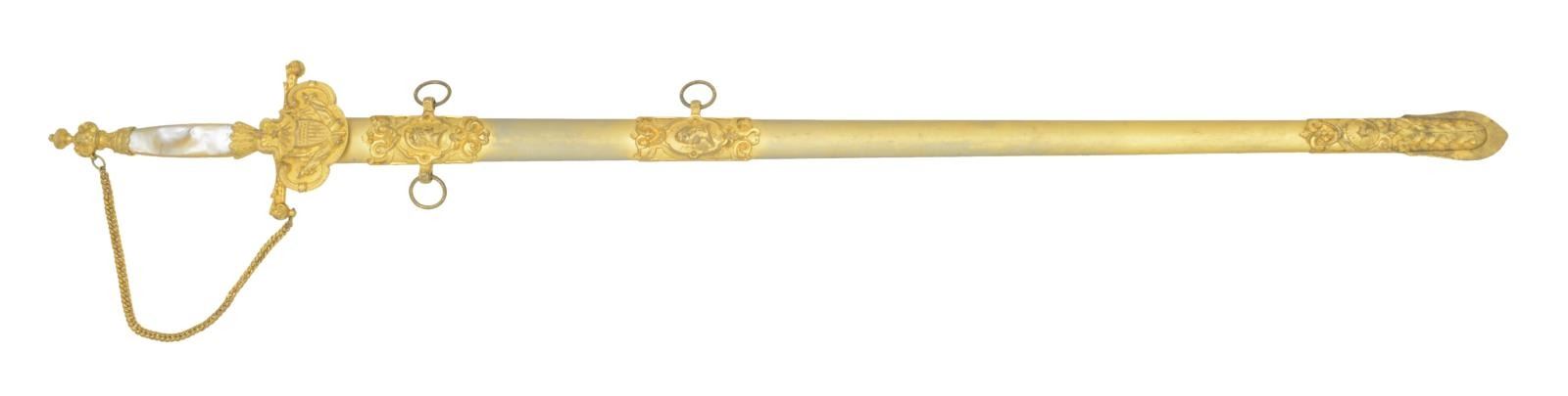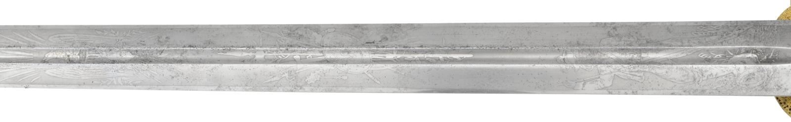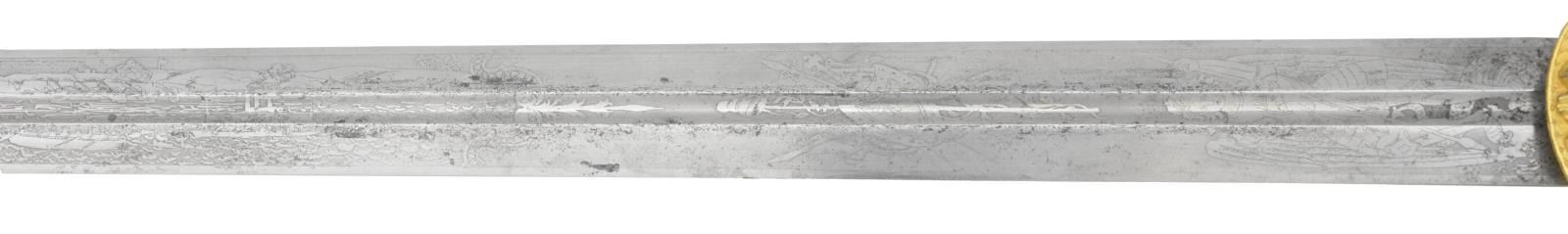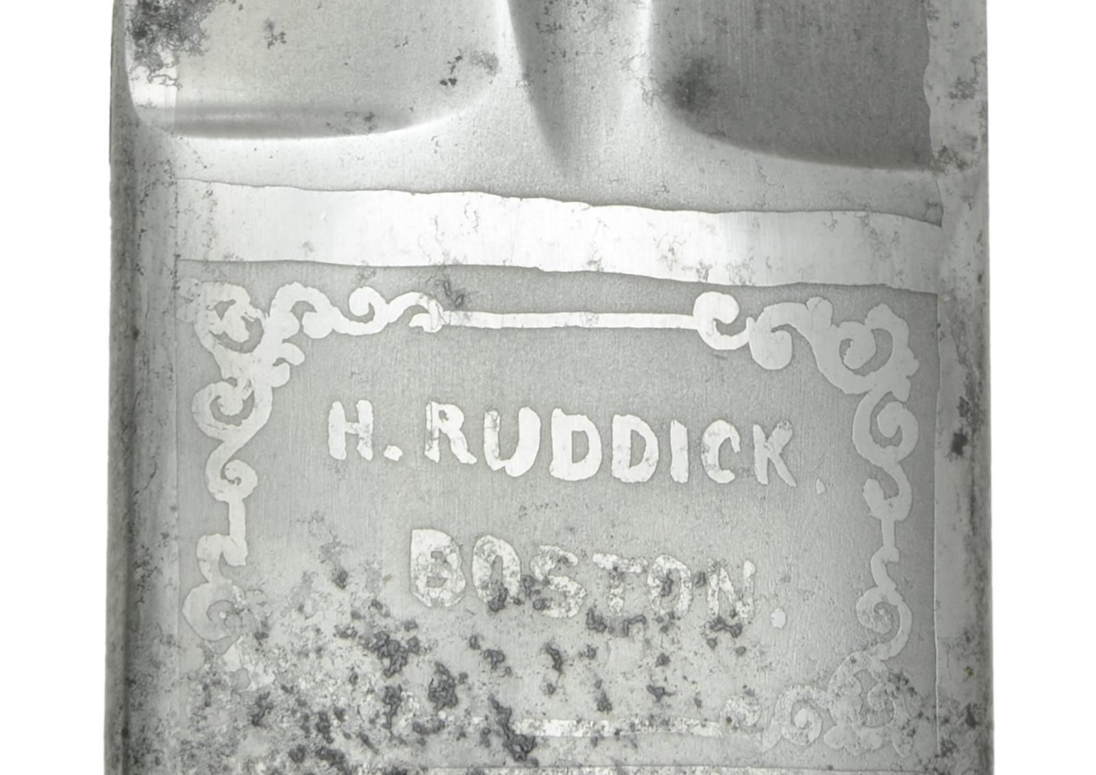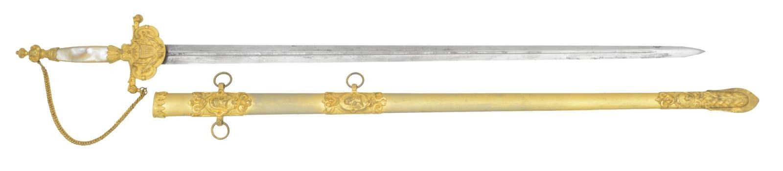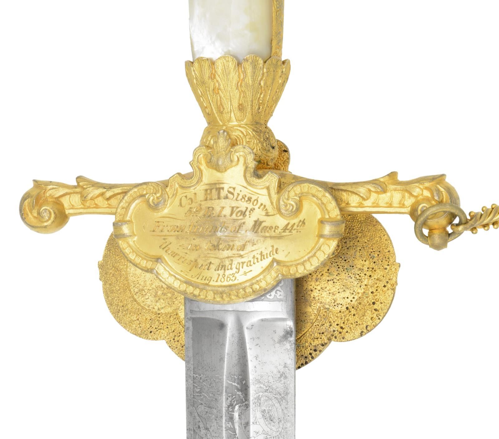 OF BOSTON PRESENTED TO COLONEL SISSON OF THE 5TH RHODE ISLAND. Overall length: 39”. Blade length: 30 3/4". Blade has a single central narrow fuller running nearly the length of the blade. Blade is etched over 2/3 of its length with various military, patriotic & foliate motifs, including a 3” etching of an ark angel & another 3” etching of an early soldier loading a musket. Further motifs include an American eagle, spray of classical arms & a side wheeler riverboat navigating a river. There is an etched panel on the ricasso that reads “H. RUDDICK BOSTON”. Hamilton Ruddick is listed in the 1860 city directory as a sewing machine maker, but he was producing swords as early as 1862 & continued through the end of the Civil War. Heavily gilded brass hilt featuring a large downturned guard on the front with a motif that includes cannons, flags, a central Federal shield, & a star surrounded by glory. The smaller rear guard is engraved “Col. H.T. Sisson 5th R.I. Vols. From friends of Mass 44th in token of their respect and gratitude Aug. 1863.”. Henry Tillinghast Sisson was commissioned in 1861 as a Lieutenant in the 1st Rhode Island and served at Bull Run. In April of ’62 he was promoted to Major of the 3rd Rhode Island Heavy Artillery, and in November of that year he became Colonel of the 5th Rhode Island Infantry that later became the 5th Rhode Island Heavy Artillery. He served with distinction throughout the war and served his native state as Lieutenant Governor from 1875 to 1877. Interestingly, Colonel Sisson is credited with inventing the 3-ring binder that is so indispensable in business, government & academics today. The cruciform cross guard of the sword is embellished with flourishes & foliate motifs. The chained knuckle bow joins the impressively decorated urn pommel at the midpoint. The ornate ferrule resembles a thistle and the side straps of the 2-piece mother of pearl grips are embellished with flourishes & laurel leaves. The scabbard has a gold wash on the body with heavily gilded mounts. The top mount features the head of a Roman soldier and the central mount is adorned with the head of Liberty. The drag shows a rippled leaf motif and repeats the star & glory design. CONDITION: blade shows a pleasing light gray patina with scattered spotty staining and a small lightly pitted area near the tip. Etching remains impressive. Hilt is undamaged and retains nearly all of its original gilded finish. Scabbard mounts also retain nearly all of their original finish and the scabbard body shows some superficial wear. (02-19578/BF). $7,000-9,000.