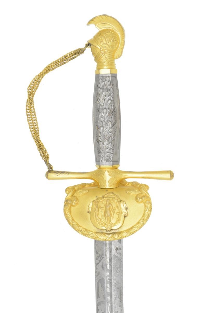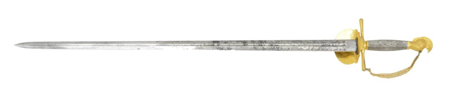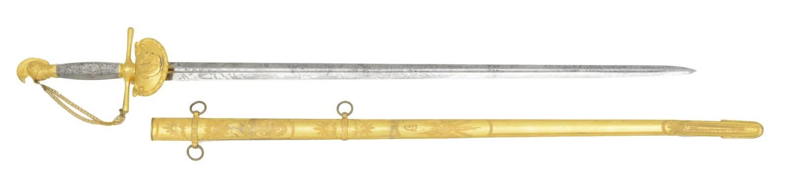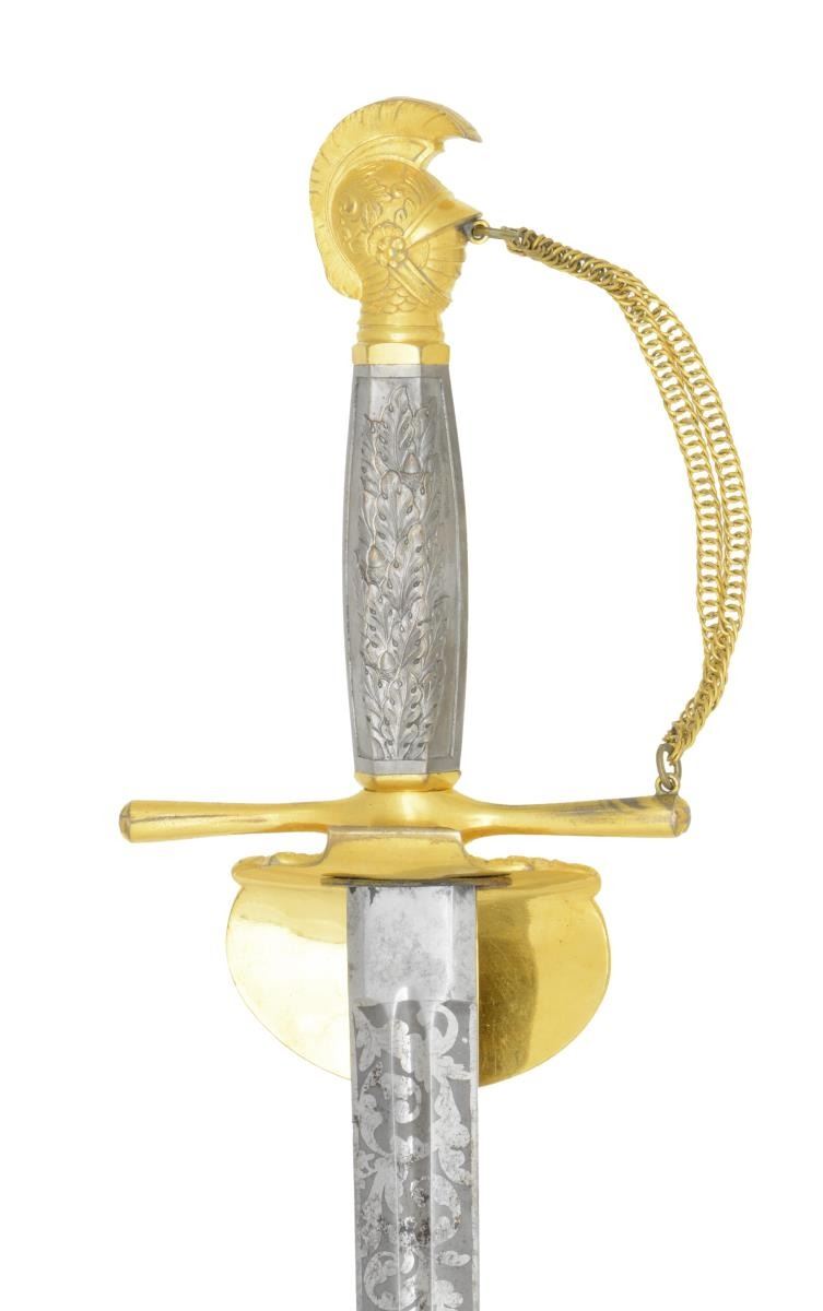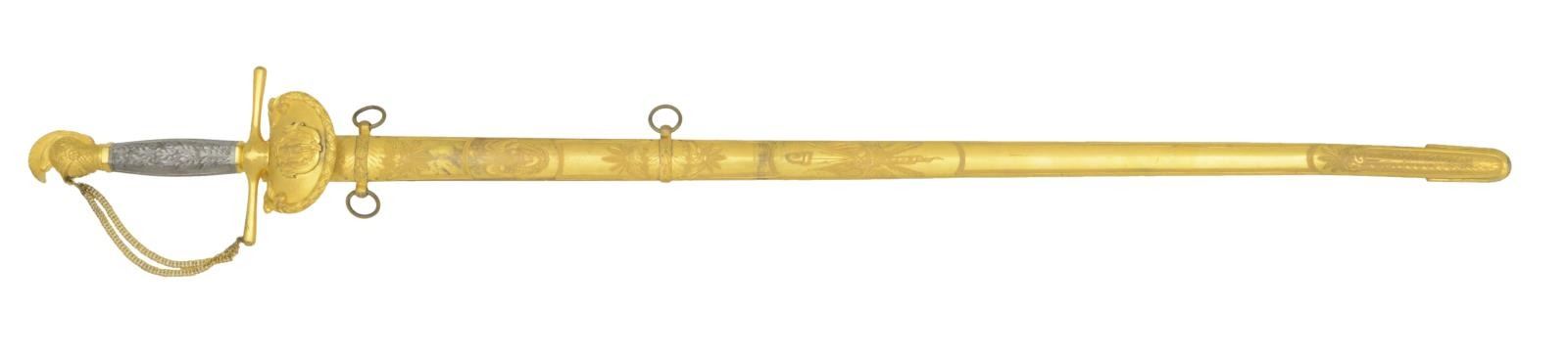 MILITIA OFFICER’S SWORD. Overall length: 38 1/2". Blade length: 30”. This exceptionally high-grade Militia Officer’s sword is likely for a General Officer and dates from the Mexican War to the Civil War. The blade has a narrow central fuller running nearly the length of the blade. Blade is etched over 2/3 of its length with various foliate, patriotic & military motifs, including a large spread-wing eagle. Heavily gilded hilt with a downturned guard that bears the Massachusetts state seal surrounded by a wreath of leaves & flourishes. Simple cruciform guard with star embellished ends. The chained guard joins the artistically rendered knight’s head pommel just below the visor. The detail on the pommel is quite exceptional accentuating the scaled armor & decorated helm with feathered crest. Beautiful hexagonal silver grip with deeply cast oak leaves & acorns on both sides. Gilded brass scabbard with various foliate etching and a large spray of arms with liberty cap. The upper engraved feature is the most interesting, being an eagle atop a shield engraved with the Massachusetts “bent arm & sword”. CONDITION: blade shows some original factory polish with scattered staining. Gold finish on the hilt is nearly complete, as is the silver finish on the grip. The scabbard retains 97% of original gilding and the engraving detail is superb. There is a slight bend at the tip of the scabbard, not affecting the blade of the sword. (02-19580/BF). $2,500-3,500.