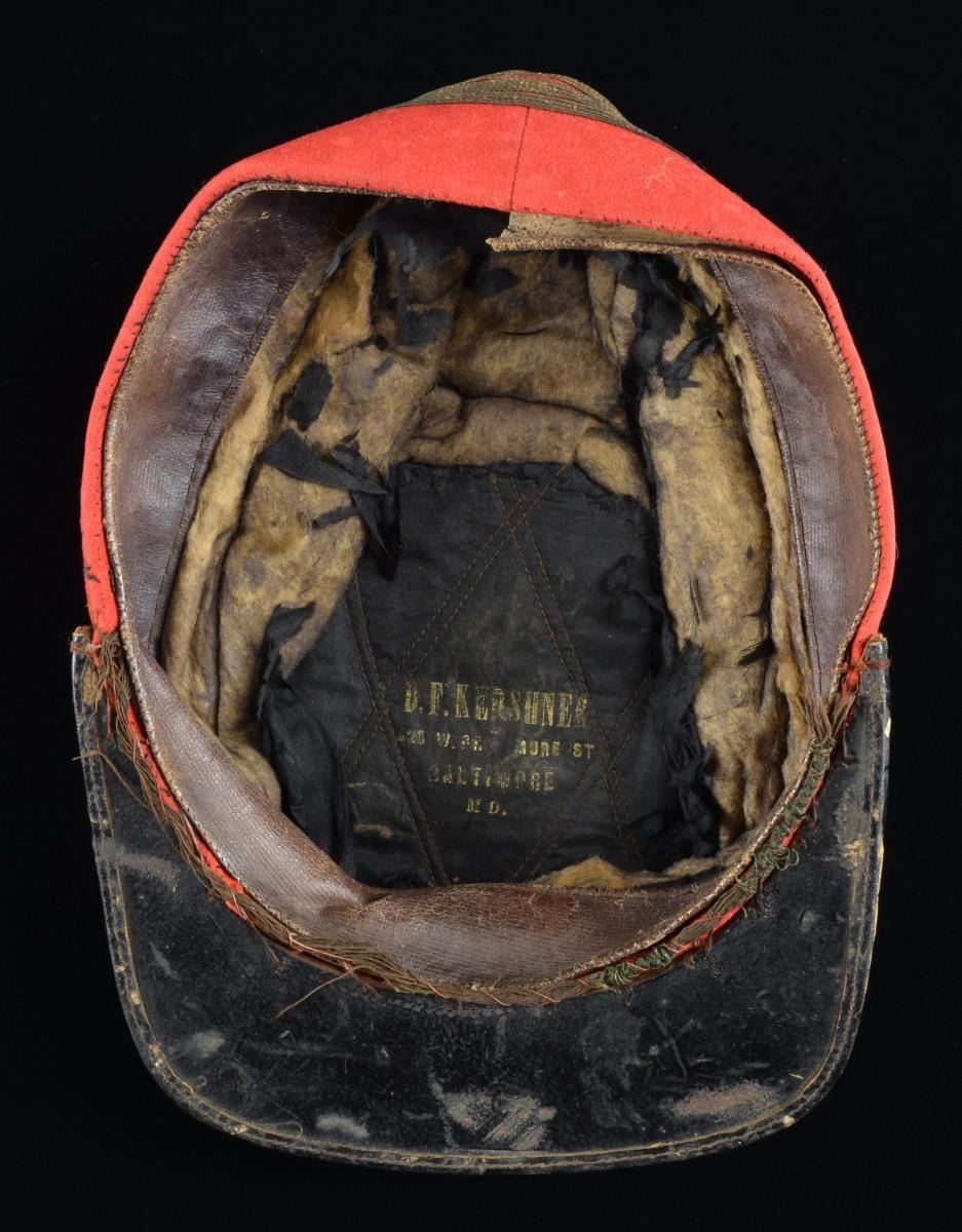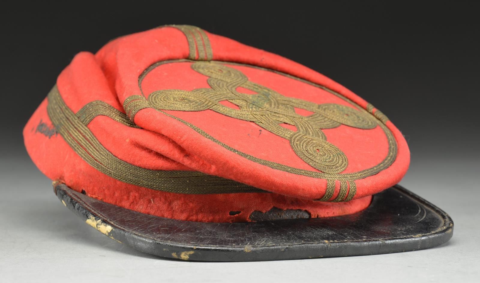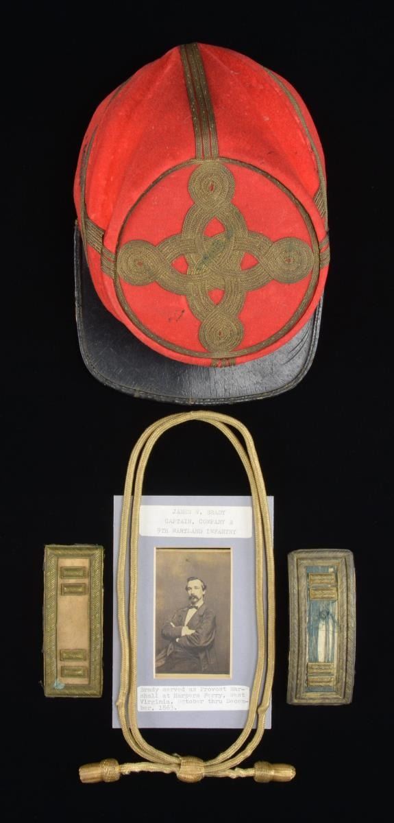 CHASSEUR CAP. Rare red quatrefoiled Baltimore made cap is from direct descent of James Brady family with signed affidavit from great grandson. Other personal affects include 2 captain's Smith patent shoulder straps, hat cord (GAR), patent papers, and copies of family letters, newspaper obituary. There is also included a fine CDV of Brady with ink inscription. This grouping was part of the late Arthur “Gil” Barrett and he displayed this as part of his Maryland collection for many years. James W. Brady (1829-1896) entered service as captain June 17, 1863 and commanded 2 companies of 9th Maryland infantry in Dept. of W. Virginia. Brady was detached as Provost Marshall of Harper’s Ferry September 30, 1863 till mustering out February 23, 1864. The 9th MD lost 124 men in their short time in service, 2 killed at battle of Charleston and 122 died in camp from disease. UNATTACHED ACCESSORIES: file of research, family affidavit, 2 US patents, one for improved “Mason jar”. CONDITION: cap is good overall, some mothing, but good color and braid tightly attached, complete sweatband, black silk lining is shattered on sides, but padded crown is good with good gold impressed maker mark. Straps are poor missing backing fabric, hat cord is fair. (02-17011/JS). $5000-7000.