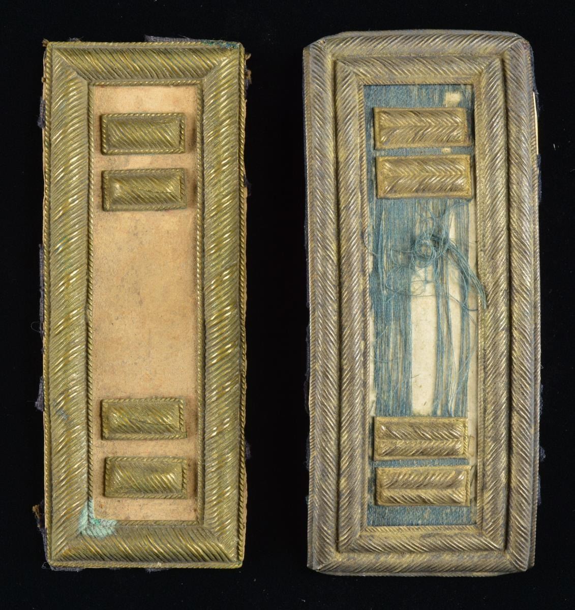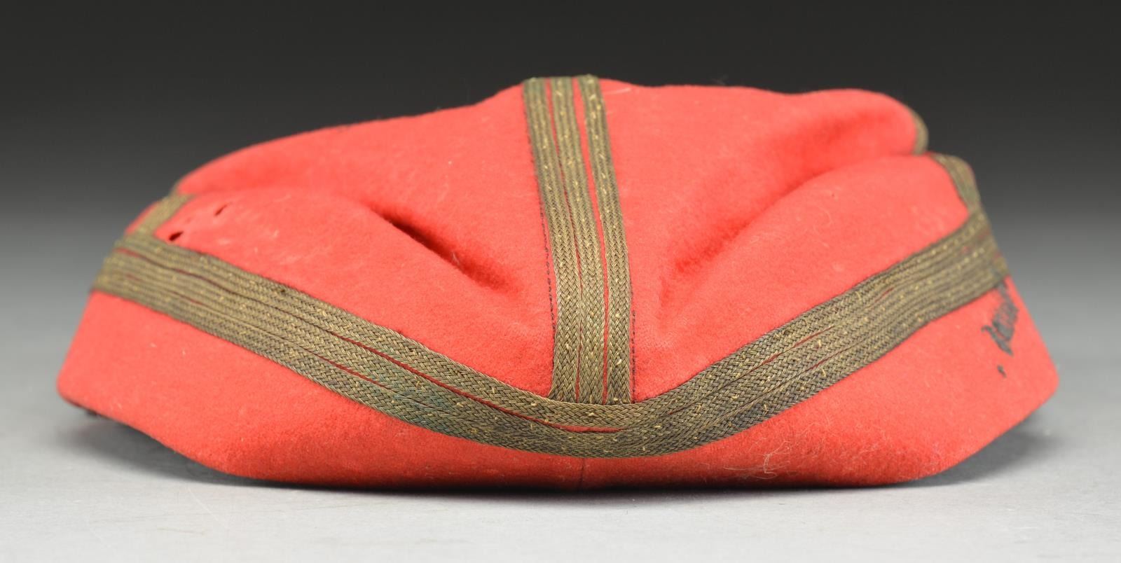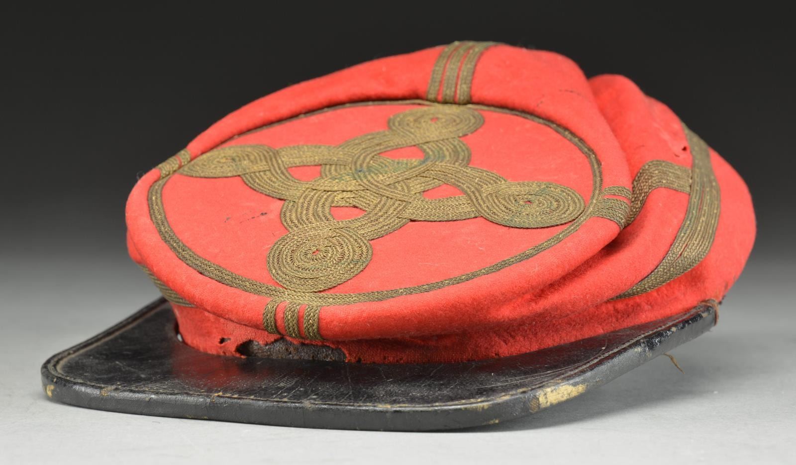 CHASSEUR CAP. Rare red quatrefoiled Baltimore made cap is from direct descent of James Brady family with signed affidavit from great grandson. Other personal affects include 2 captain's Smith patent shoulder straps, hat cord (GAR), patent papers, and copies of family letters, newspaper obituary. There is also included a fine CDV of Brady with ink inscription. This grouping was part of the late Arthur “Gil” Barrett and he displayed this as part of his Maryland collection for many years. James W. Brady (1829-1896) entered service as captain June 17, 1863 and commanded 2 companies of 9th Maryland infantry in Dept. of W. Virginia. Brady was detached as Provost Marshall of Harper’s Ferry September 30, 1863 till mustering out February 23, 1864. The 9th MD lost 124 men in their short time in service, 2 killed at battle of Charleston and 122 died in camp from disease. UNATTACHED ACCESSORIES: file of research, family affidavit, 2 US patents, one for improved “Mason jar”. CONDITION: cap is good overall, some mothing, but good color and braid tightly attached, complete sweatband, black silk lining is shattered on sides, but padded crown is good with good gold impressed maker mark. Straps are poor missing backing fabric, hat cord is fair. (02-17011/JS). $5000-7000.