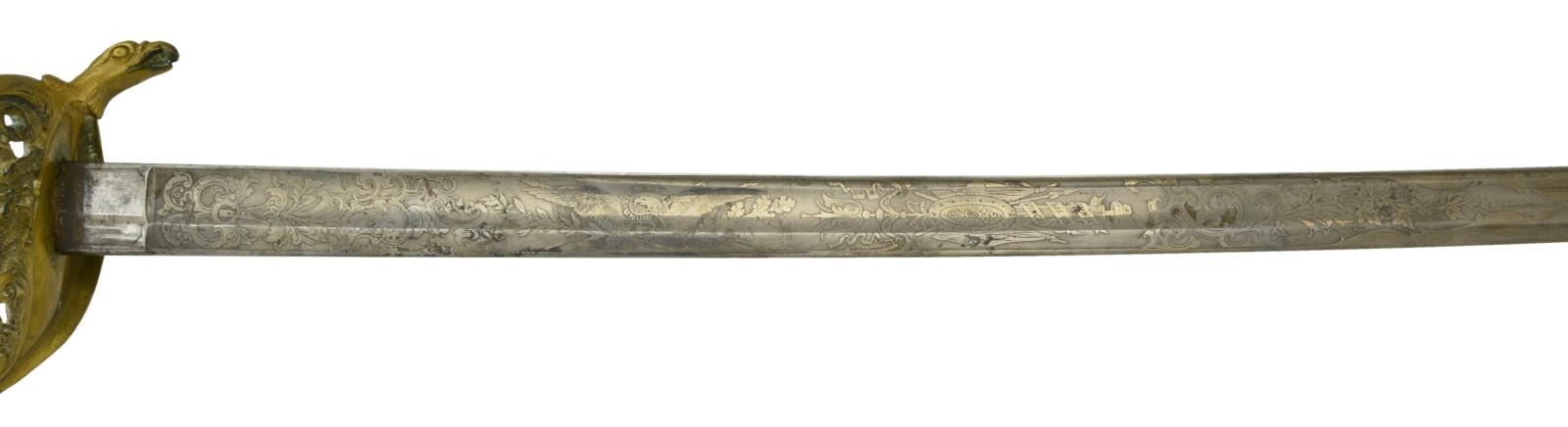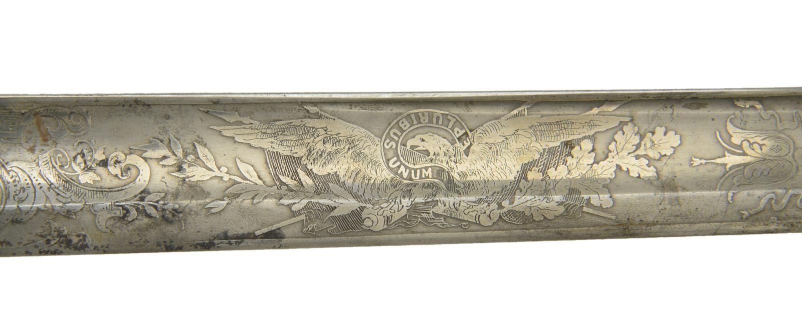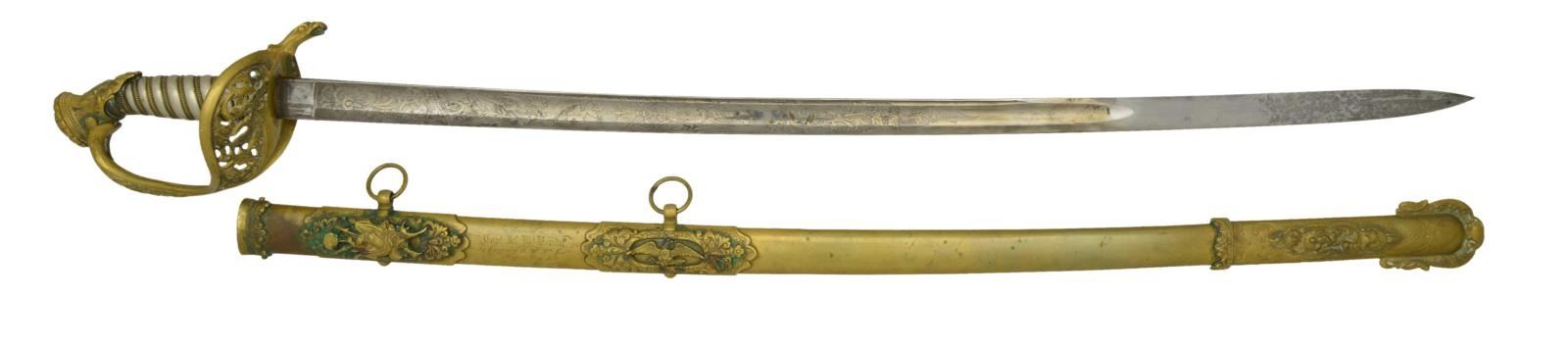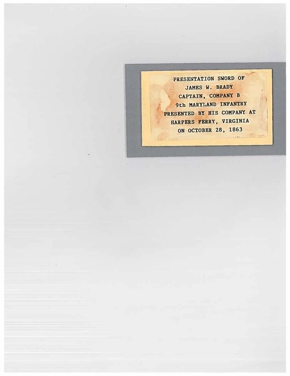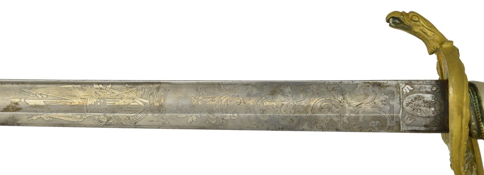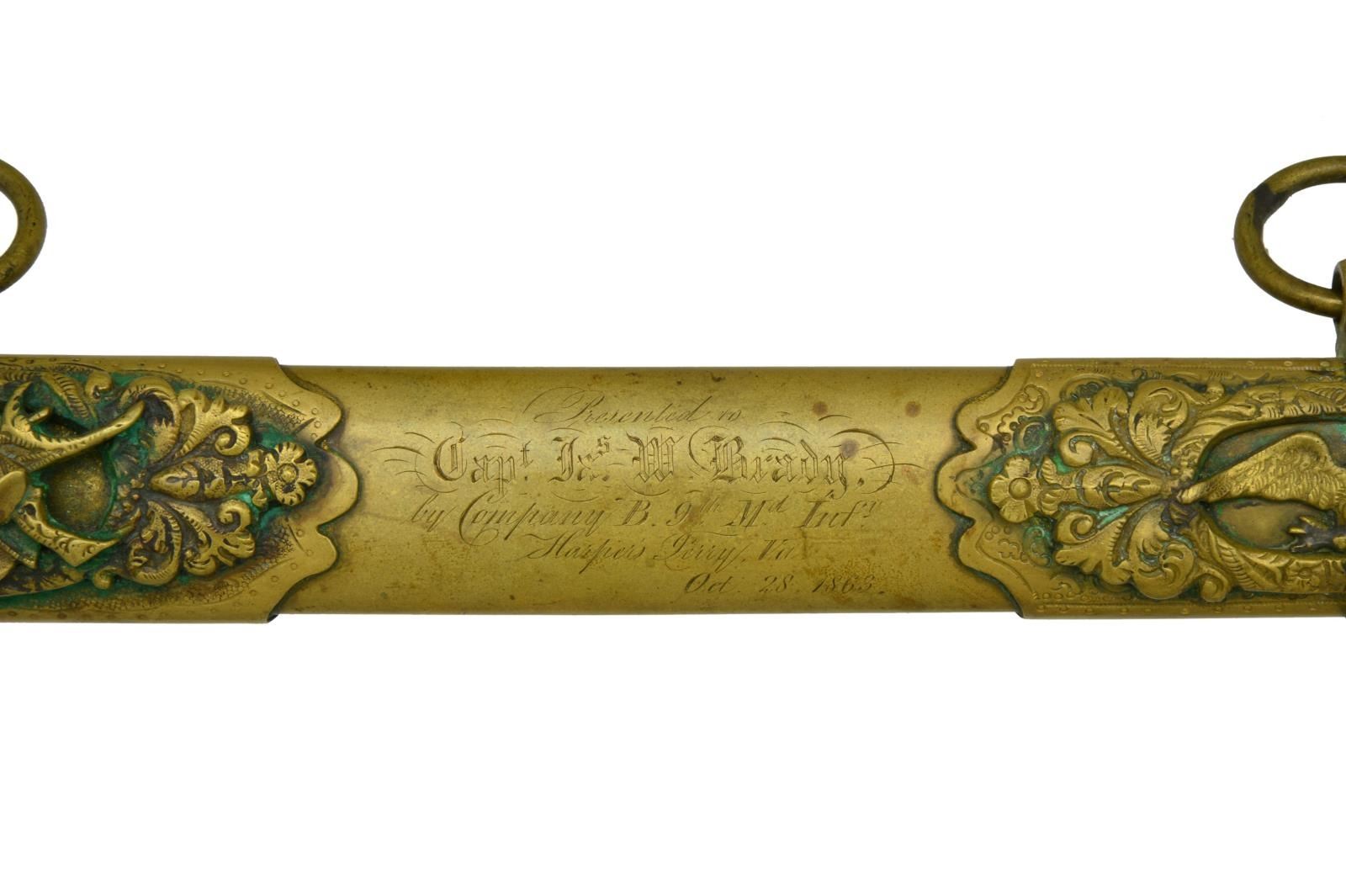 This sword was presented by his company when Capt. Brady was Provost Marshall of Harper’s Ferry. His men thought highly of him as this was expensive sword in 1863. The sword was made by Clauberg of Solingen Germany retailed by possibly Canfield & Brother in Baltimore a known Clauberg agent. Finely engraved between high relief decorated scabbard mounts on scabbard: “Presented to / Capt. Jas. W. Brady / by Company B. 9th Md Infy / Harper’s Ferry, Va / Oct. 28, 1863”. This extra fancy model 150 Staff & Field sword has eagle head quillon, drooped wing heraldic eagle in guard with pierced foliate design, pommel with high relief eagle & shield, spiral sheet silver grip. The top of pommel was mounted with large cabochon (now missing). Some may have thought it was valuable gemstone, but garnets were most typically used, this is easily restored if wanted. The solid brass scabbard has beautiful decorated mounts in high relief, top mount has panoply of arms, middle has eagle, and drag has soldier running with American flag, even the throat and blade are drag relief sculpted to match. 32” blade finely etched with patriotic motifs including fasces & liberty cap with riband: “IN HOC SIGNO VINCES”, spread wing eagle “E PLURIBUS UNUM”, fancy monogramed “US” and panoply of arms with 13 star American shield. James Brady sword was part of the late Arthur “Gil” Barrett and he displayed this as part of his Maryland collection for many years. CONDITION: very good overall, blade retains most of its original luster & finish, staining, pitting at ricasso. Brass has been cleaned and toned to light mustard patina, verdigris, gold wash remains in protected areas. (02-17010/JS). $6000-8000.