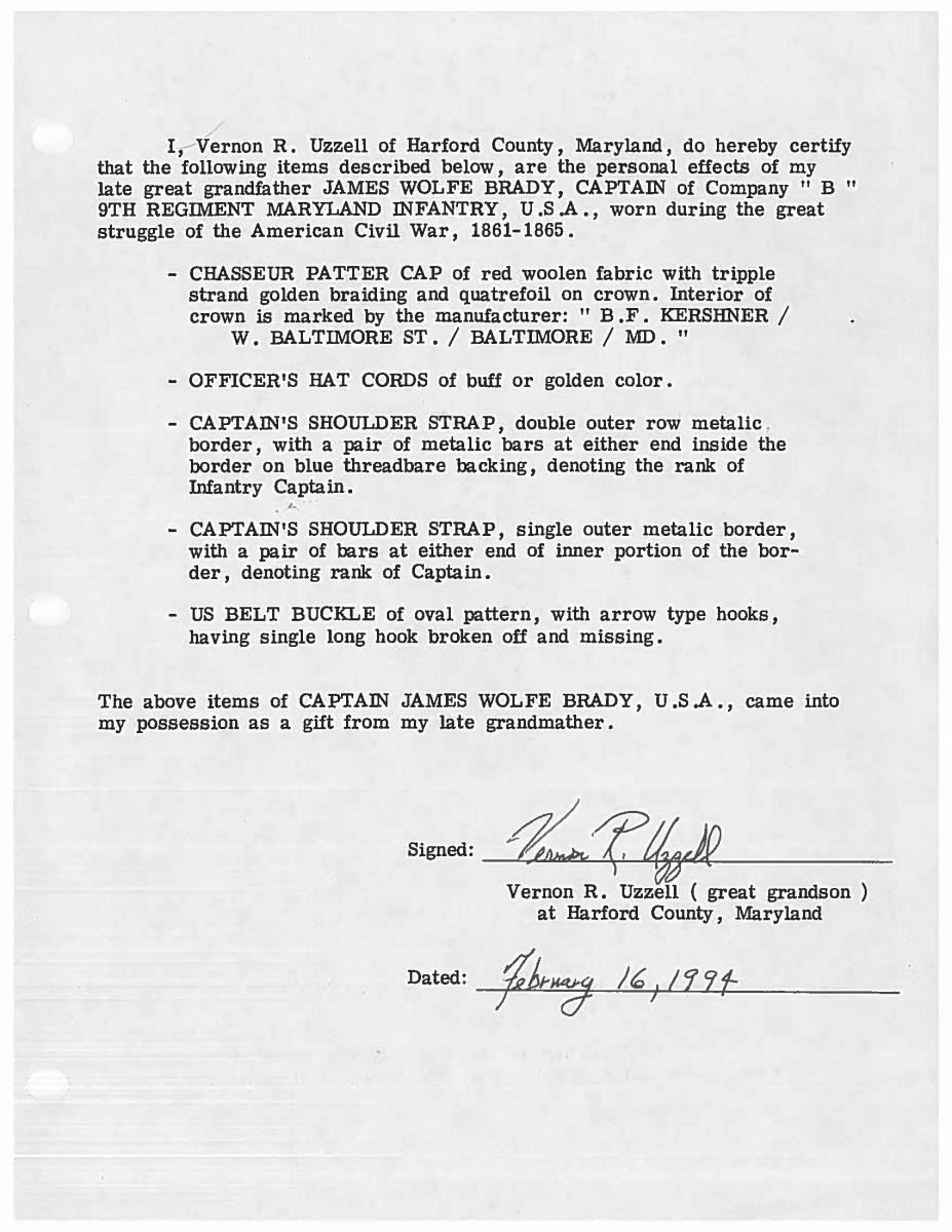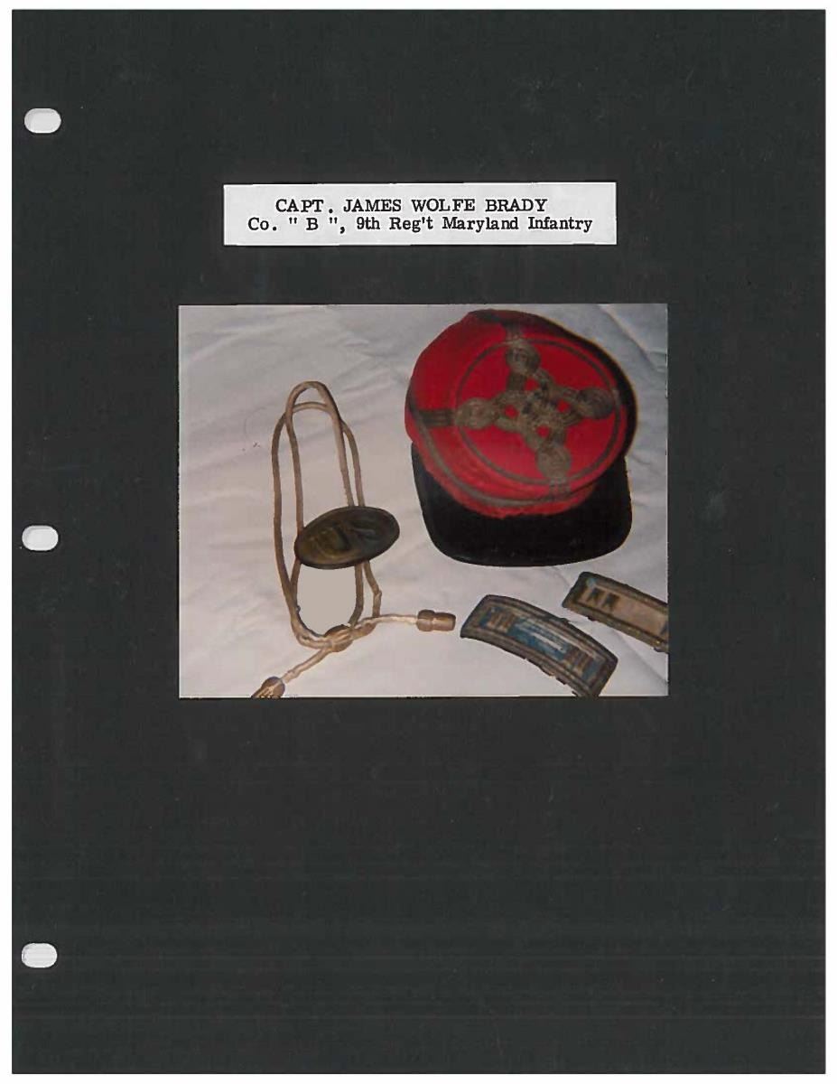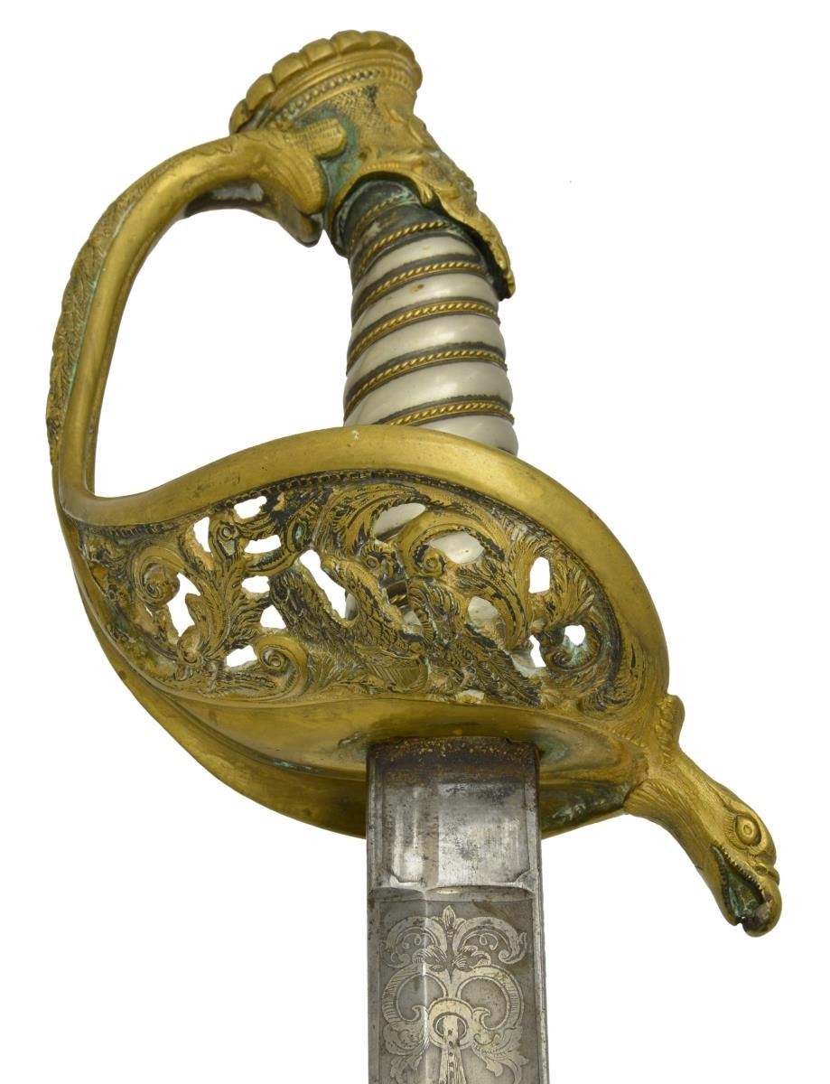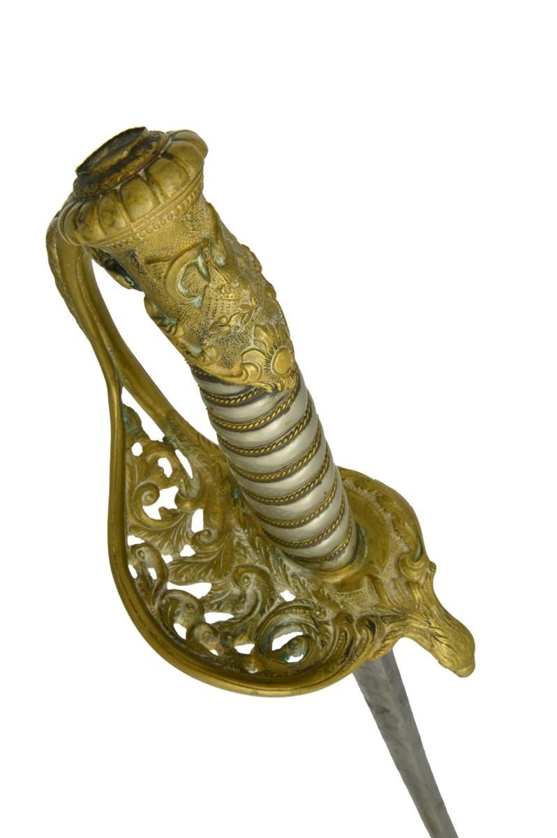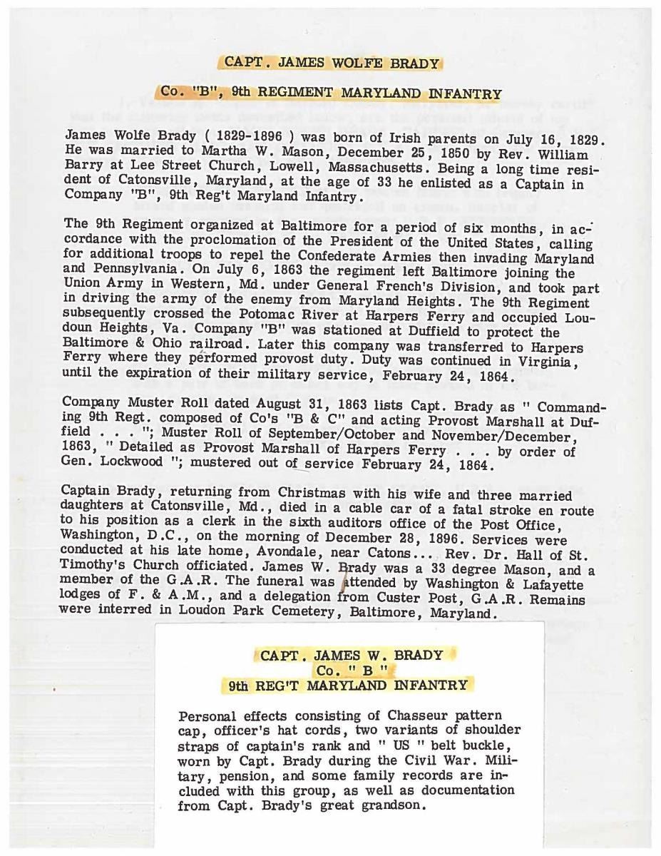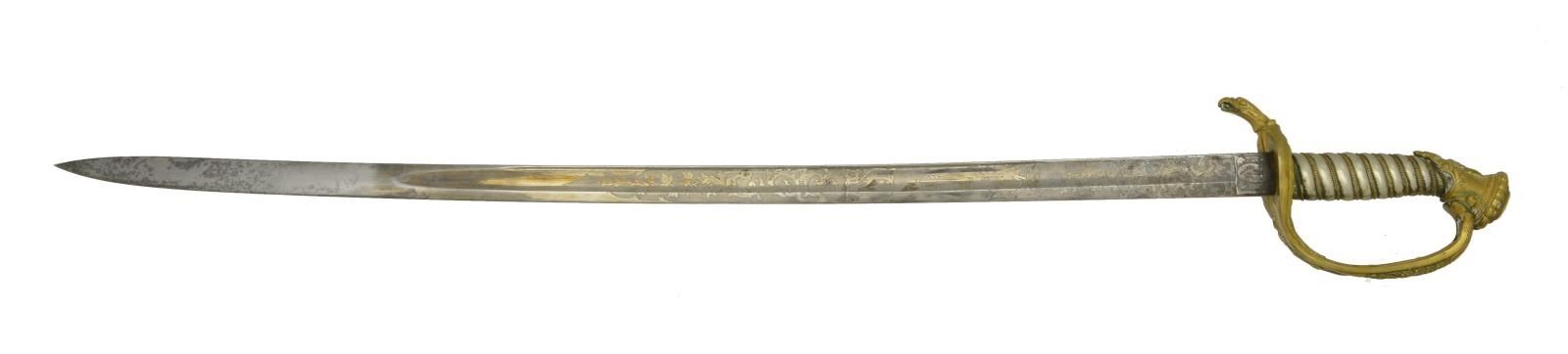 This sword was presented by his company when Capt. Brady was Provost Marshall of Harper’s Ferry. His men thought highly of him as this was expensive sword in 1863. The sword was made by Clauberg of Solingen Germany retailed by possibly Canfield & Brother in Baltimore a known Clauberg agent. Finely engraved between high relief decorated scabbard mounts on scabbard: “Presented to / Capt. Jas. W. Brady / by Company B. 9th Md Infy / Harper’s Ferry, Va / Oct. 28, 1863”. This extra fancy model 150 Staff & Field sword has eagle head quillon, drooped wing heraldic eagle in guard with pierced foliate design, pommel with high relief eagle & shield, spiral sheet silver grip. The top of pommel was mounted with large cabochon (now missing). Some may have thought it was valuable gemstone, but garnets were most typically used, this is easily restored if wanted. The solid brass scabbard has beautiful decorated mounts in high relief, top mount has panoply of arms, middle has eagle, and drag has soldier running with American flag, even the throat and blade are drag relief sculpted to match. 32” blade finely etched with patriotic motifs including fasces & liberty cap with riband: “IN HOC SIGNO VINCES”, spread wing eagle “E PLURIBUS UNUM”, fancy monogramed “US” and panoply of arms with 13 star American shield. James Brady sword was part of the late Arthur “Gil” Barrett and he displayed this as part of his Maryland collection for many years. CONDITION: very good overall, blade retains most of its original luster & finish, staining, pitting at ricasso. Brass has been cleaned and toned to light mustard patina, verdigris, gold wash remains in protected areas. (02-17010/JS). $6000-8000.