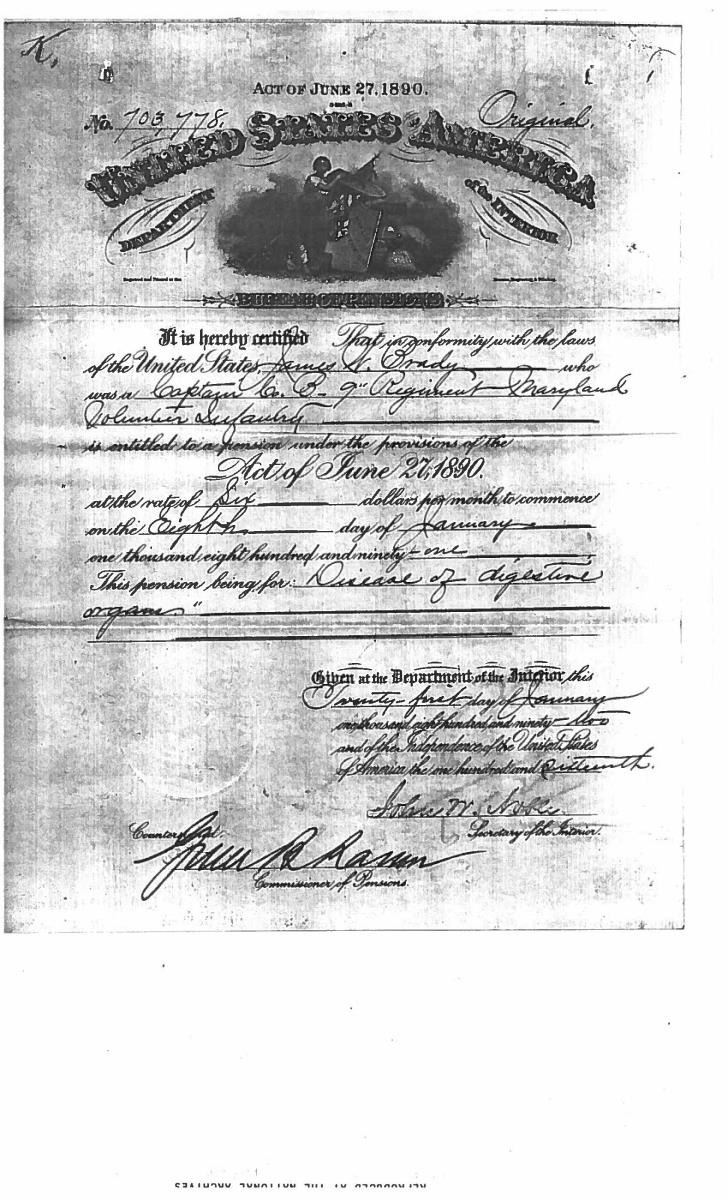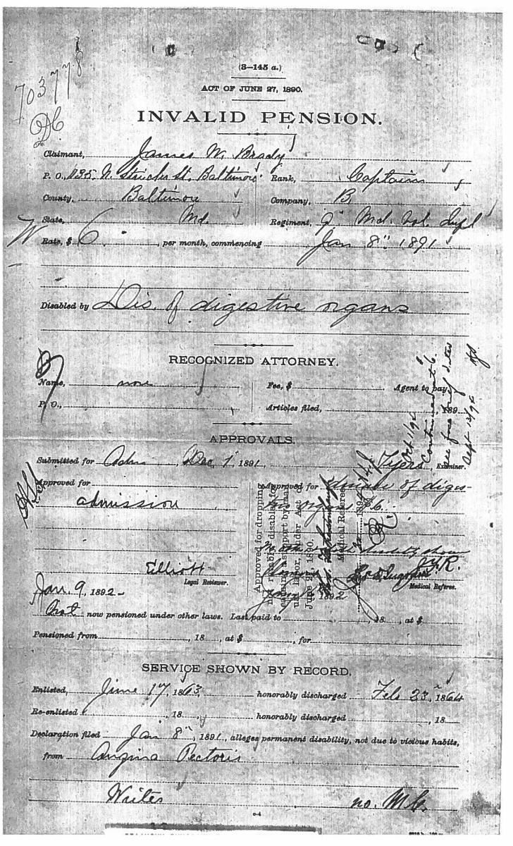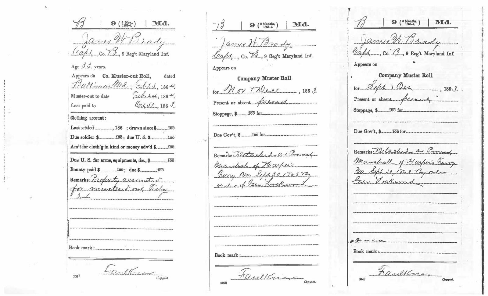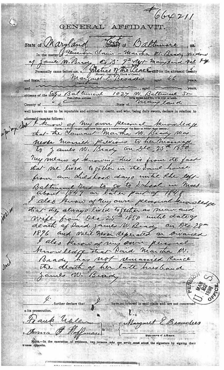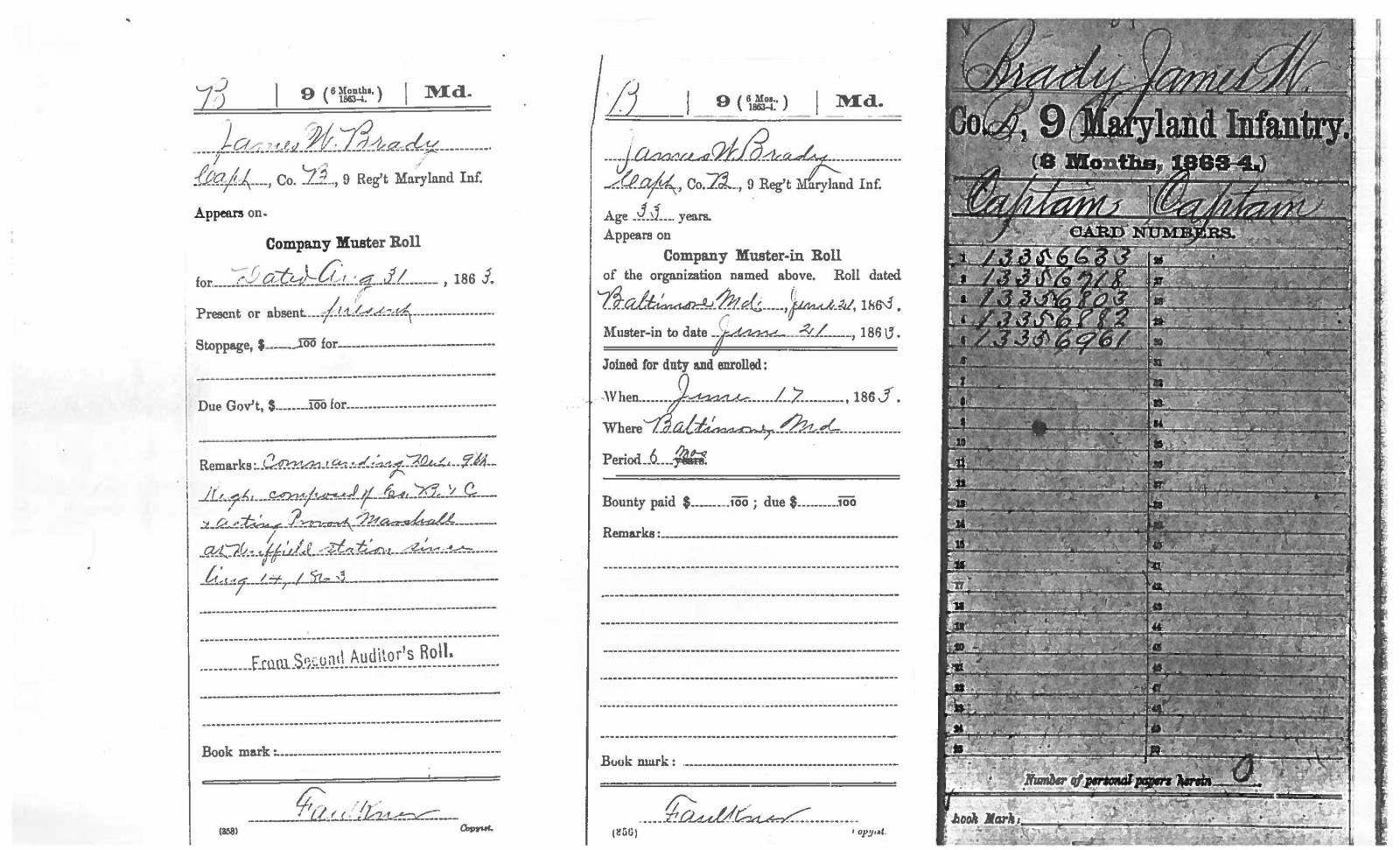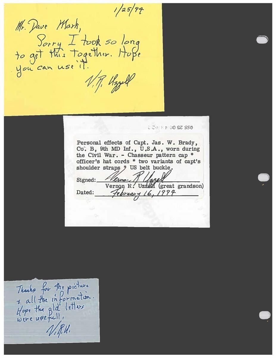 This sword was presented by his company when Capt. Brady was Provost Marshall of Harper’s Ferry. His men thought highly of him as this was expensive sword in 1863. The sword was made by Clauberg of Solingen Germany retailed by possibly Canfield & Brother in Baltimore a known Clauberg agent. Finely engraved between high relief decorated scabbard mounts on scabbard: “Presented to / Capt. Jas. W. Brady / by Company B. 9th Md Infy / Harper’s Ferry, Va / Oct. 28, 1863”. This extra fancy model 150 Staff & Field sword has eagle head quillon, drooped wing heraldic eagle in guard with pierced foliate design, pommel with high relief eagle & shield, spiral sheet silver grip. The top of pommel was mounted with large cabochon (now missing). Some may have thought it was valuable gemstone, but garnets were most typically used, this is easily restored if wanted. The solid brass scabbard has beautiful decorated mounts in high relief, top mount has panoply of arms, middle has eagle, and drag has soldier running with American flag, even the throat and blade are drag relief sculpted to match. 32” blade finely etched with patriotic motifs including fasces & liberty cap with riband: “IN HOC SIGNO VINCES”, spread wing eagle “E PLURIBUS UNUM”, fancy monogramed “US” and panoply of arms with 13 star American shield. James Brady sword was part of the late Arthur “Gil” Barrett and he displayed this as part of his Maryland collection for many years. CONDITION: very good overall, blade retains most of its original luster & finish, staining, pitting at ricasso. Brass has been cleaned and toned to light mustard patina, verdigris, gold wash remains in protected areas. (02-17010/JS). $6000-8000.