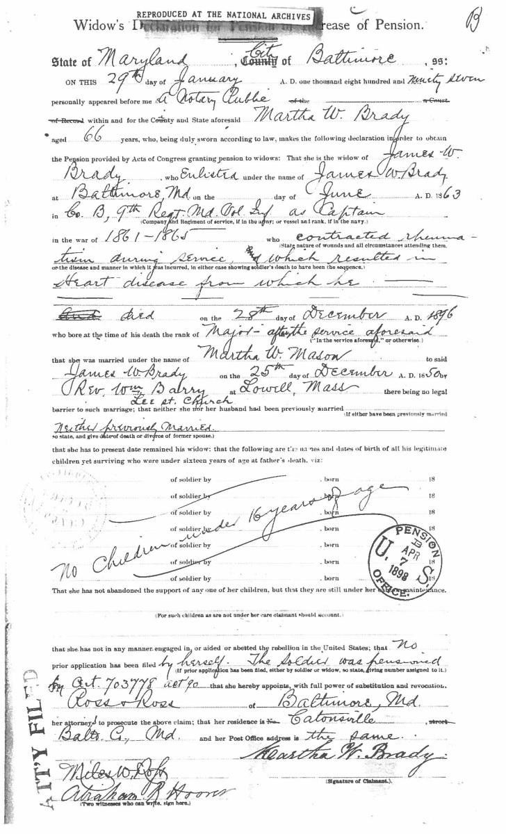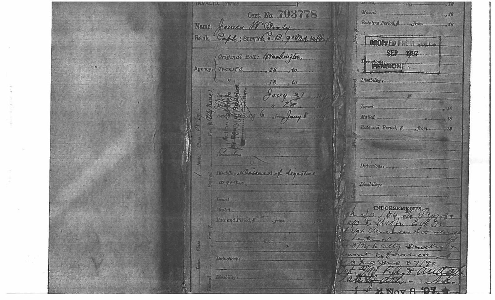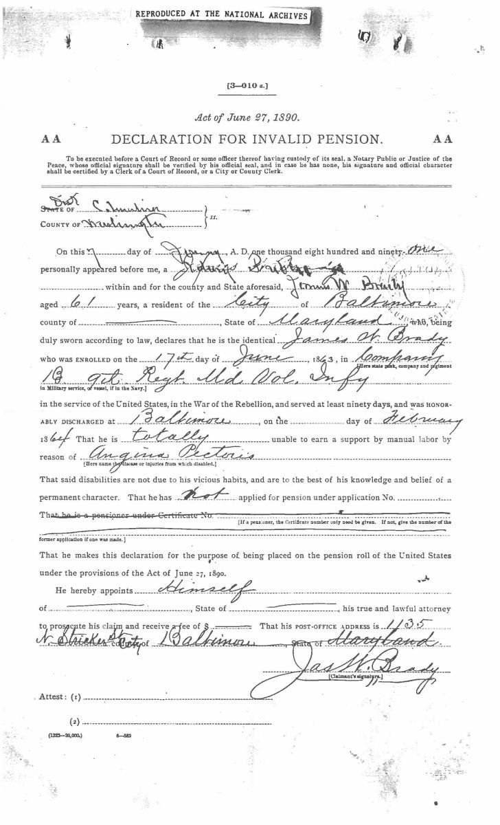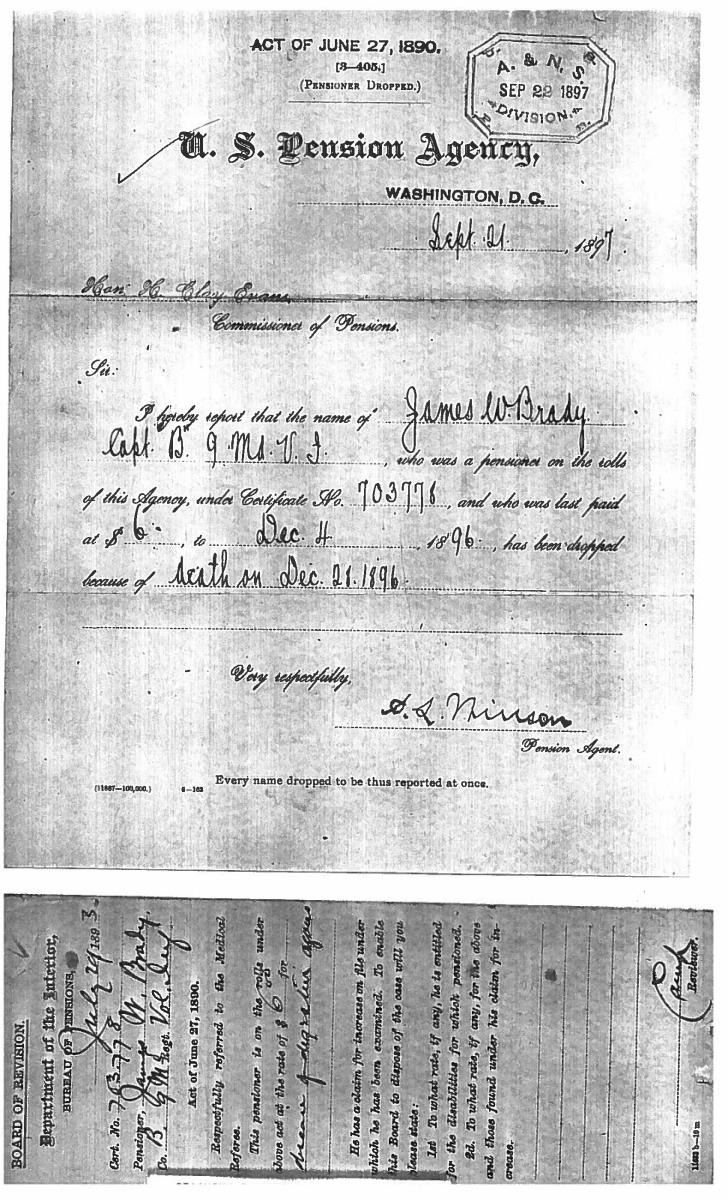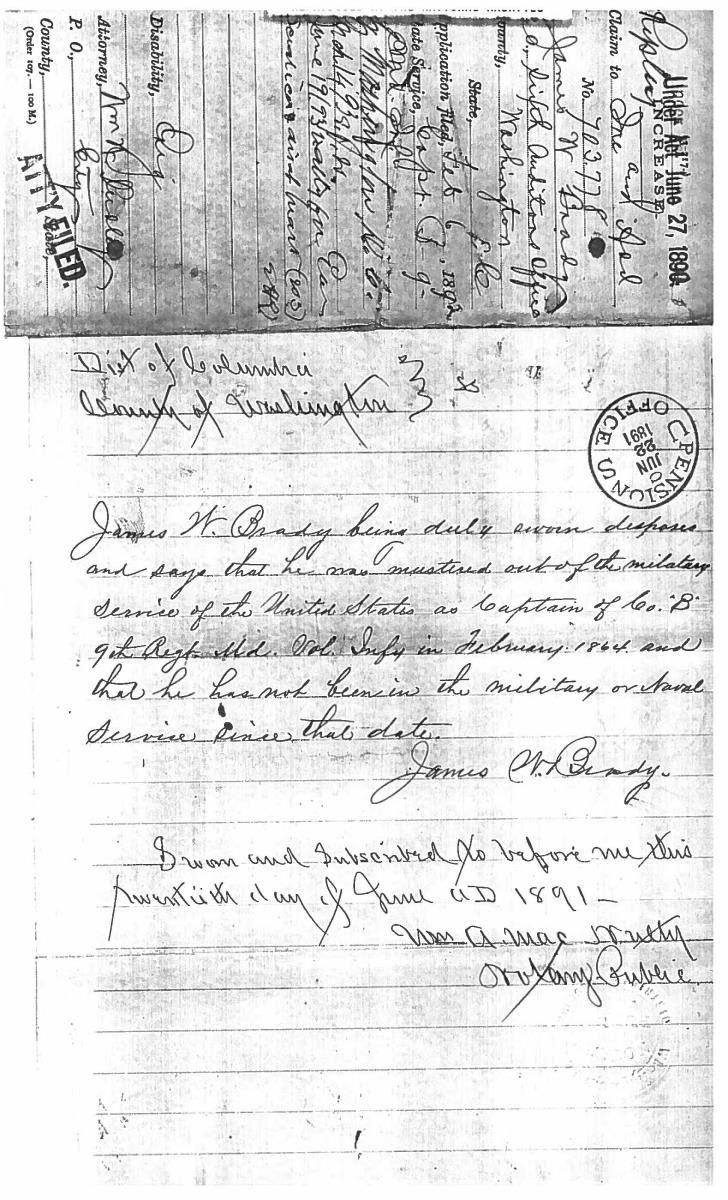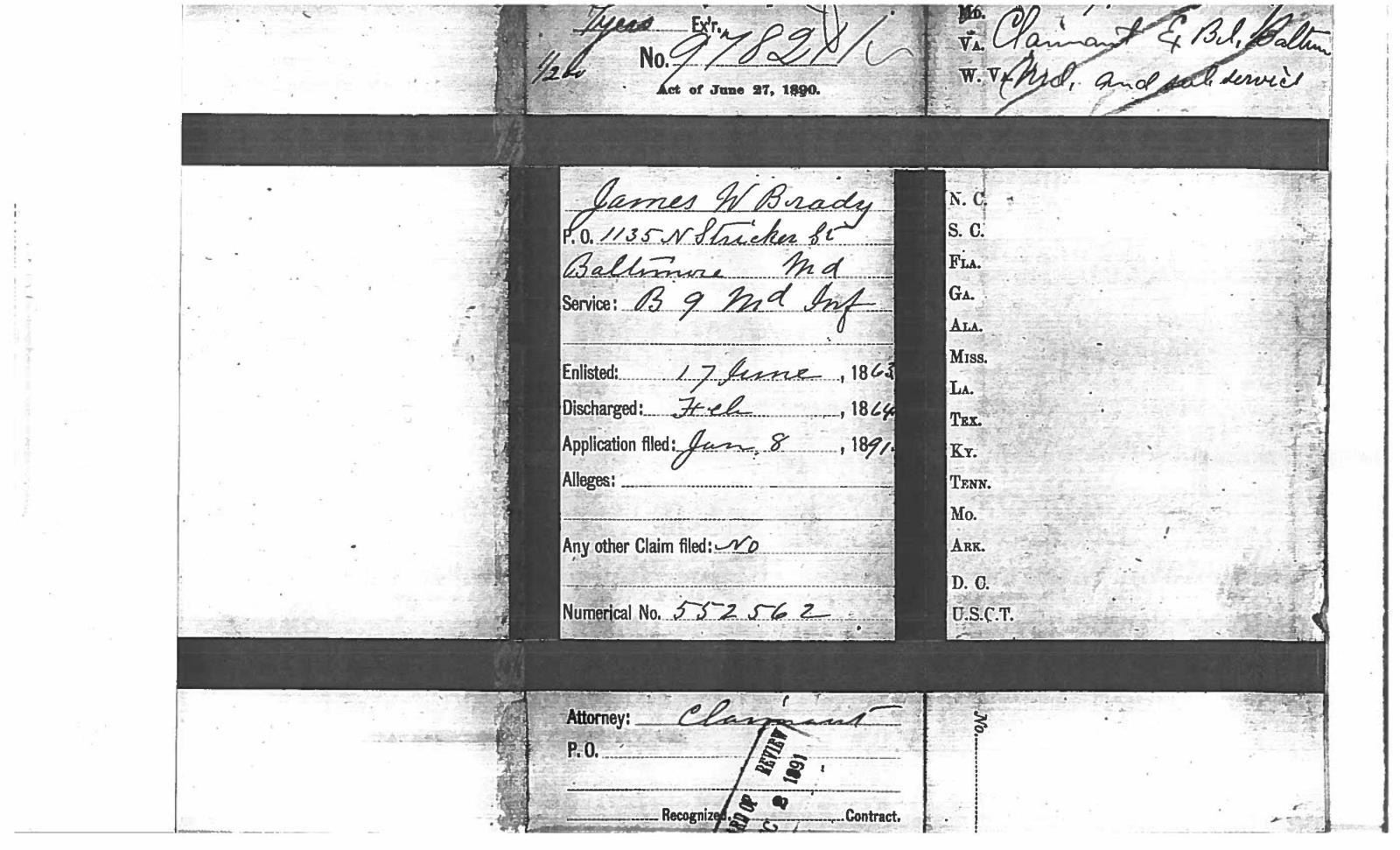 This sword was presented by his company when Capt. Brady was Provost Marshall of Harper’s Ferry. His men thought highly of him as this was expensive sword in 1863. The sword was made by Clauberg of Solingen Germany retailed by possibly Canfield & Brother in Baltimore a known Clauberg agent. Finely engraved between high relief decorated scabbard mounts on scabbard: “Presented to / Capt. Jas. W. Brady / by Company B. 9th Md Infy / Harper’s Ferry, Va / Oct. 28, 1863”. This extra fancy model 150 Staff & Field sword has eagle head quillon, drooped wing heraldic eagle in guard with pierced foliate design, pommel with high relief eagle & shield, spiral sheet silver grip. The top of pommel was mounted with large cabochon (now missing). Some may have thought it was valuable gemstone, but garnets were most typically used, this is easily restored if wanted. The solid brass scabbard has beautiful decorated mounts in high relief, top mount has panoply of arms, middle has eagle, and drag has soldier running with American flag, even the throat and blade are drag relief sculpted to match. 32” blade finely etched with patriotic motifs including fasces & liberty cap with riband: “IN HOC SIGNO VINCES”, spread wing eagle “E PLURIBUS UNUM”, fancy monogramed “US” and panoply of arms with 13 star American shield. James Brady sword was part of the late Arthur “Gil” Barrett and he displayed this as part of his Maryland collection for many years. CONDITION: very good overall, blade retains most of its original luster & finish, staining, pitting at ricasso. Brass has been cleaned and toned to light mustard patina, verdigris, gold wash remains in protected areas. (02-17010/JS). $6000-8000.