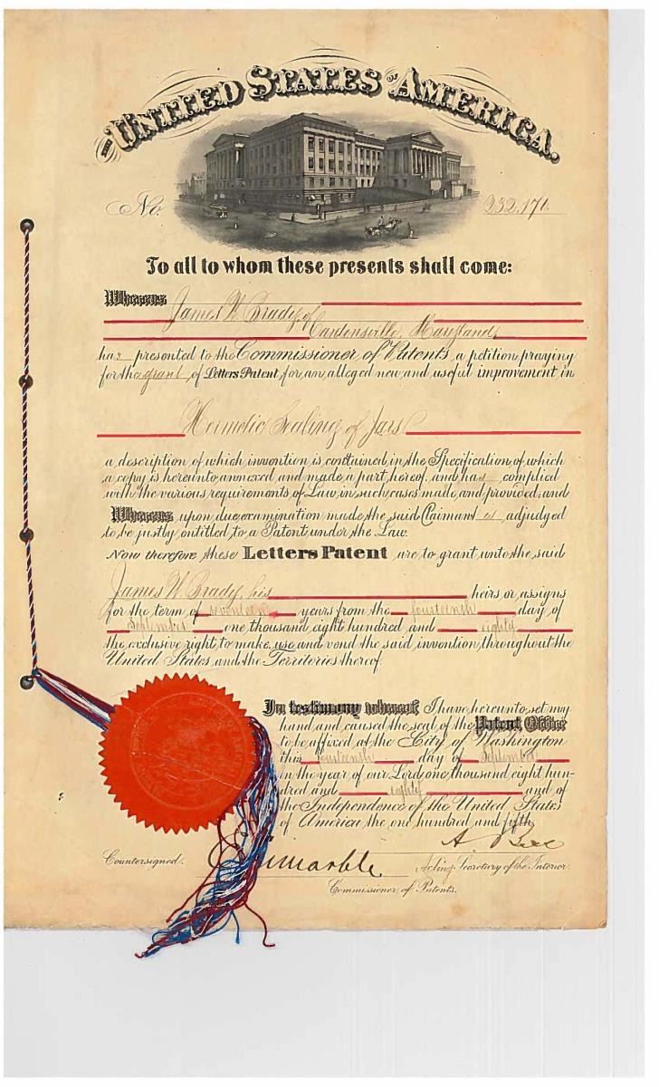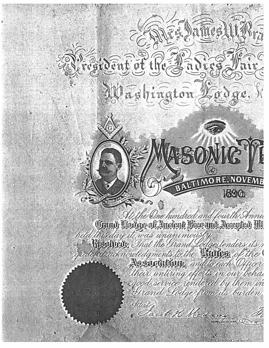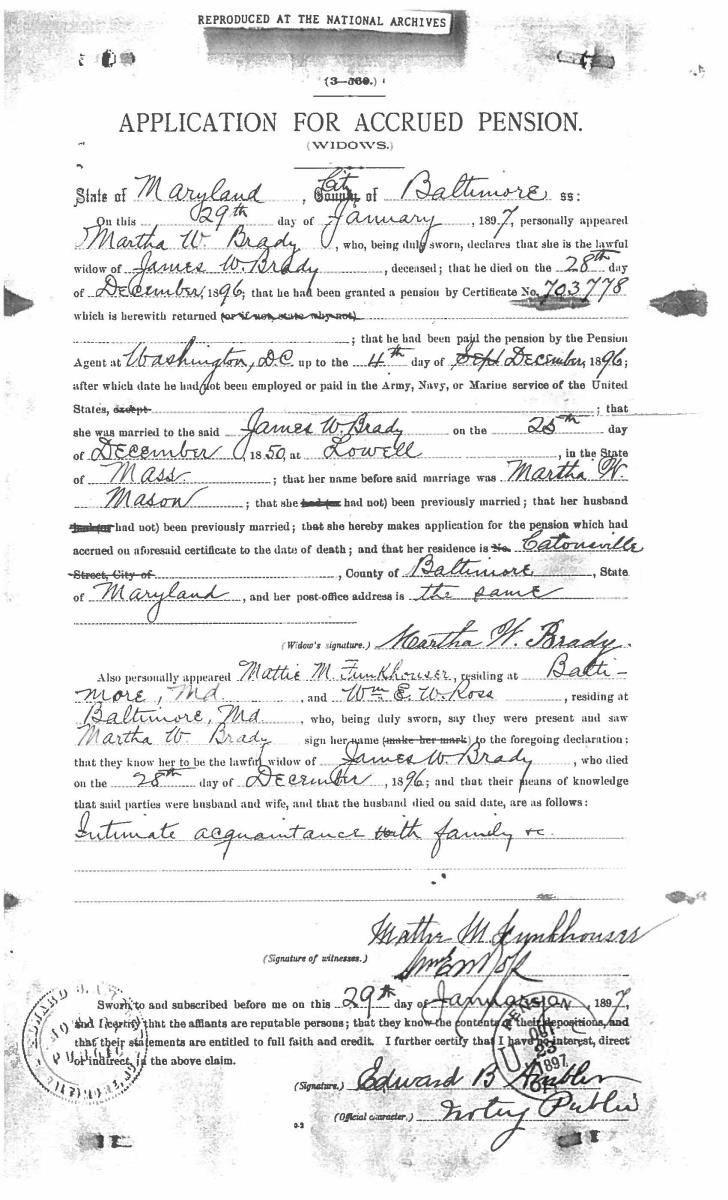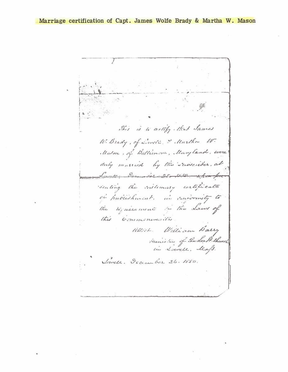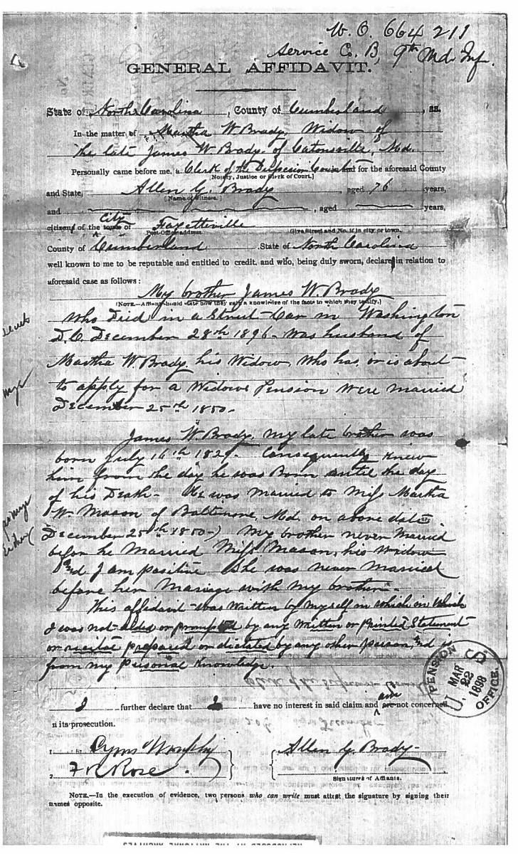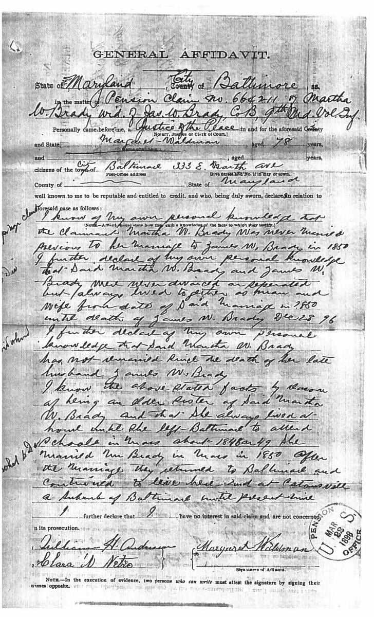 This sword was presented by his company when Capt. Brady was Provost Marshall of Harper’s Ferry. His men thought highly of him as this was expensive sword in 1863. The sword was made by Clauberg of Solingen Germany retailed by possibly Canfield & Brother in Baltimore a known Clauberg agent. Finely engraved between high relief decorated scabbard mounts on scabbard: “Presented to / Capt. Jas. W. Brady / by Company B. 9th Md Infy / Harper’s Ferry, Va / Oct. 28, 1863”. This extra fancy model 150 Staff & Field sword has eagle head quillon, drooped wing heraldic eagle in guard with pierced foliate design, pommel with high relief eagle & shield, spiral sheet silver grip. The top of pommel was mounted with large cabochon (now missing). Some may have thought it was valuable gemstone, but garnets were most typically used, this is easily restored if wanted. The solid brass scabbard has beautiful decorated mounts in high relief, top mount has panoply of arms, middle has eagle, and drag has soldier running with American flag, even the throat and blade are drag relief sculpted to match. 32” blade finely etched with patriotic motifs including fasces & liberty cap with riband: “IN HOC SIGNO VINCES”, spread wing eagle “E PLURIBUS UNUM”, fancy monogramed “US” and panoply of arms with 13 star American shield. James Brady sword was part of the late Arthur “Gil” Barrett and he displayed this as part of his Maryland collection for many years. CONDITION: very good overall, blade retains most of its original luster & finish, staining, pitting at ricasso. Brass has been cleaned and toned to light mustard patina, verdigris, gold wash remains in protected areas. (02-17010/JS). $6000-8000.