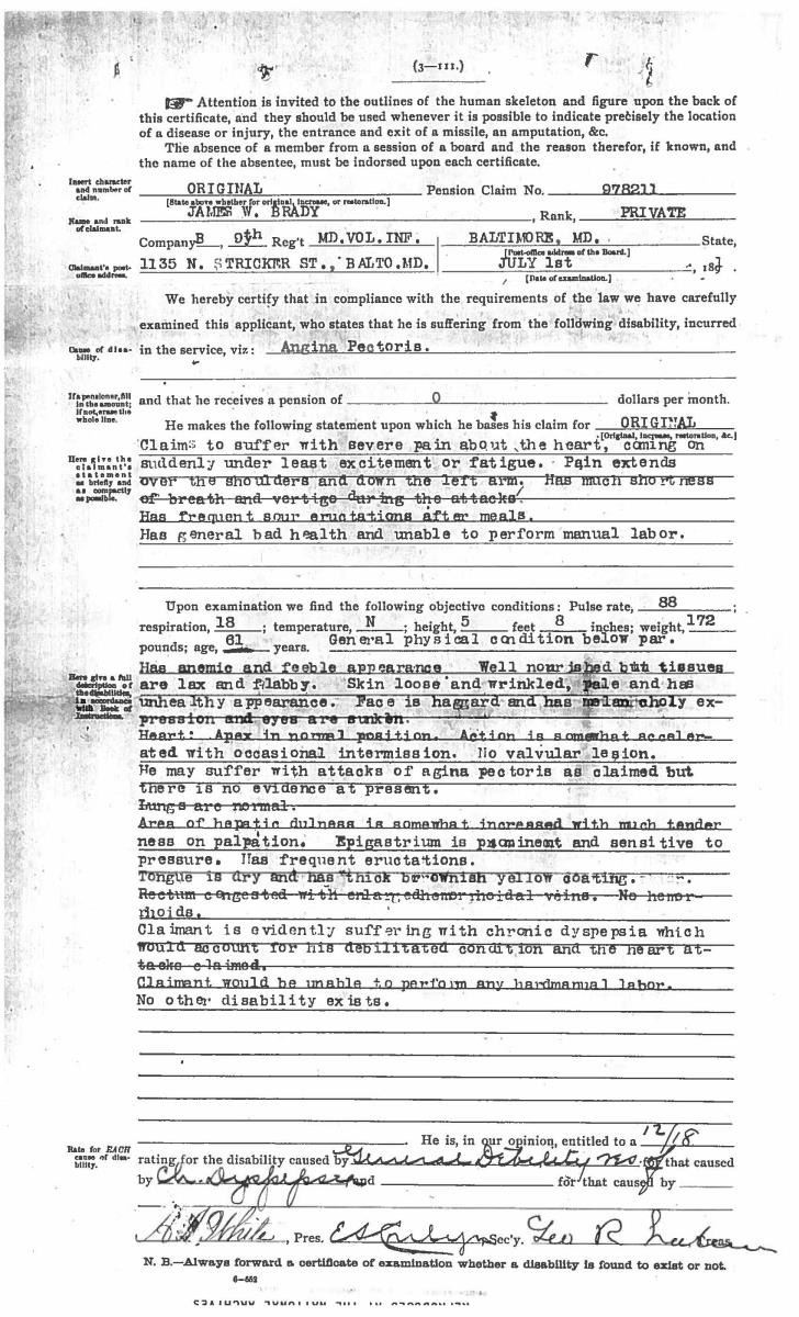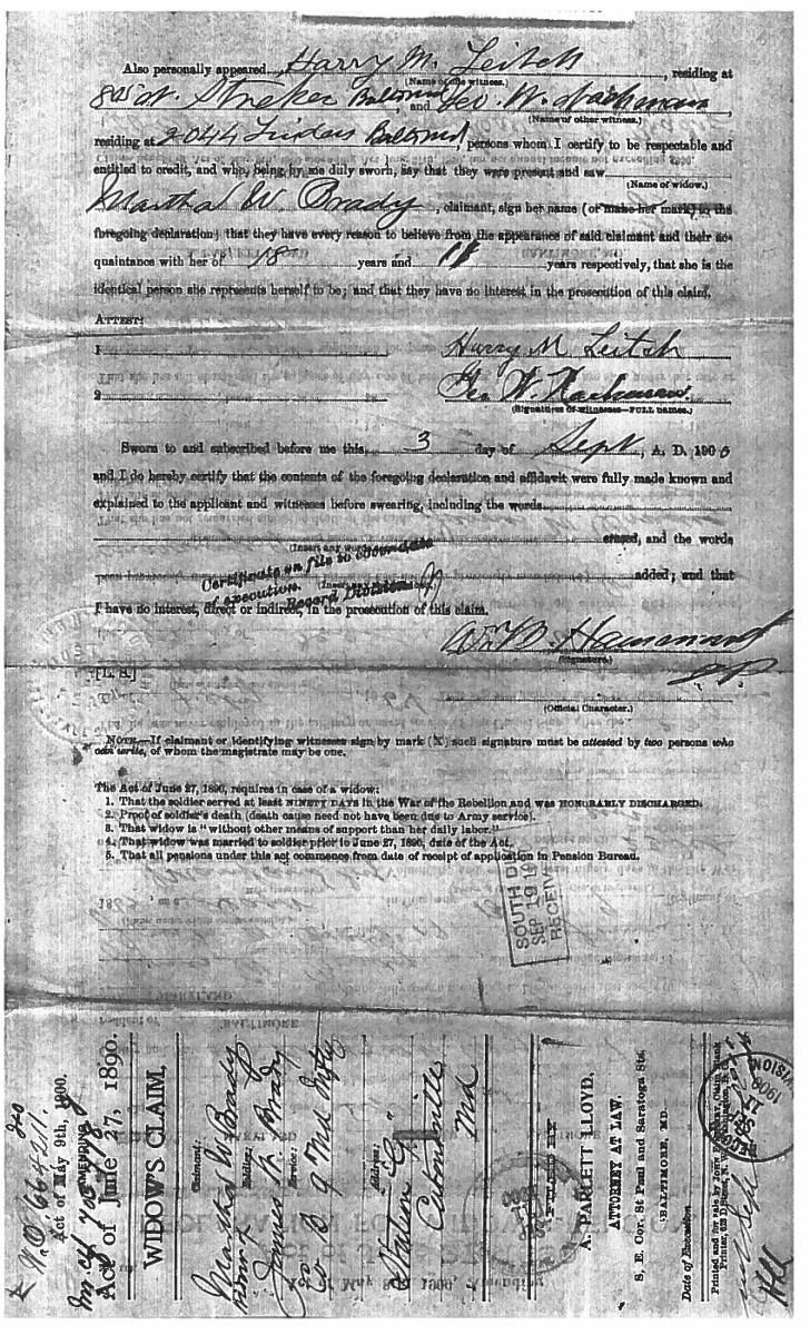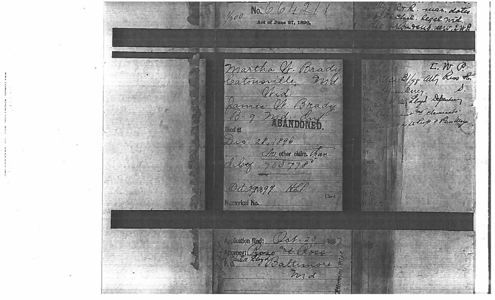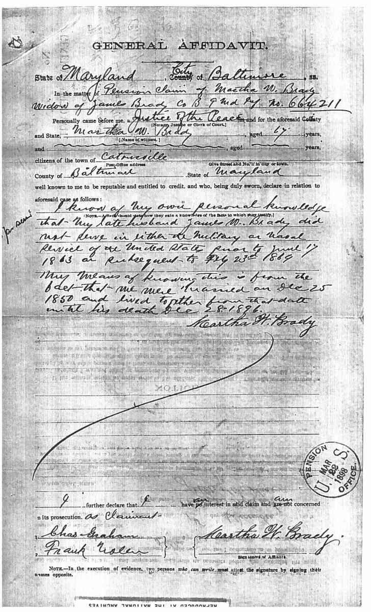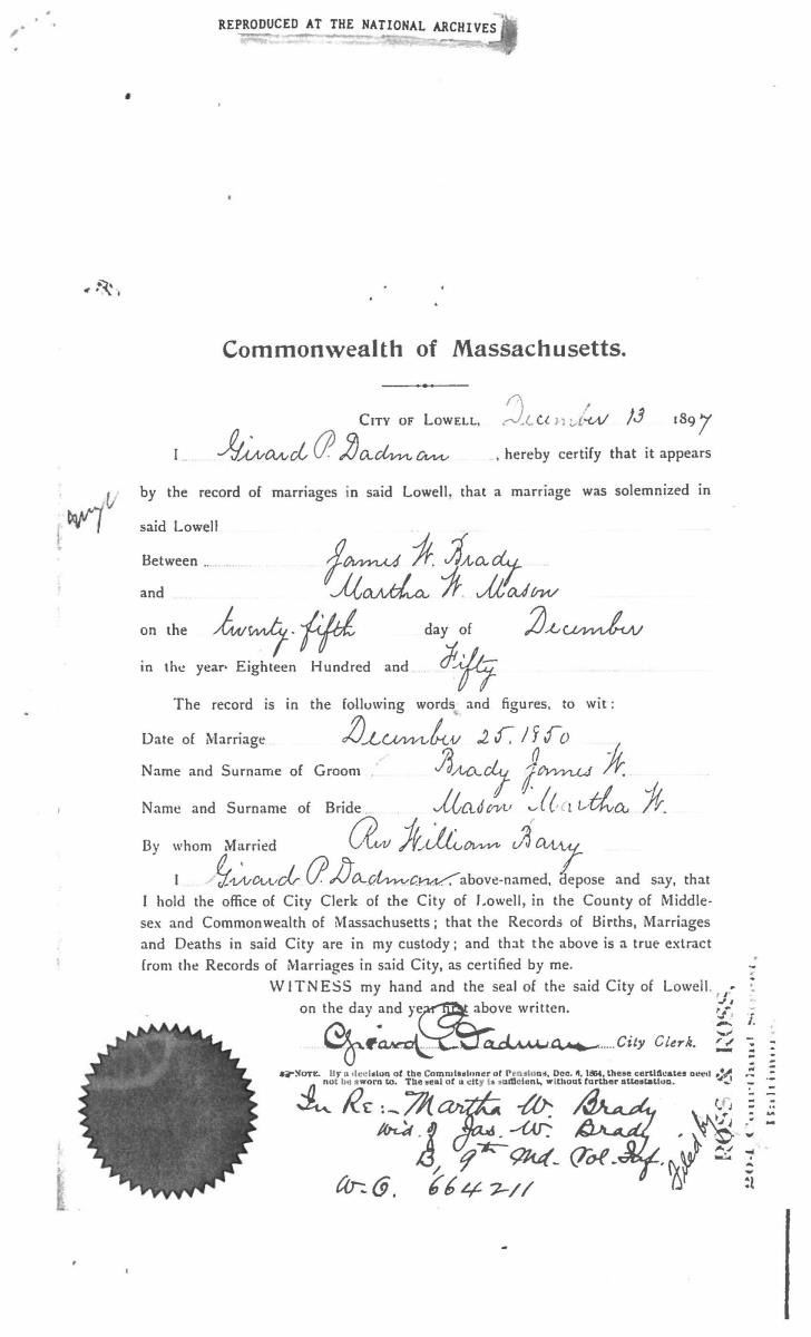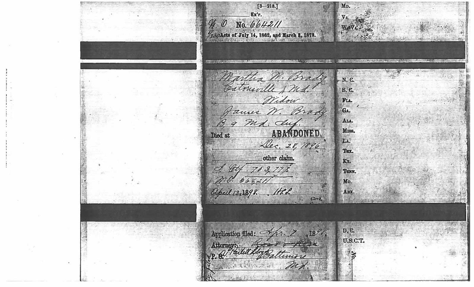 This sword was presented by his company when Capt. Brady was Provost Marshall of Harper’s Ferry. His men thought highly of him as this was expensive sword in 1863. The sword was made by Clauberg of Solingen Germany retailed by possibly Canfield & Brother in Baltimore a known Clauberg agent. Finely engraved between high relief decorated scabbard mounts on scabbard: “Presented to / Capt. Jas. W. Brady / by Company B. 9th Md Infy / Harper’s Ferry, Va / Oct. 28, 1863”. This extra fancy model 150 Staff & Field sword has eagle head quillon, drooped wing heraldic eagle in guard with pierced foliate design, pommel with high relief eagle & shield, spiral sheet silver grip. The top of pommel was mounted with large cabochon (now missing). Some may have thought it was valuable gemstone, but garnets were most typically used, this is easily restored if wanted. The solid brass scabbard has beautiful decorated mounts in high relief, top mount has panoply of arms, middle has eagle, and drag has soldier running with American flag, even the throat and blade are drag relief sculpted to match. 32” blade finely etched with patriotic motifs including fasces & liberty cap with riband: “IN HOC SIGNO VINCES”, spread wing eagle “E PLURIBUS UNUM”, fancy monogramed “US” and panoply of arms with 13 star American shield. James Brady sword was part of the late Arthur “Gil” Barrett and he displayed this as part of his Maryland collection for many years. CONDITION: very good overall, blade retains most of its original luster & finish, staining, pitting at ricasso. Brass has been cleaned and toned to light mustard patina, verdigris, gold wash remains in protected areas. (02-17010/JS). $6000-8000.