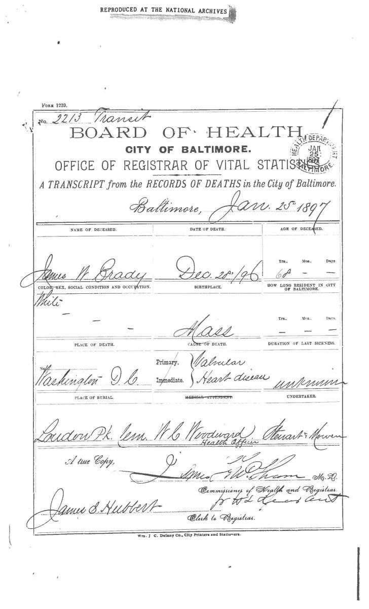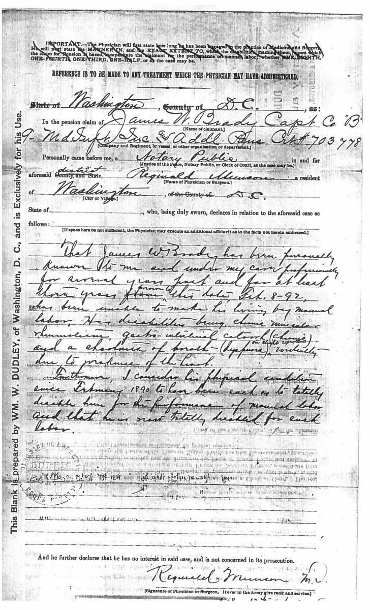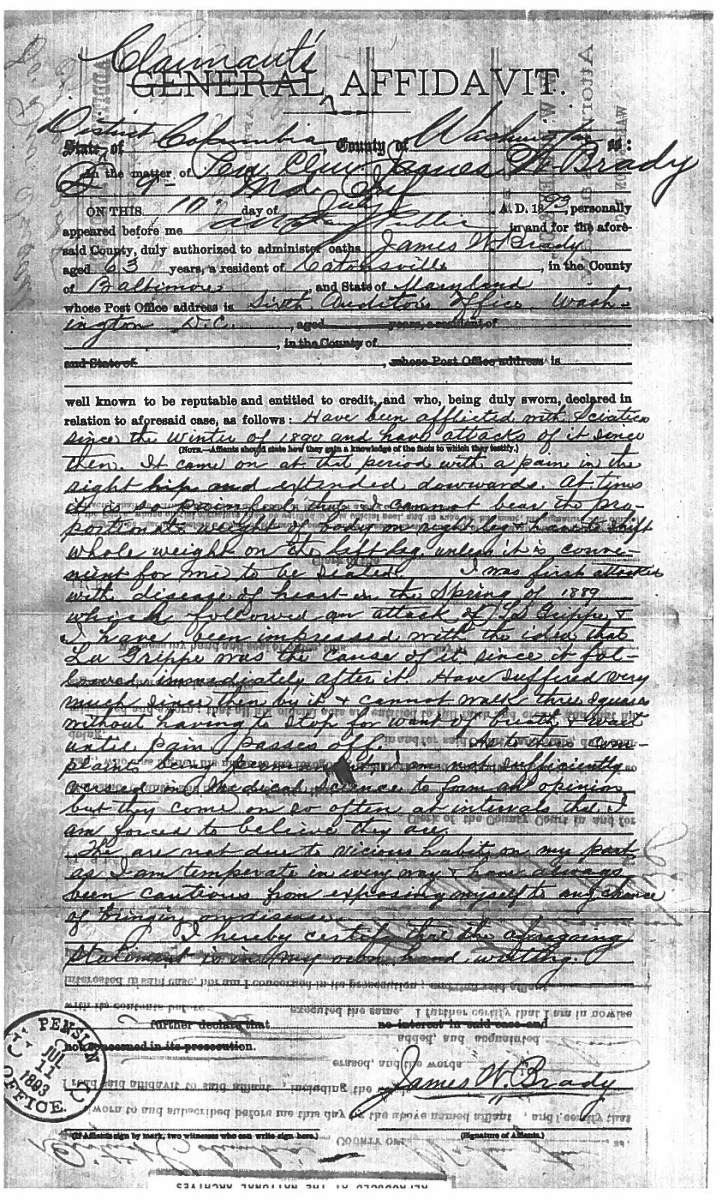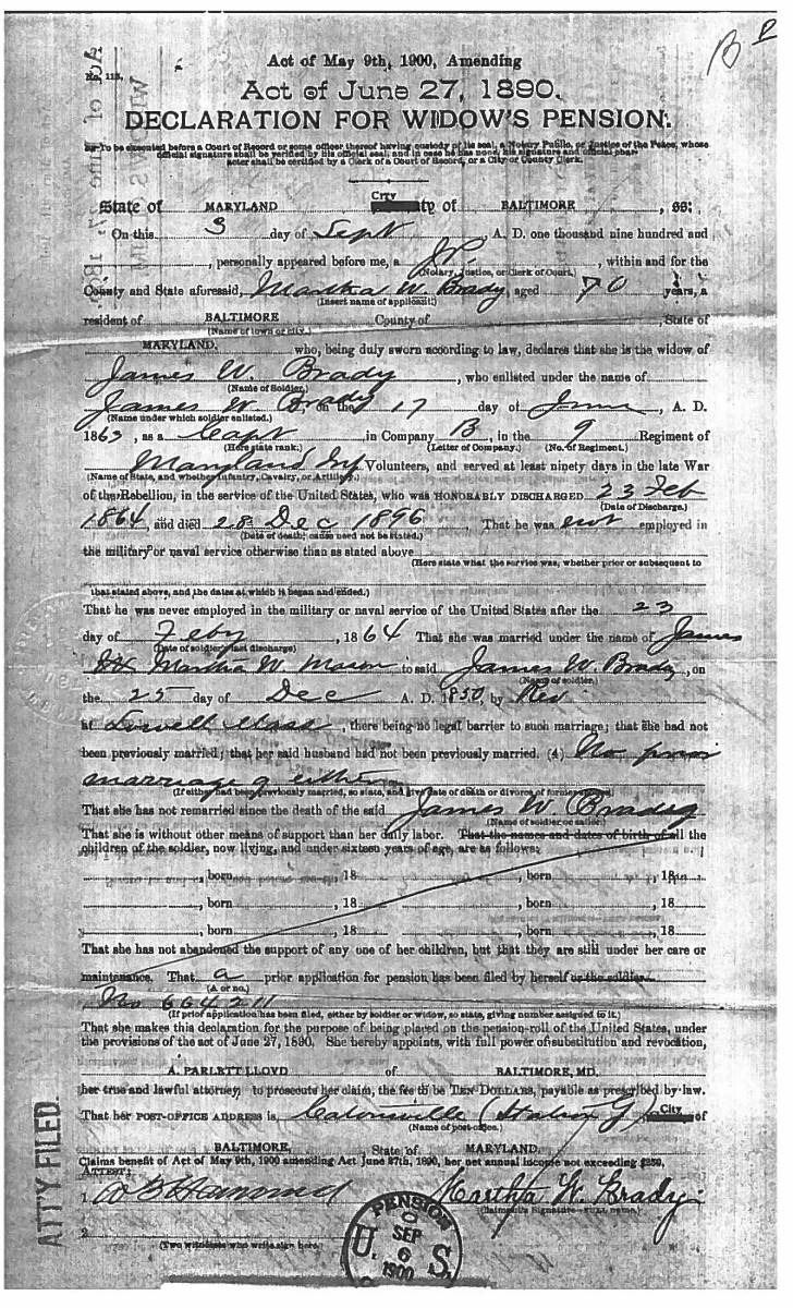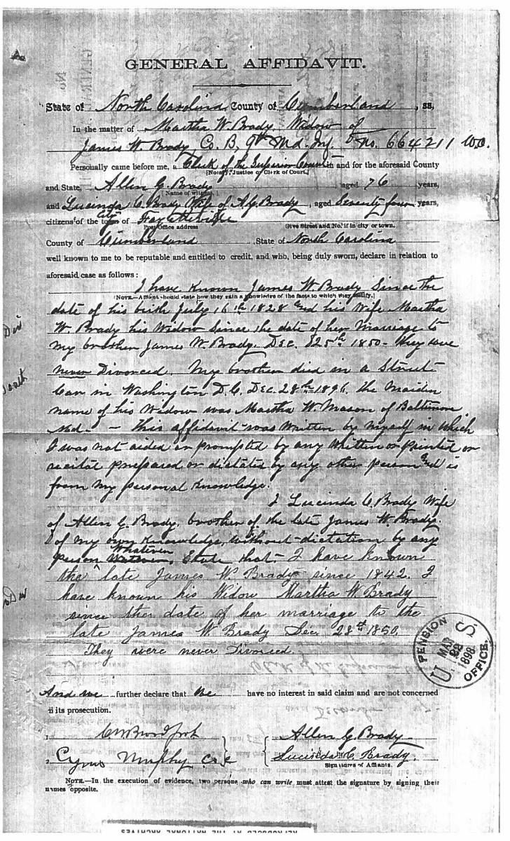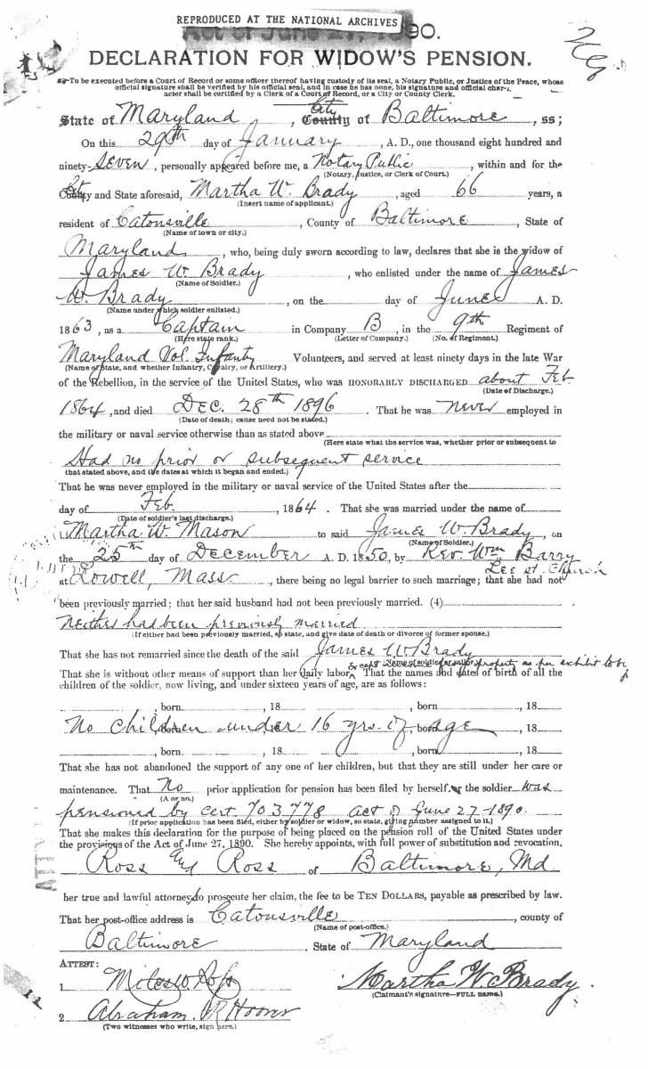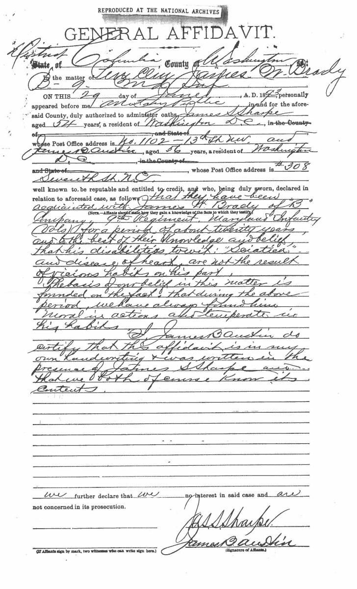 This sword was presented by his company when Capt. Brady was Provost Marshall of Harper’s Ferry. His men thought highly of him as this was expensive sword in 1863. The sword was made by Clauberg of Solingen Germany retailed by possibly Canfield & Brother in Baltimore a known Clauberg agent. Finely engraved between high relief decorated scabbard mounts on scabbard: “Presented to / Capt. Jas. W. Brady / by Company B. 9th Md Infy / Harper’s Ferry, Va / Oct. 28, 1863”. This extra fancy model 150 Staff & Field sword has eagle head quillon, drooped wing heraldic eagle in guard with pierced foliate design, pommel with high relief eagle & shield, spiral sheet silver grip. The top of pommel was mounted with large cabochon (now missing). Some may have thought it was valuable gemstone, but garnets were most typically used, this is easily restored if wanted. The solid brass scabbard has beautiful decorated mounts in high relief, top mount has panoply of arms, middle has eagle, and drag has soldier running with American flag, even the throat and blade are drag relief sculpted to match. 32” blade finely etched with patriotic motifs including fasces & liberty cap with riband: “IN HOC SIGNO VINCES”, spread wing eagle “E PLURIBUS UNUM”, fancy monogramed “US” and panoply of arms with 13 star American shield. James Brady sword was part of the late Arthur “Gil” Barrett and he displayed this as part of his Maryland collection for many years. CONDITION: very good overall, blade retains most of its original luster & finish, staining, pitting at ricasso. Brass has been cleaned and toned to light mustard patina, verdigris, gold wash remains in protected areas. (02-17010/JS). $6000-8000.