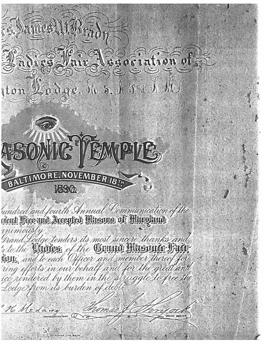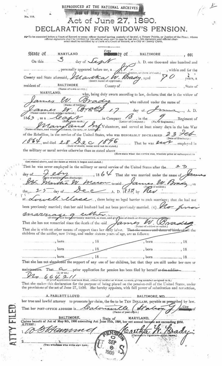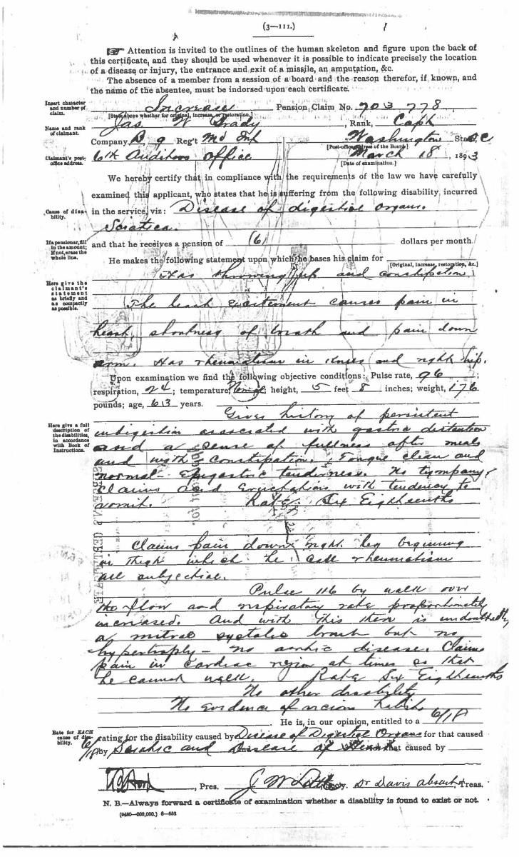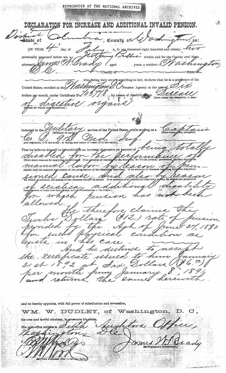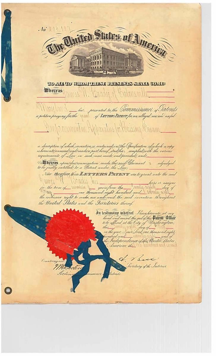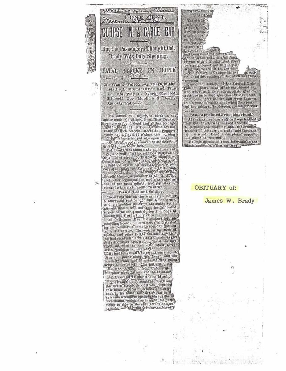 This sword was presented by his company when Capt. Brady was Provost Marshall of Harper’s Ferry. His men thought highly of him as this was expensive sword in 1863. The sword was made by Clauberg of Solingen Germany retailed by possibly Canfield & Brother in Baltimore a known Clauberg agent. Finely engraved between high relief decorated scabbard mounts on scabbard: “Presented to / Capt. Jas. W. Brady / by Company B. 9th Md Infy / Harper’s Ferry, Va / Oct. 28, 1863”. This extra fancy model 150 Staff & Field sword has eagle head quillon, drooped wing heraldic eagle in guard with pierced foliate design, pommel with high relief eagle & shield, spiral sheet silver grip. The top of pommel was mounted with large cabochon (now missing). Some may have thought it was valuable gemstone, but garnets were most typically used, this is easily restored if wanted. The solid brass scabbard has beautiful decorated mounts in high relief, top mount has panoply of arms, middle has eagle, and drag has soldier running with American flag, even the throat and blade are drag relief sculpted to match. 32” blade finely etched with patriotic motifs including fasces & liberty cap with riband: “IN HOC SIGNO VINCES”, spread wing eagle “E PLURIBUS UNUM”, fancy monogramed “US” and panoply of arms with 13 star American shield. James Brady sword was part of the late Arthur “Gil” Barrett and he displayed this as part of his Maryland collection for many years. CONDITION: very good overall, blade retains most of its original luster & finish, staining, pitting at ricasso. Brass has been cleaned and toned to light mustard patina, verdigris, gold wash remains in protected areas. (02-17010/JS). $6000-8000.