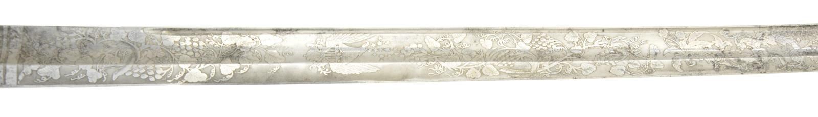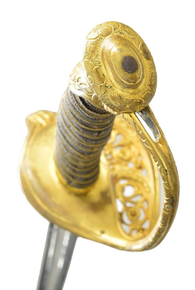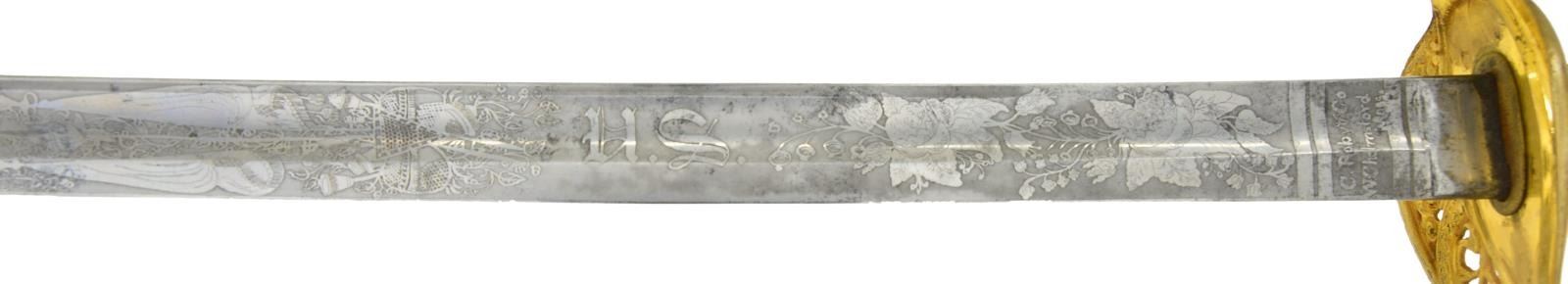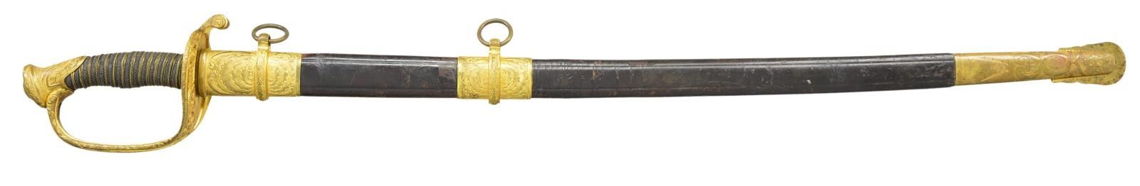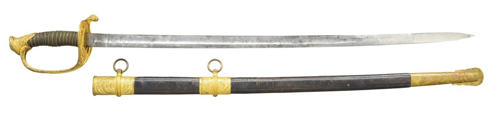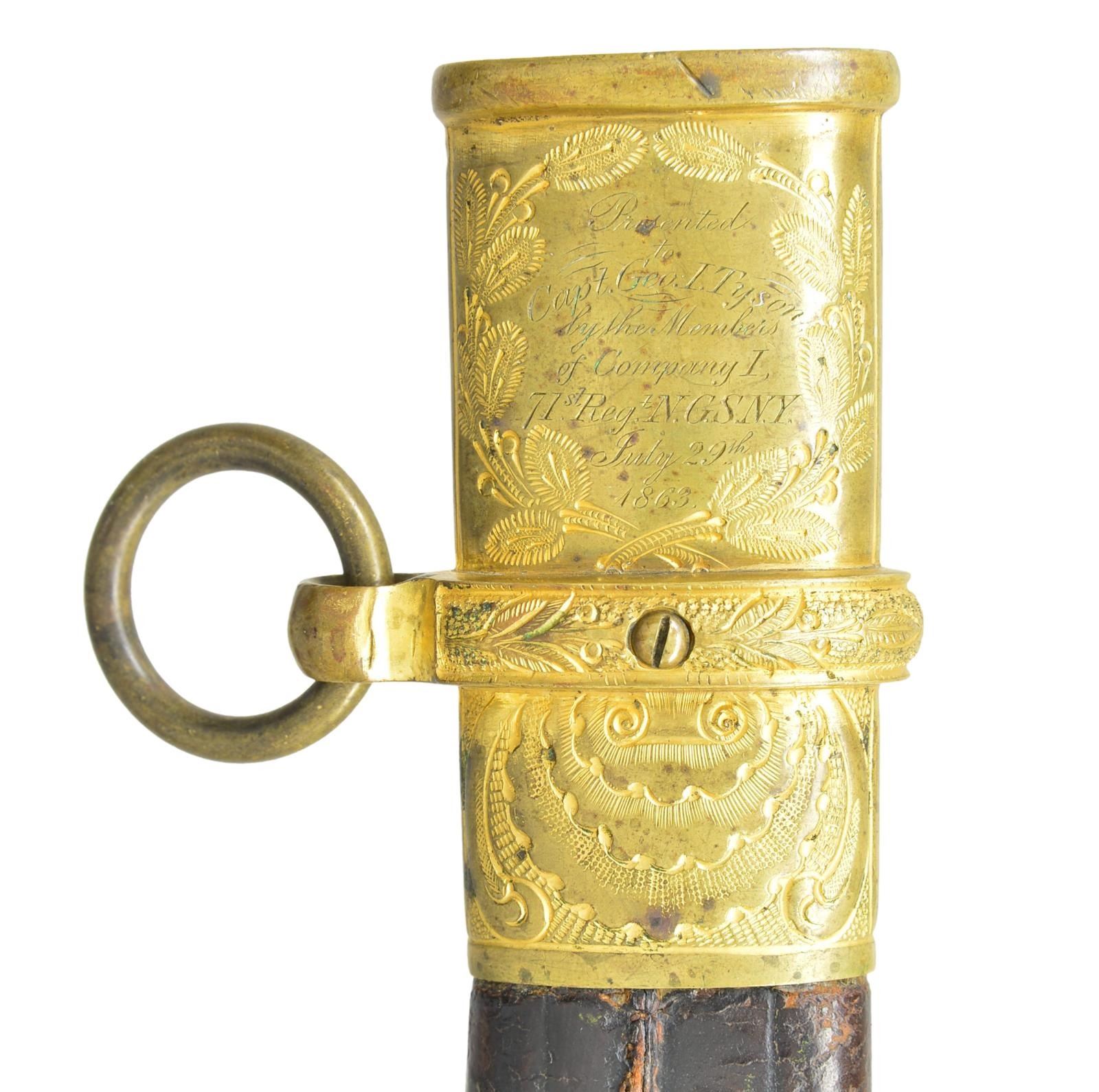 MODEL 1850 SWORD, CAPT. GEORGE TYSON, 71ST NEW YORK VOLUNTEERS. Elaborate model 1850 foot officer’s sword, 32” deeply etched patriotic panels, “1862” dated flag, “C. Roby & Co / W. Chelmsford / Mass” etched maker. This is about a high a grade you will find in this company grade sword. There is additional engraving and chasing on guard, knucklebow, and pommel, including a patriotic shield with stippled background. Scabbard mounts are relief engraved Including patriotic motifs on drag. Throat & middle mount unusually engraved on both sides with fine jeweler inscription on throat “Presented / to Capt. Geo. I. Tyson / by the members / of company I / 71st NGSNY / July 29th / 1863”. Hilt And scabbard mounts are heavily gold plated, shark skin grip with fancy triple strand gold plated brass wire.