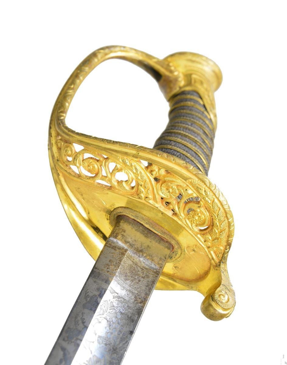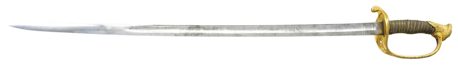 CONDITION: very fine overall, blade retains virtually all its original polish and luster with light staining. leather scabbard body is sound retaining most of its polished finish, seam unsewn not affecting aesthetic. brass hilt, pommel, and scabbard mounts retain much of their original gold wash. All in all a beautiful sword that was very expensive when it was purchased. (02-19181/JS). $3,000-5,000.